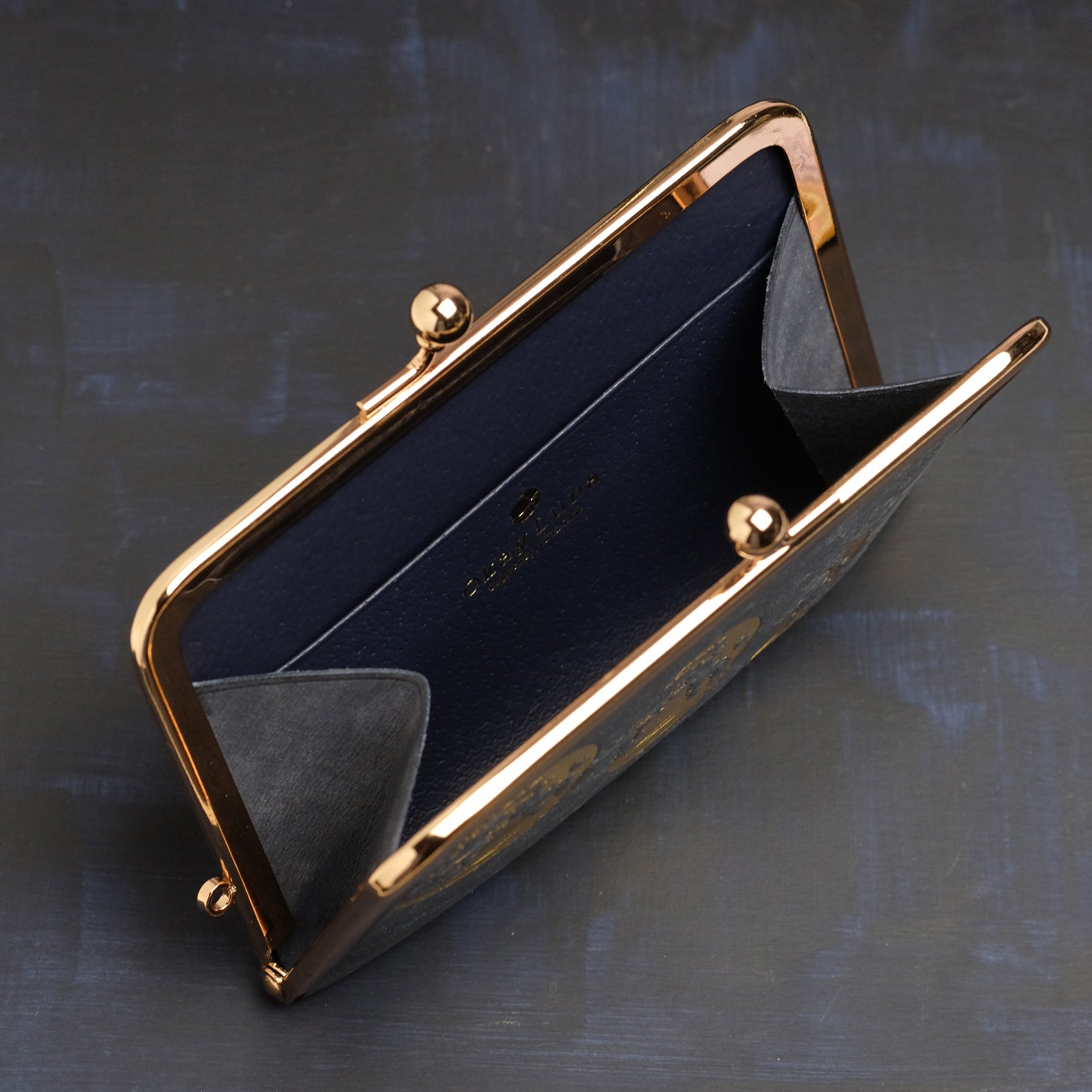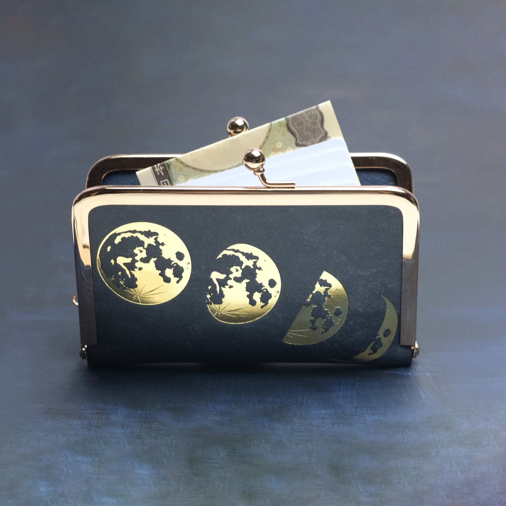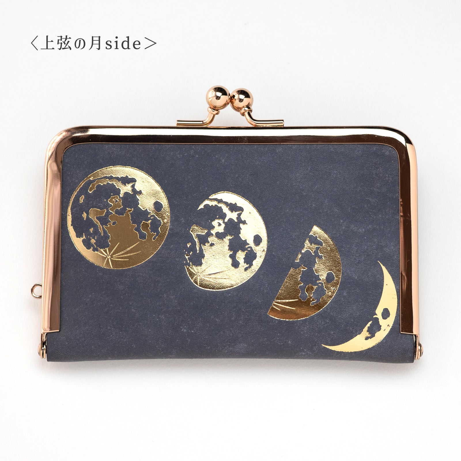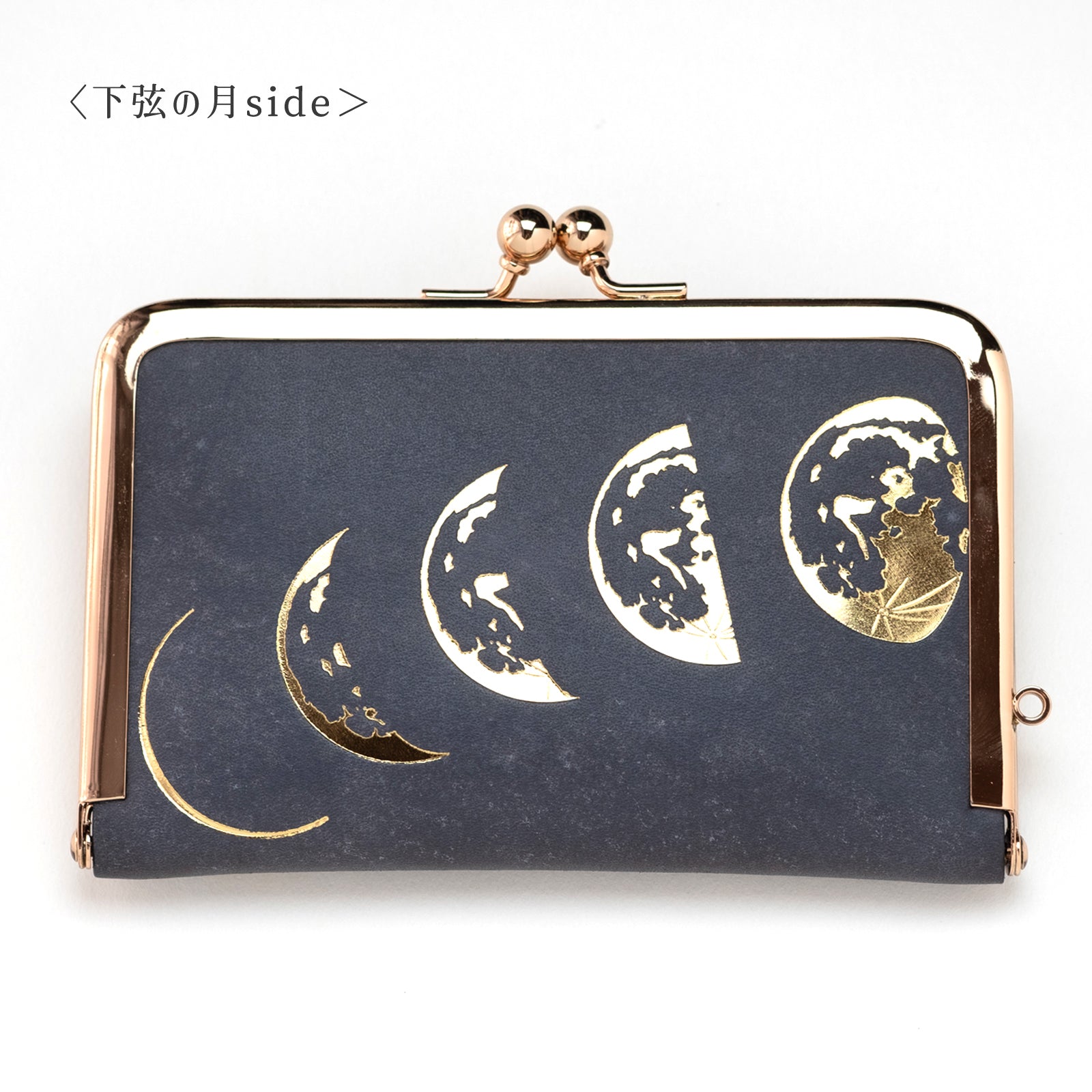 夜空色のイタリアンレザーに、月の満ち欠けのデザインを箔押ししたがま口タイプのカードケースです。