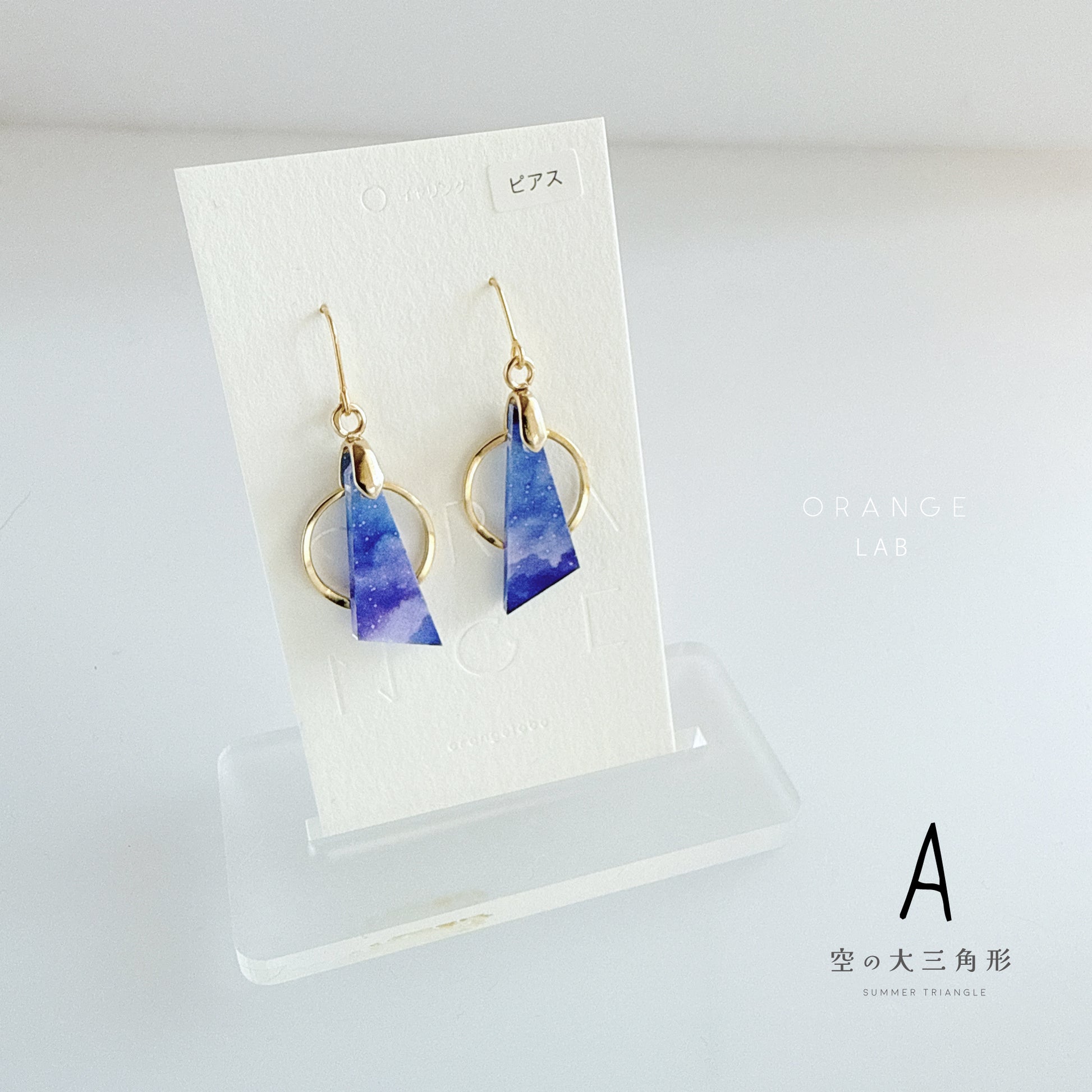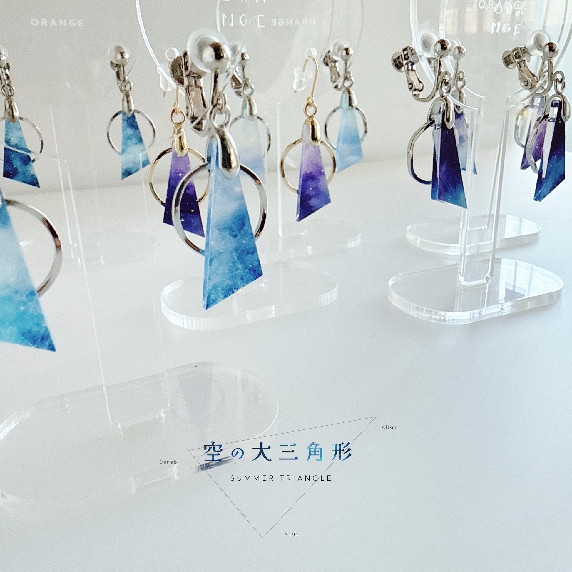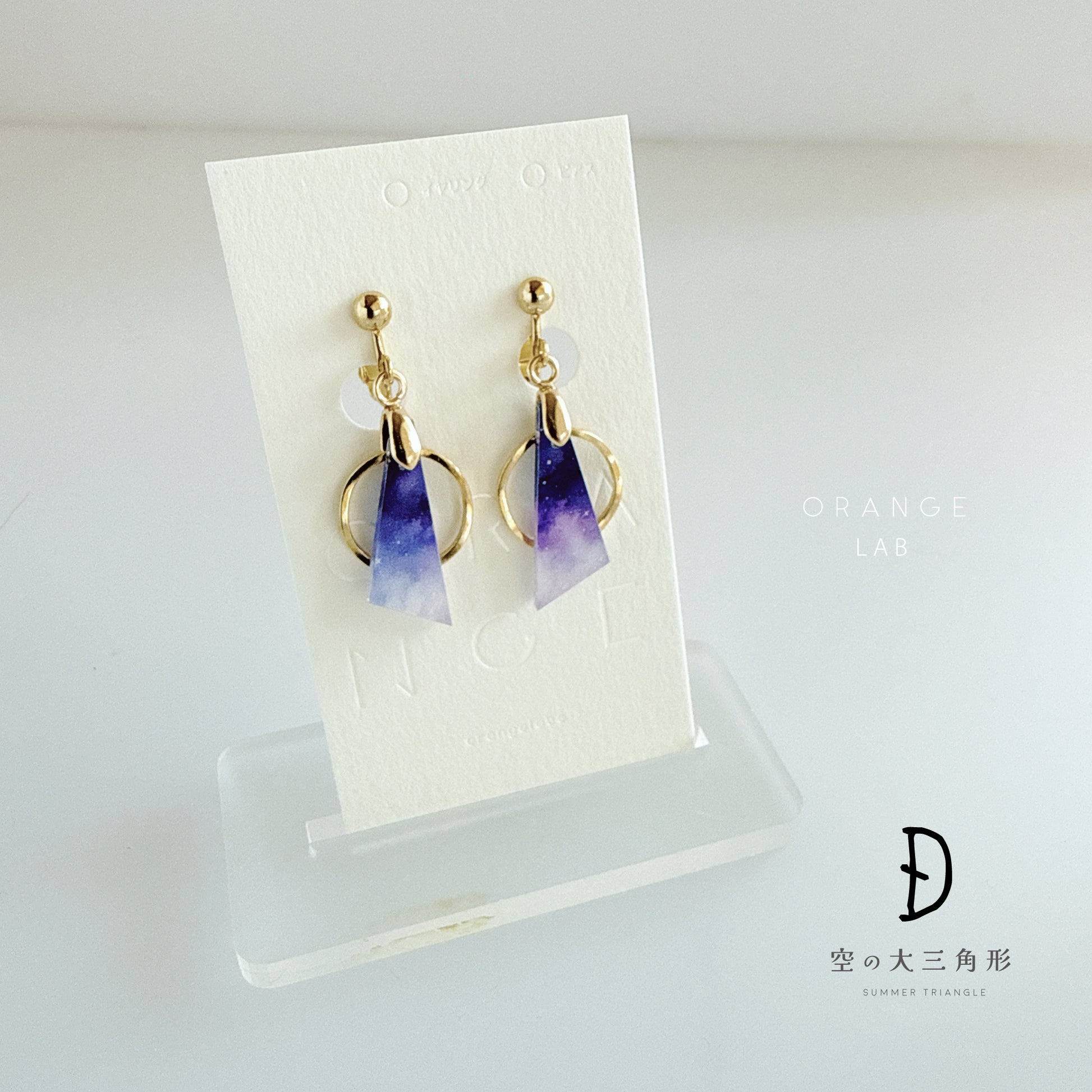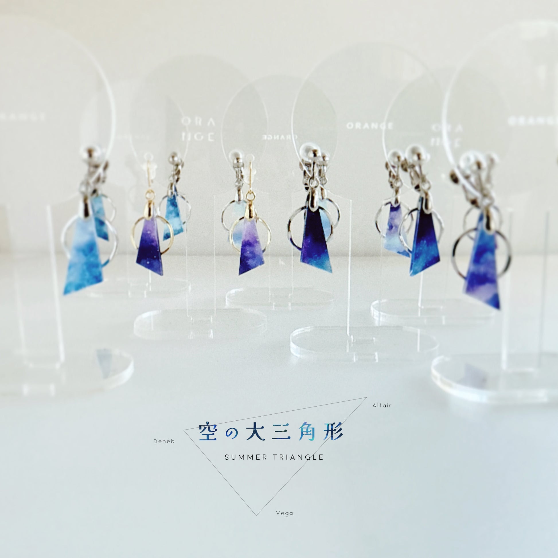 夜空に見える、こと座のベガ、わし座のアルタイル、はくちょう座のデネブの3つの1等星の大三角を耳飾りにしました。
