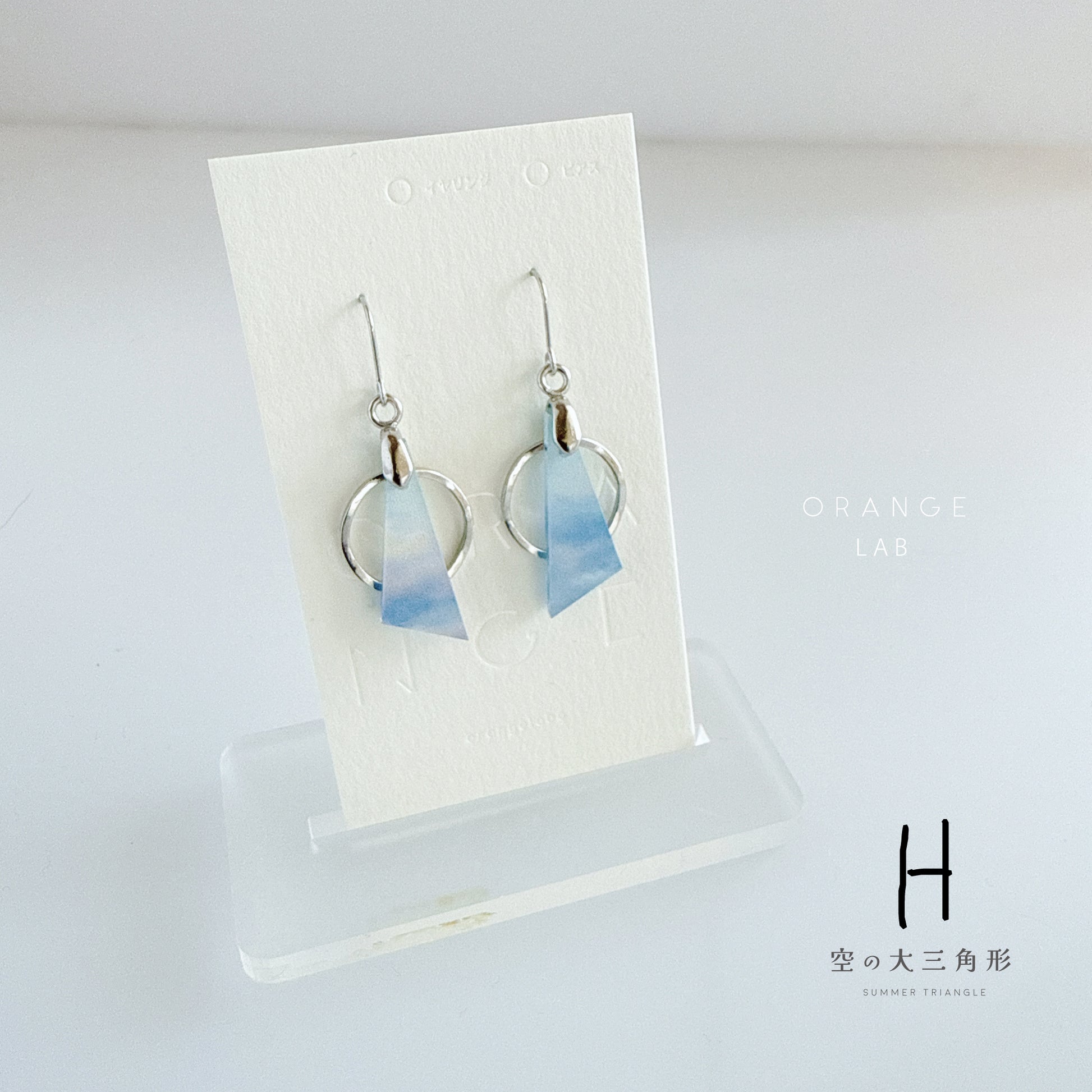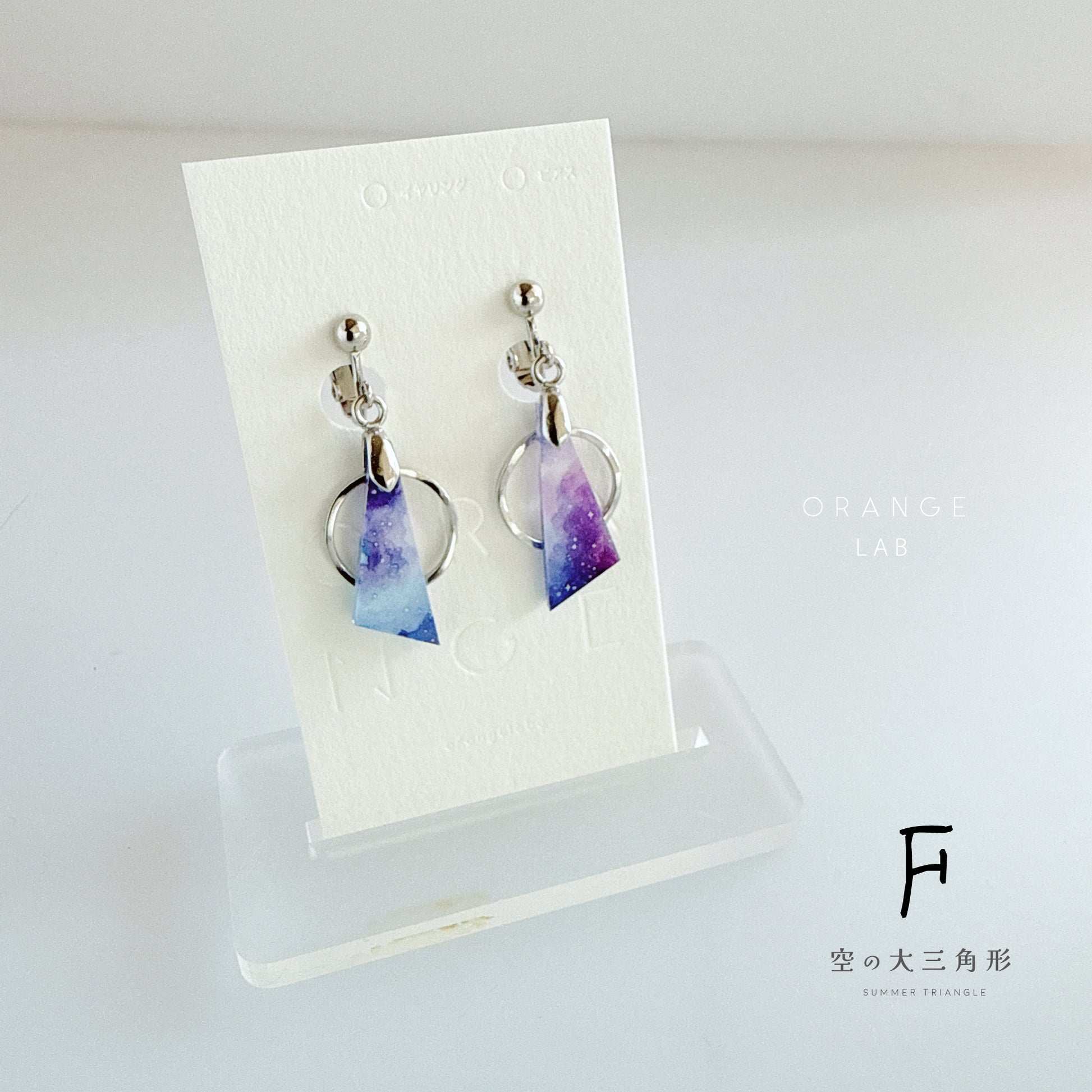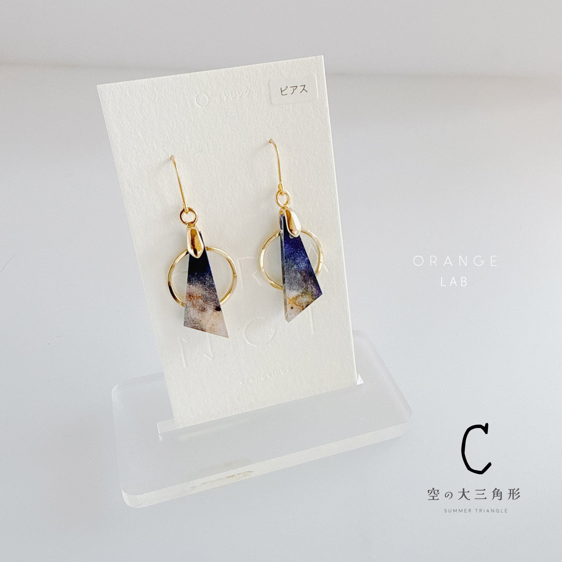 夜空に見える、こと座のベガ、わし座のアルタイル、はくちょう座のデネブの3つの1等星の大三角を耳飾りにしました。