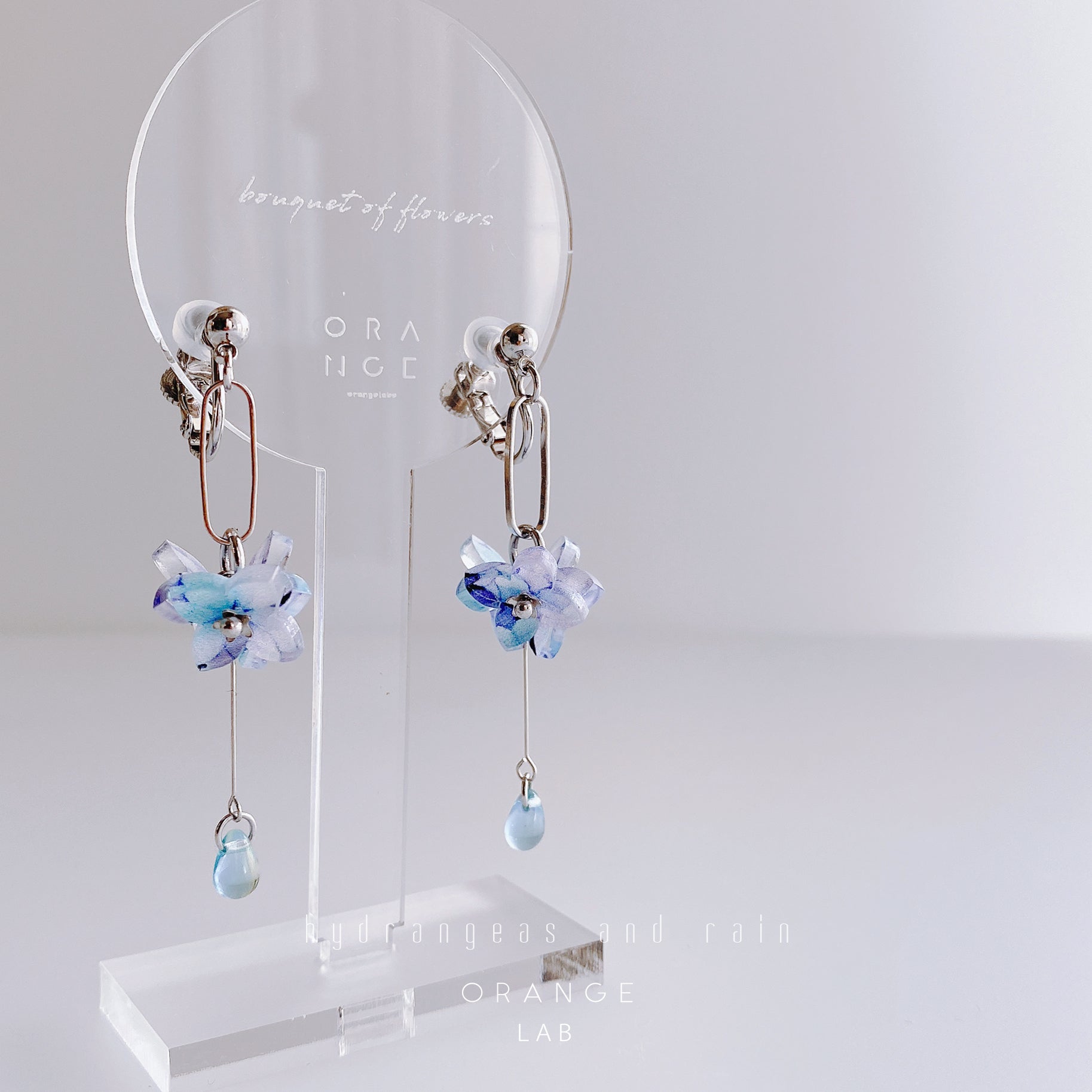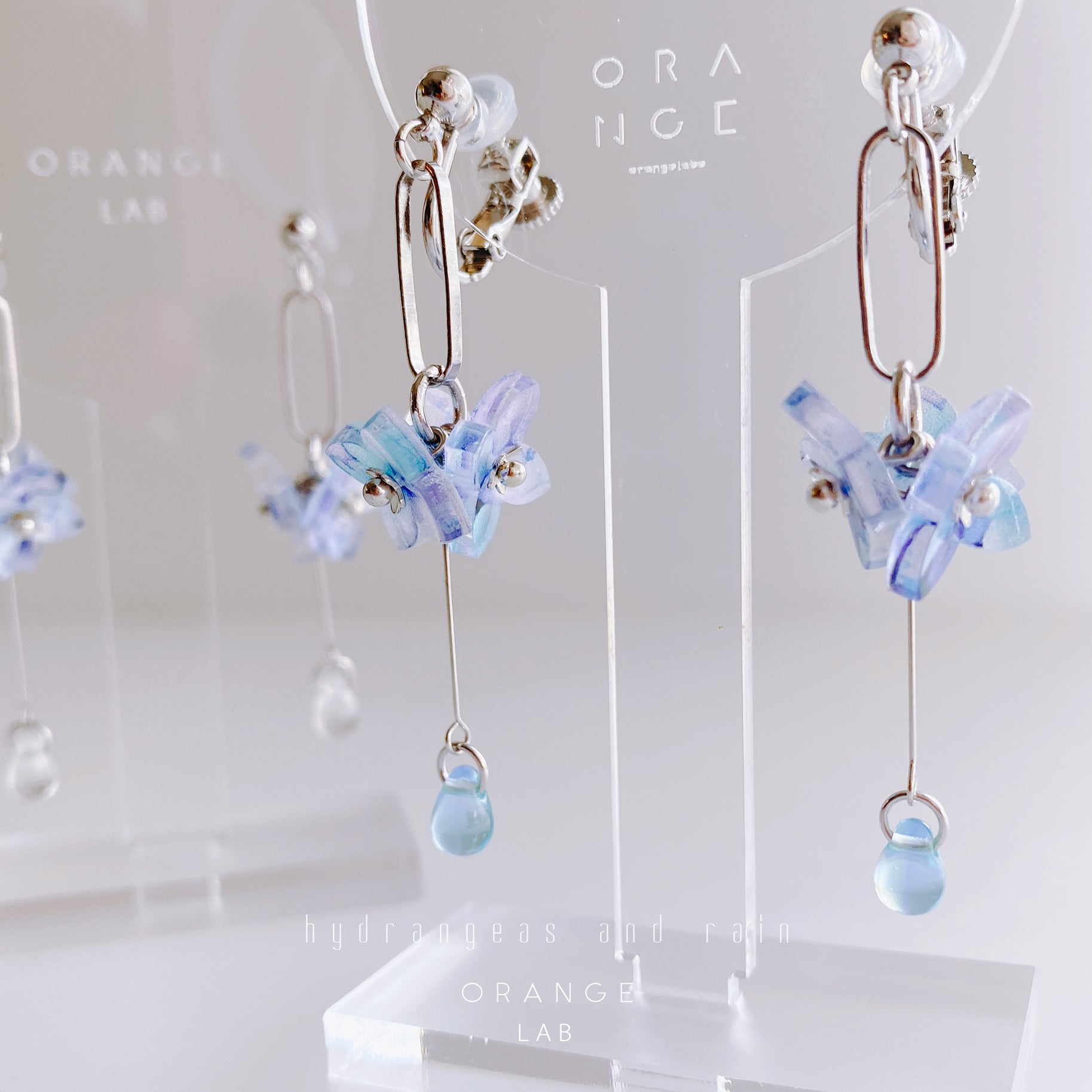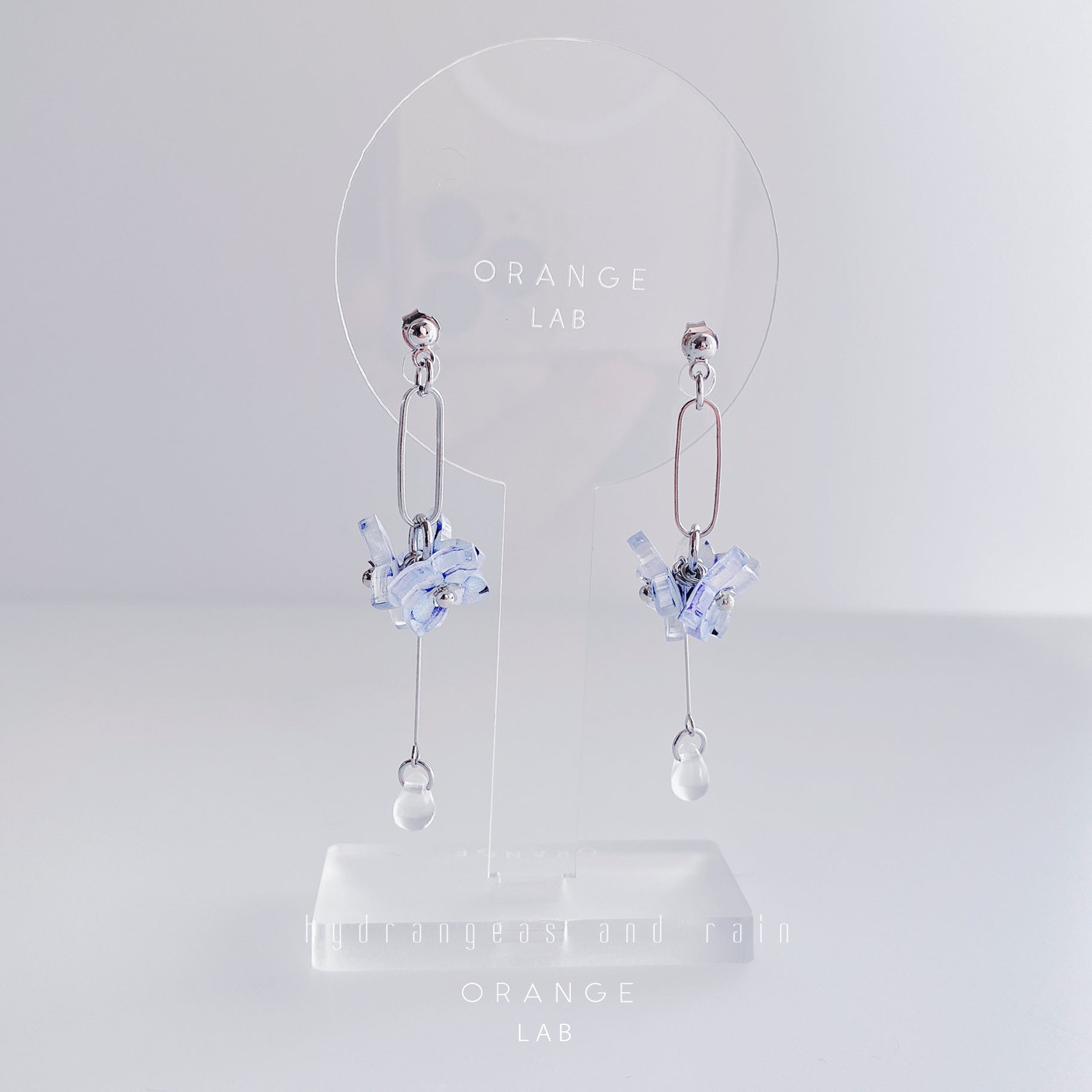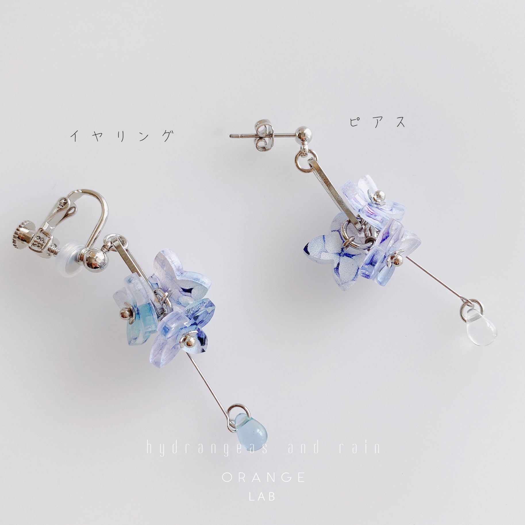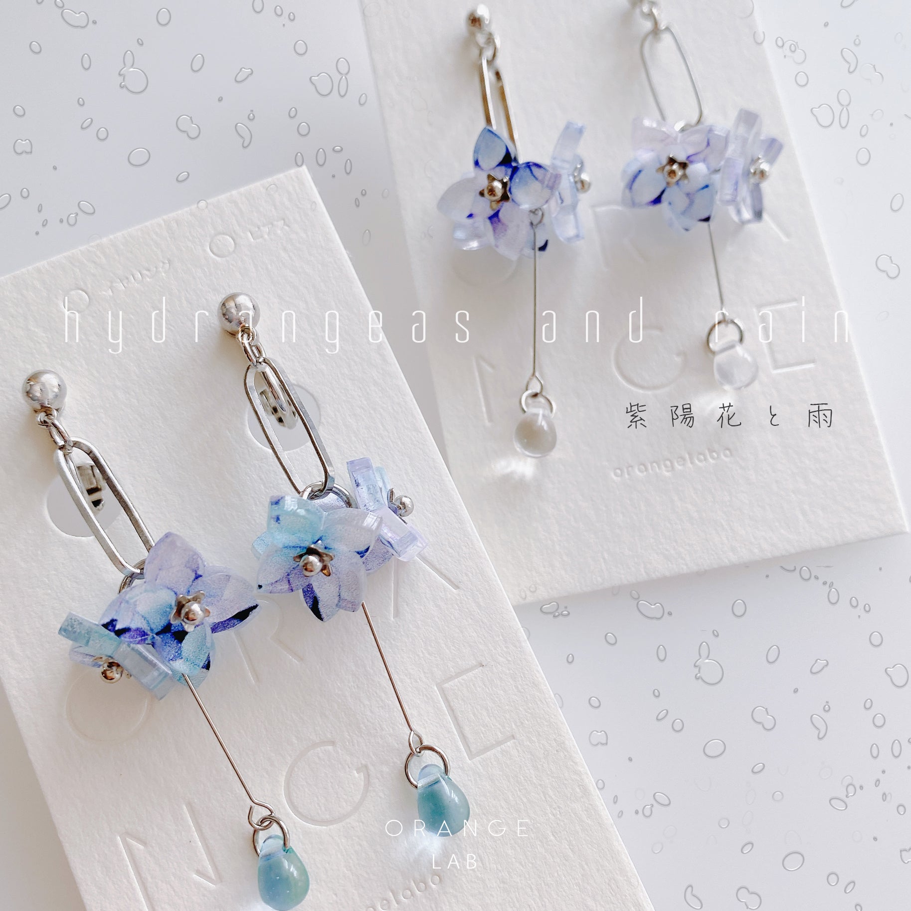 紫陽花の花弁と雨粒を組み合わせたデザインとなります。花弁を集めブーケ状にした作品で揺れる印象もかわいく付け心地も軽いです。