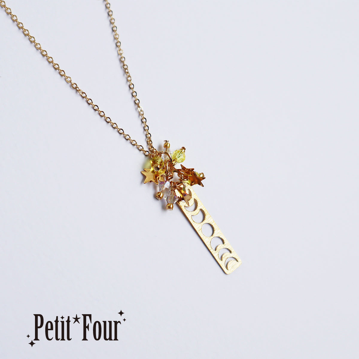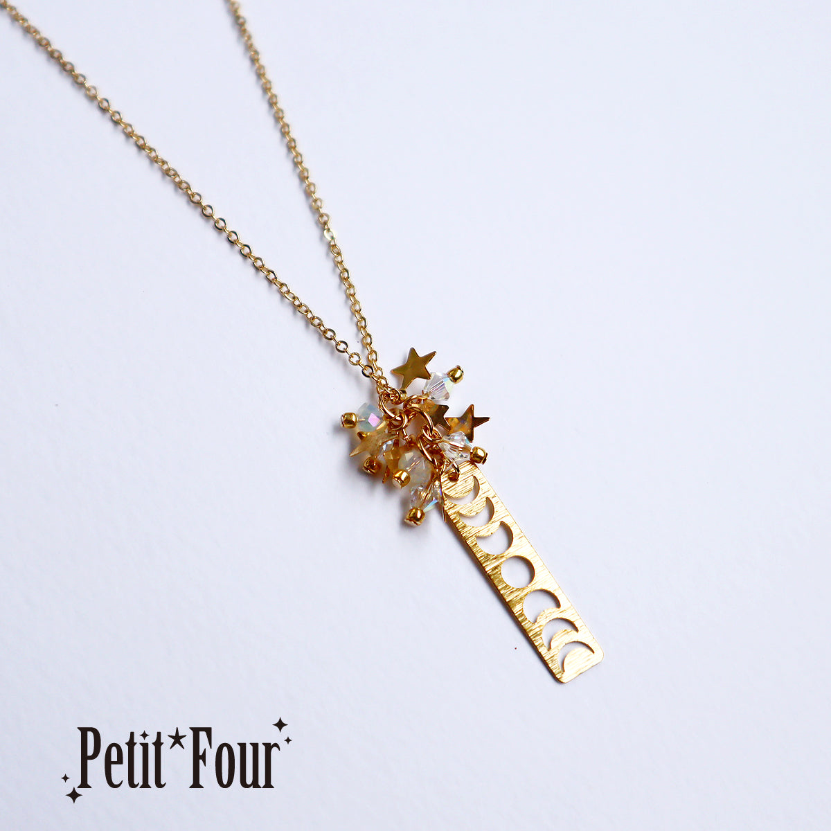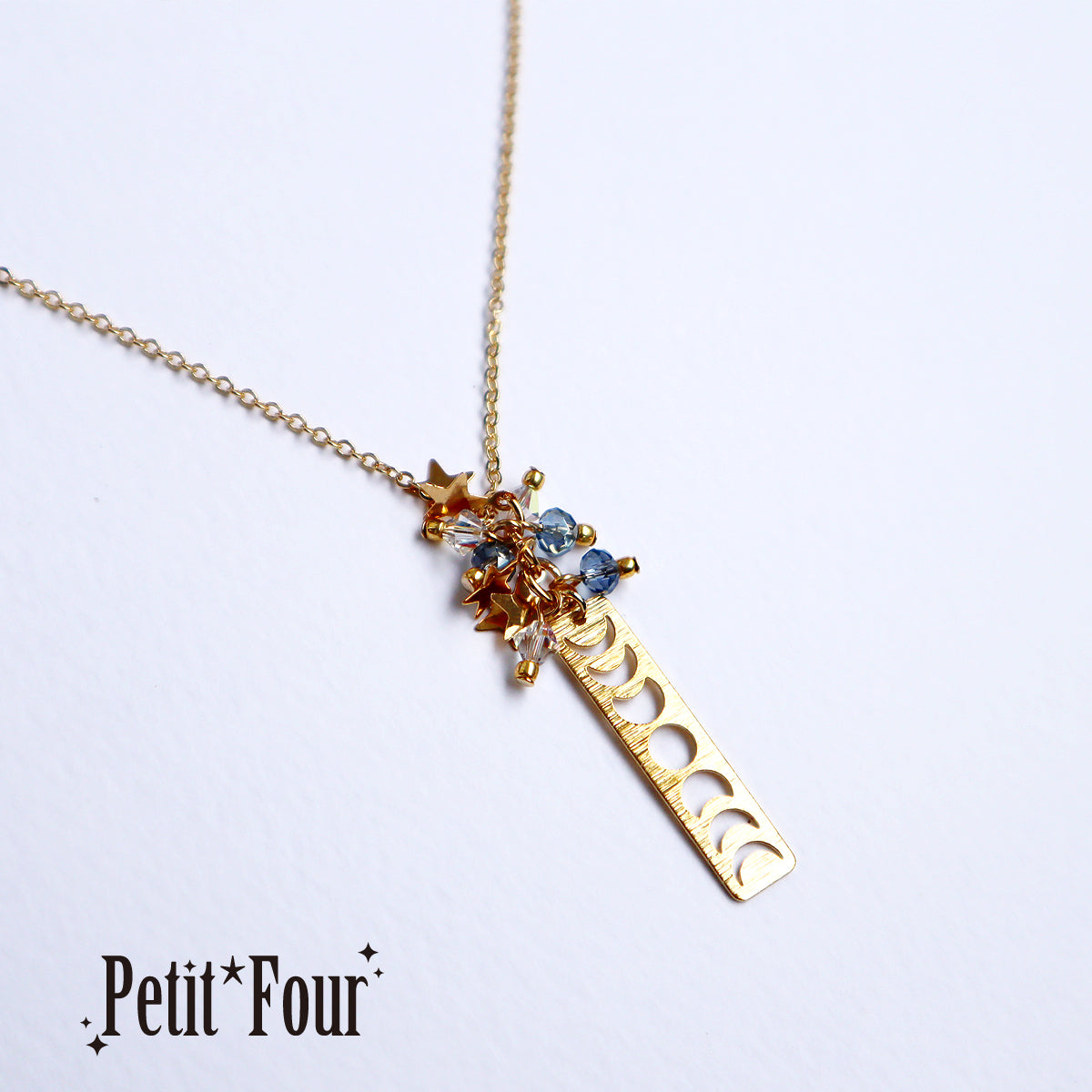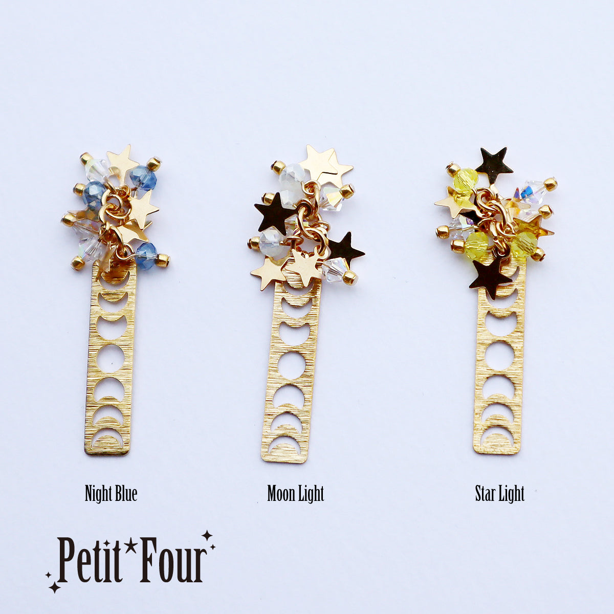 薄いメタルプレートのムーンフェイズモチーフに、星のチェーンを繋ぎ、オーロラカラーのスワロフスキーとガラスビーズで夜空や月、星の輝きをイメージして作りました。