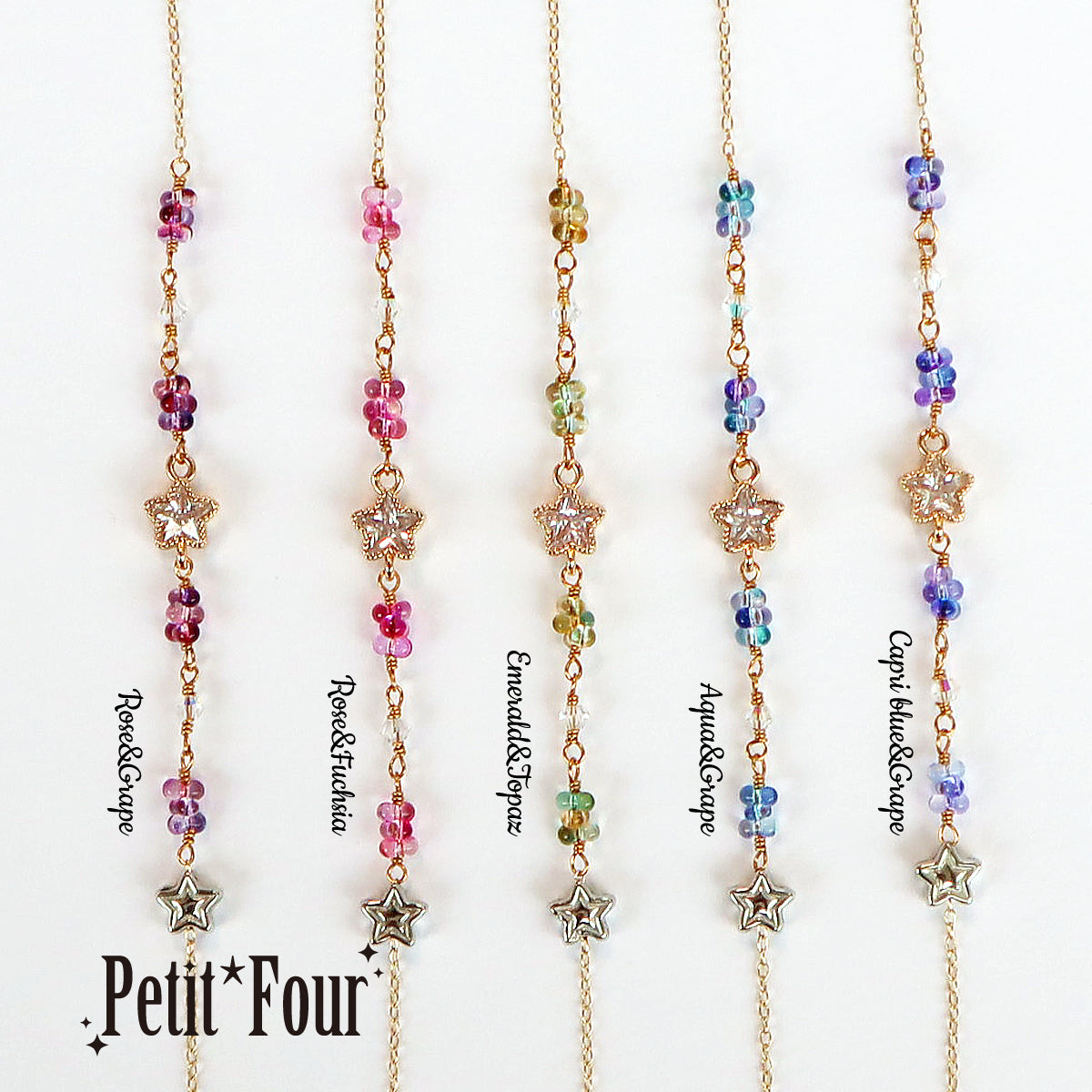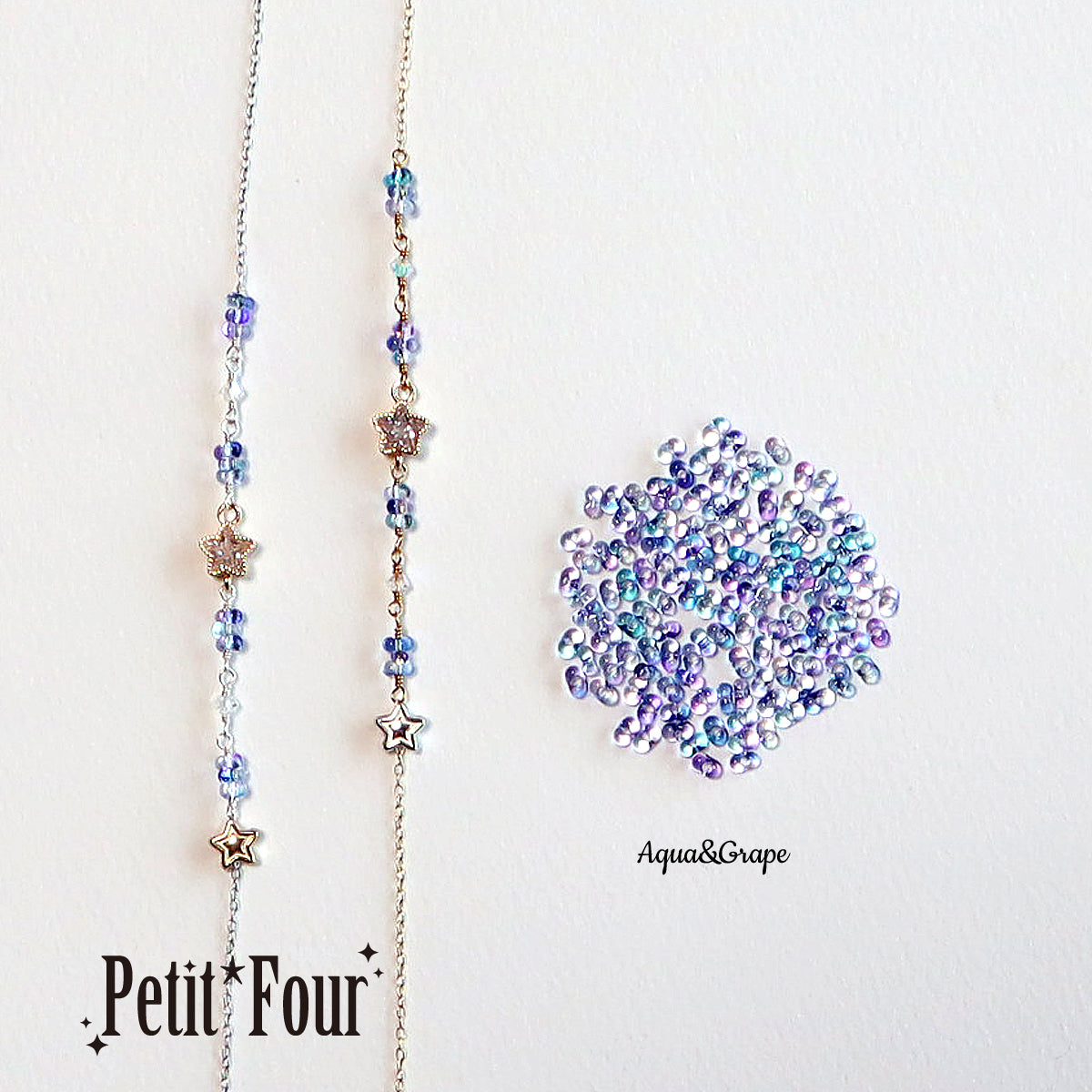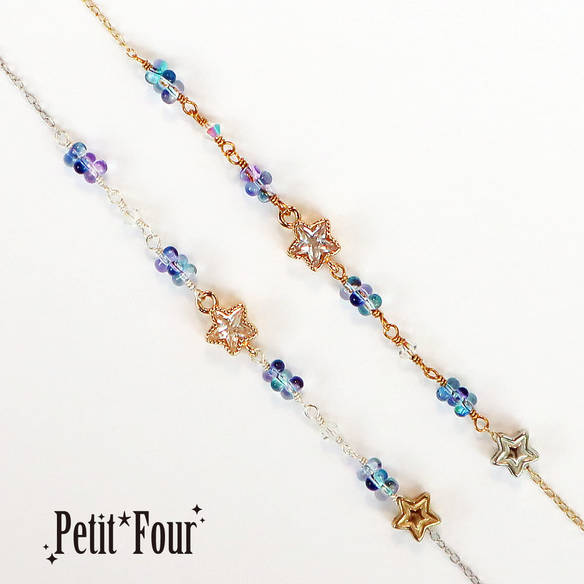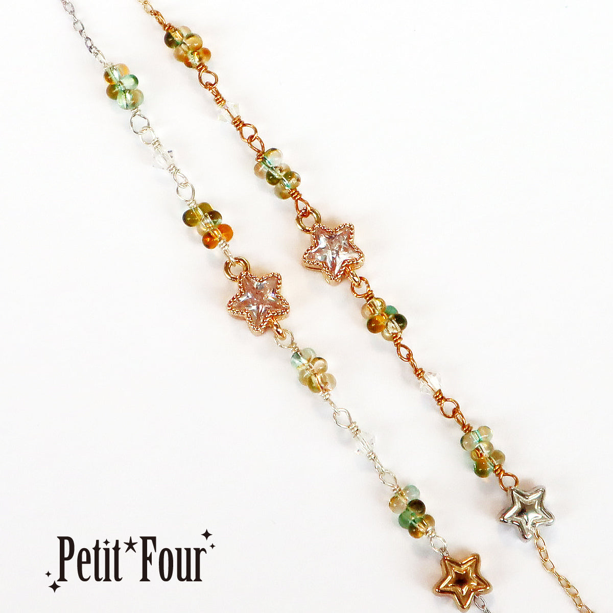 星屑糖蜜(ほしくずとうみつ)の「糖蜜」はシロップと言う意味で、シロップの様な色合いのガラスビーズとオーロラカラーの小粒のスワロフスキー、キラキラのキュービックジルコニアの星チャームを合わせました。