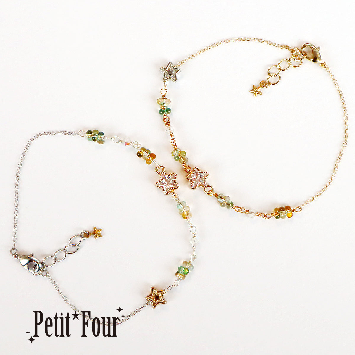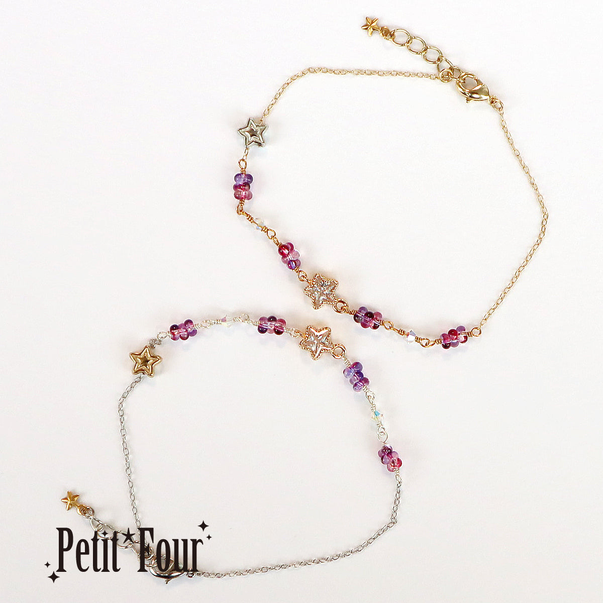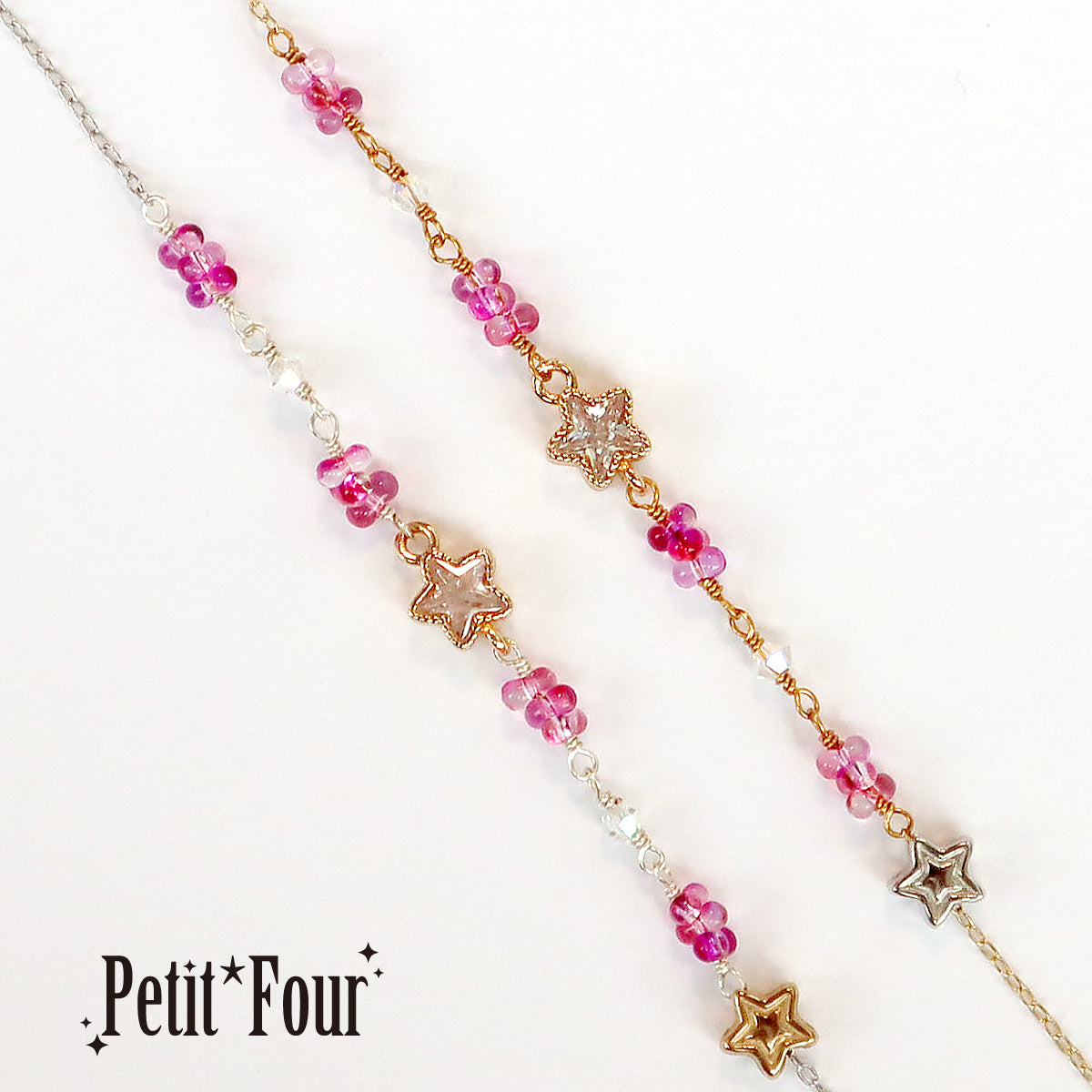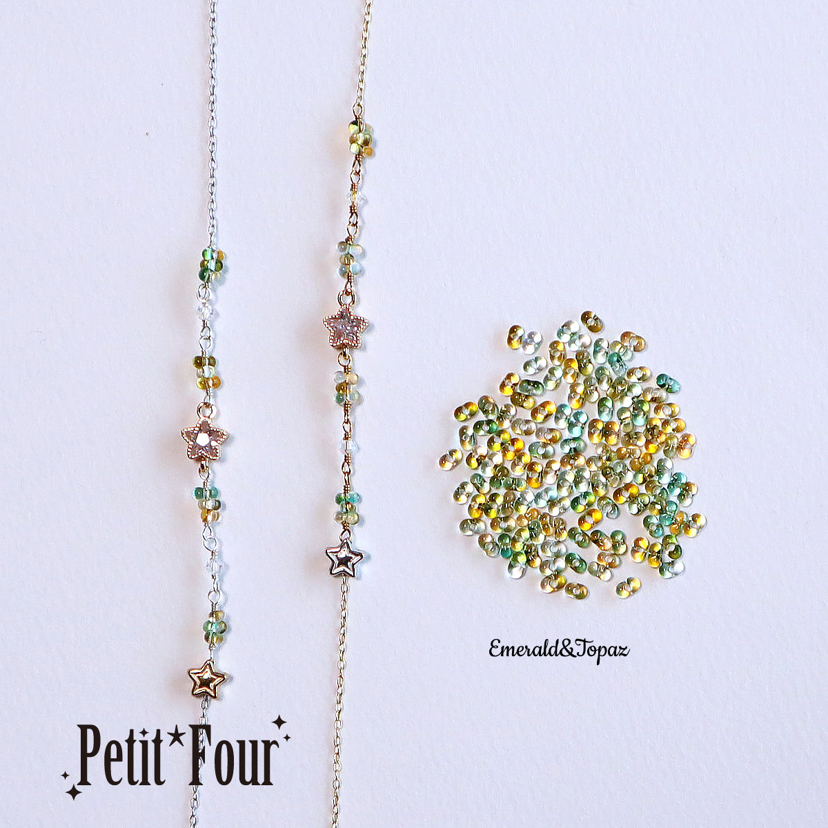 星屑糖蜜(ほしくずとうみつ)の「糖蜜」はシロップと言う意味で、シロップの様な色合いのガラスビーズとオーロラカラーの小粒のスワロフスキー、キラキラのキュービックジルコニアの星チャームを合わせました。