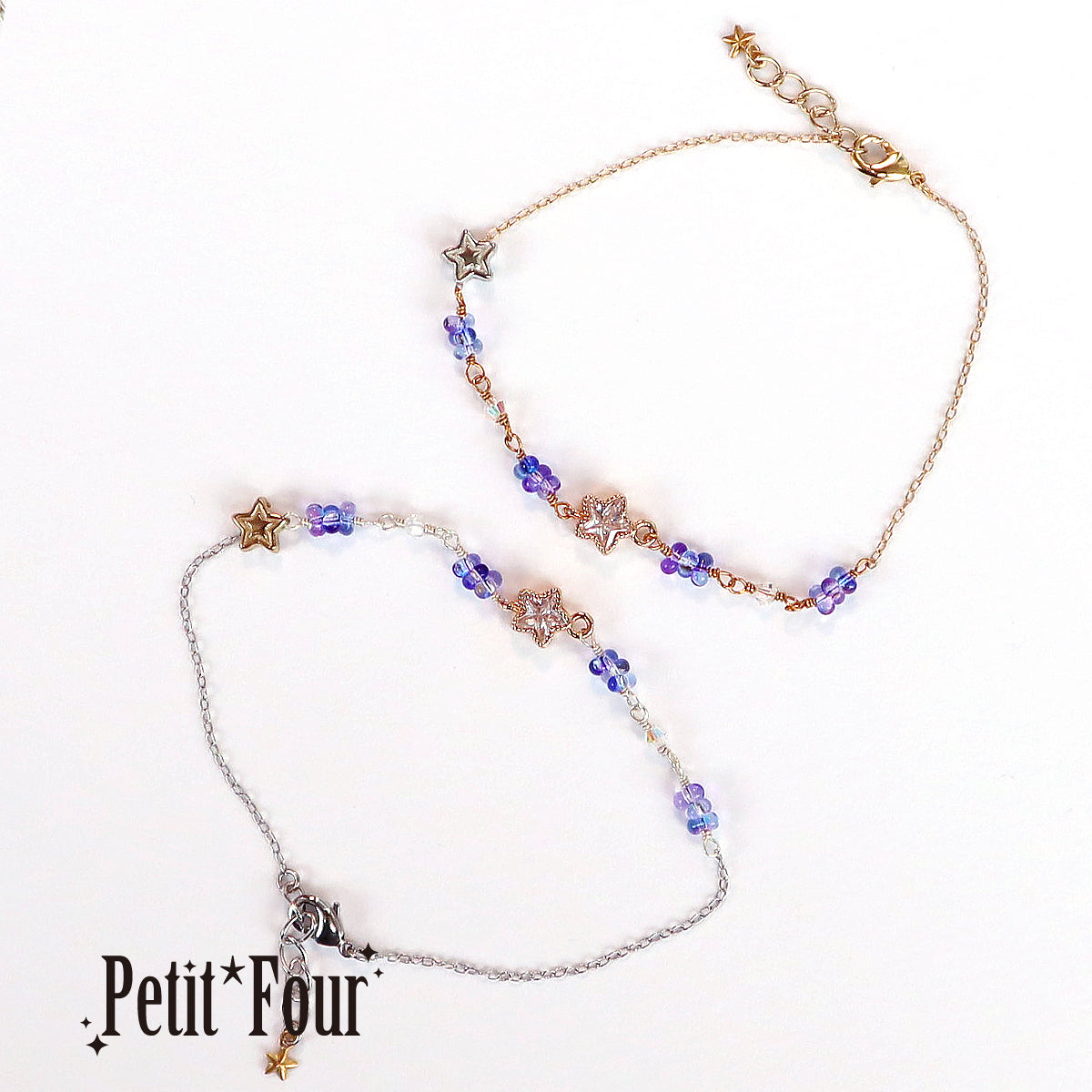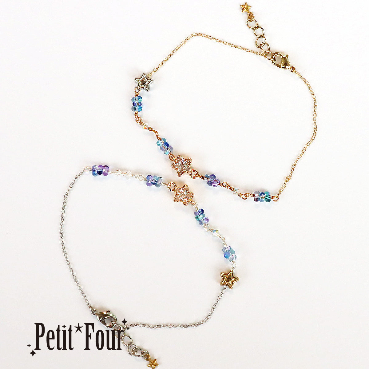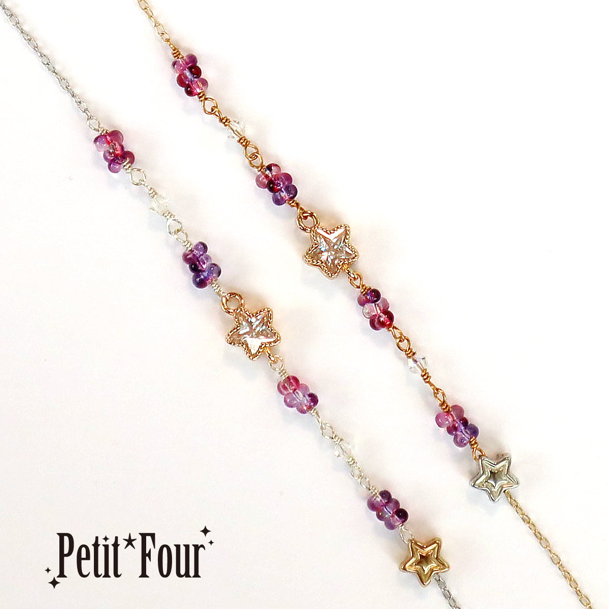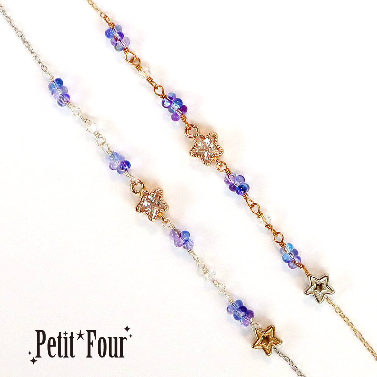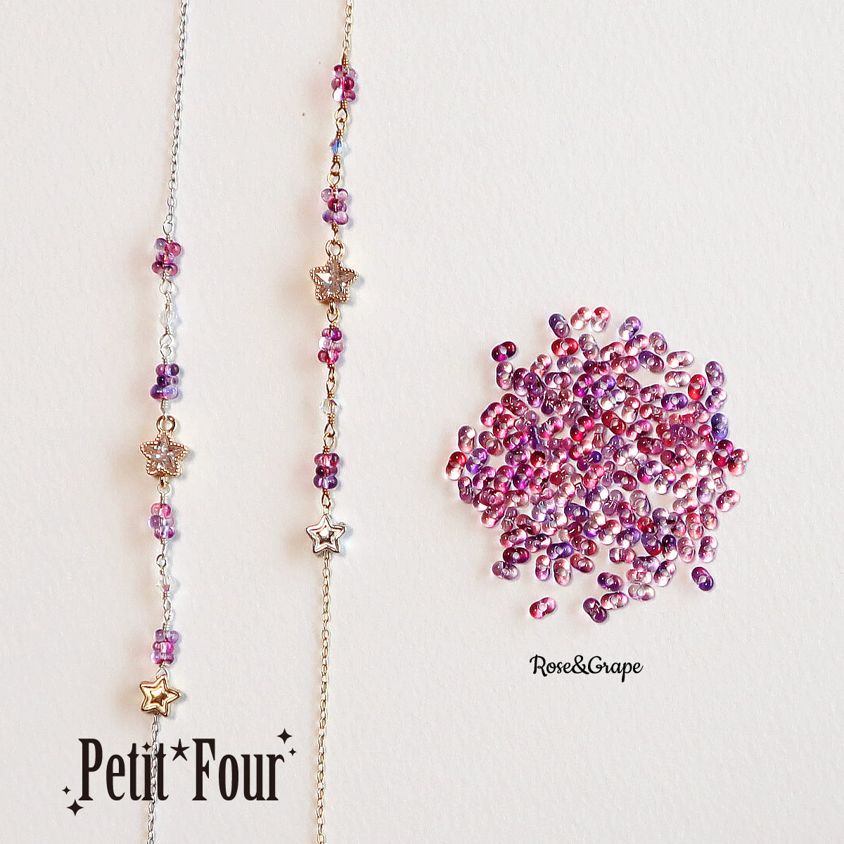 星屑糖蜜(ほしくずとうみつ)の「糖蜜」はシロップと言う意味で、シロップの様な色合いのガラスビーズとオーロラカラーの小粒のスワロフスキー、キラキラのキュービックジルコニアの星チャームを合わせました。