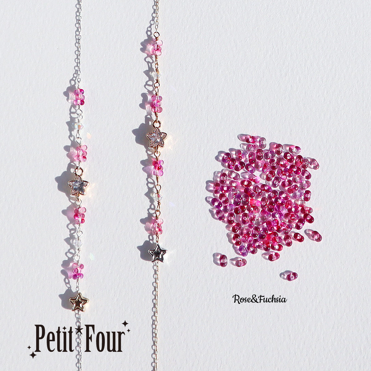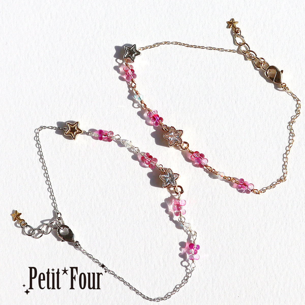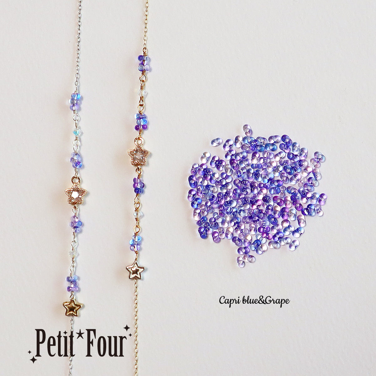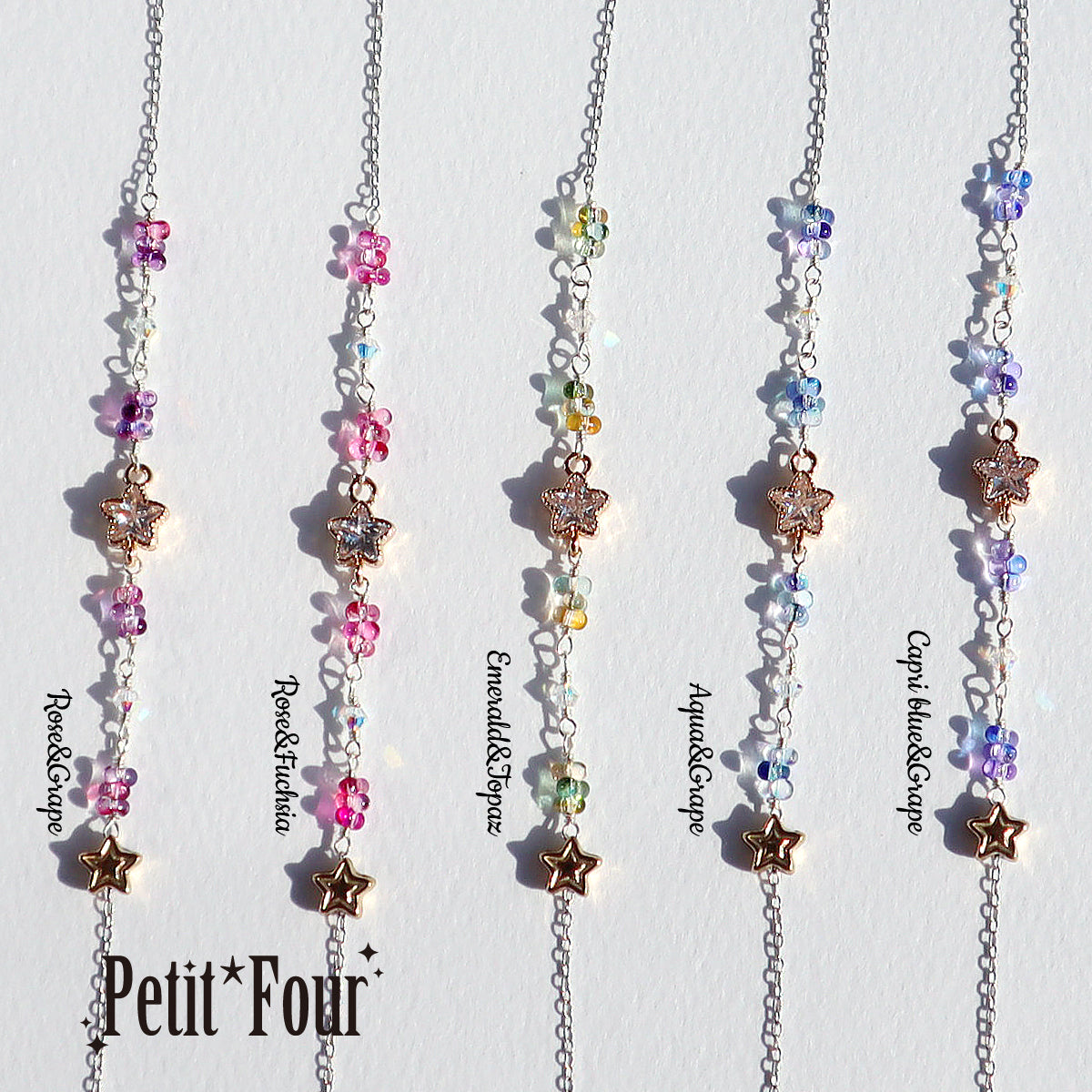 星屑糖蜜(ほしくずとうみつ)の「糖蜜」はシロップと言う意味で、シロップの様な色合いのガラスビーズとオーロラカラーの小粒のスワロフスキー、キラキラのキュービックジルコニアの星チャームを合わせました。