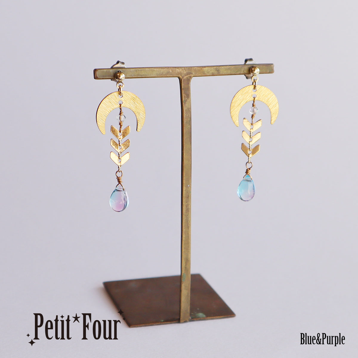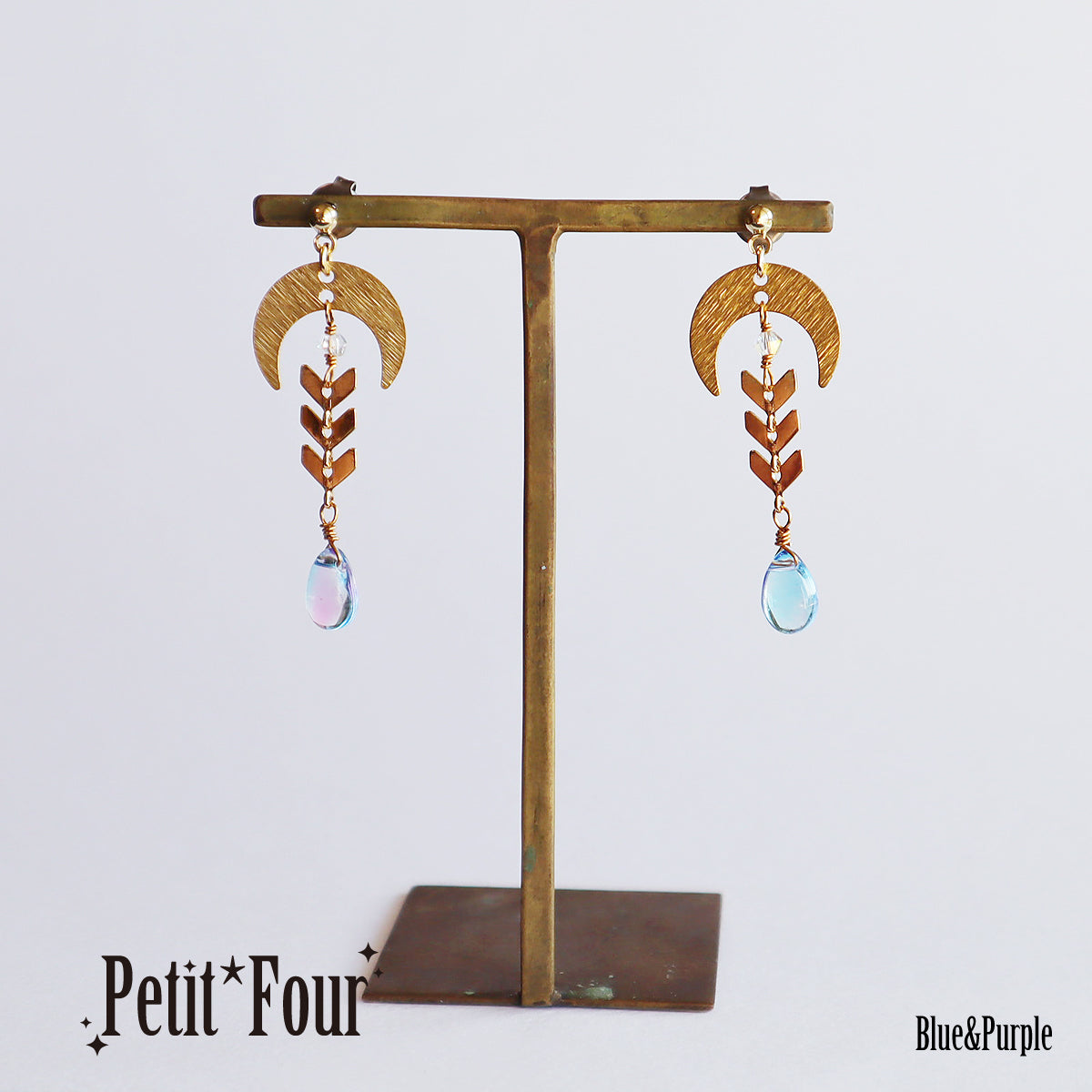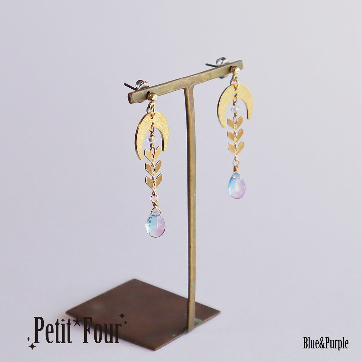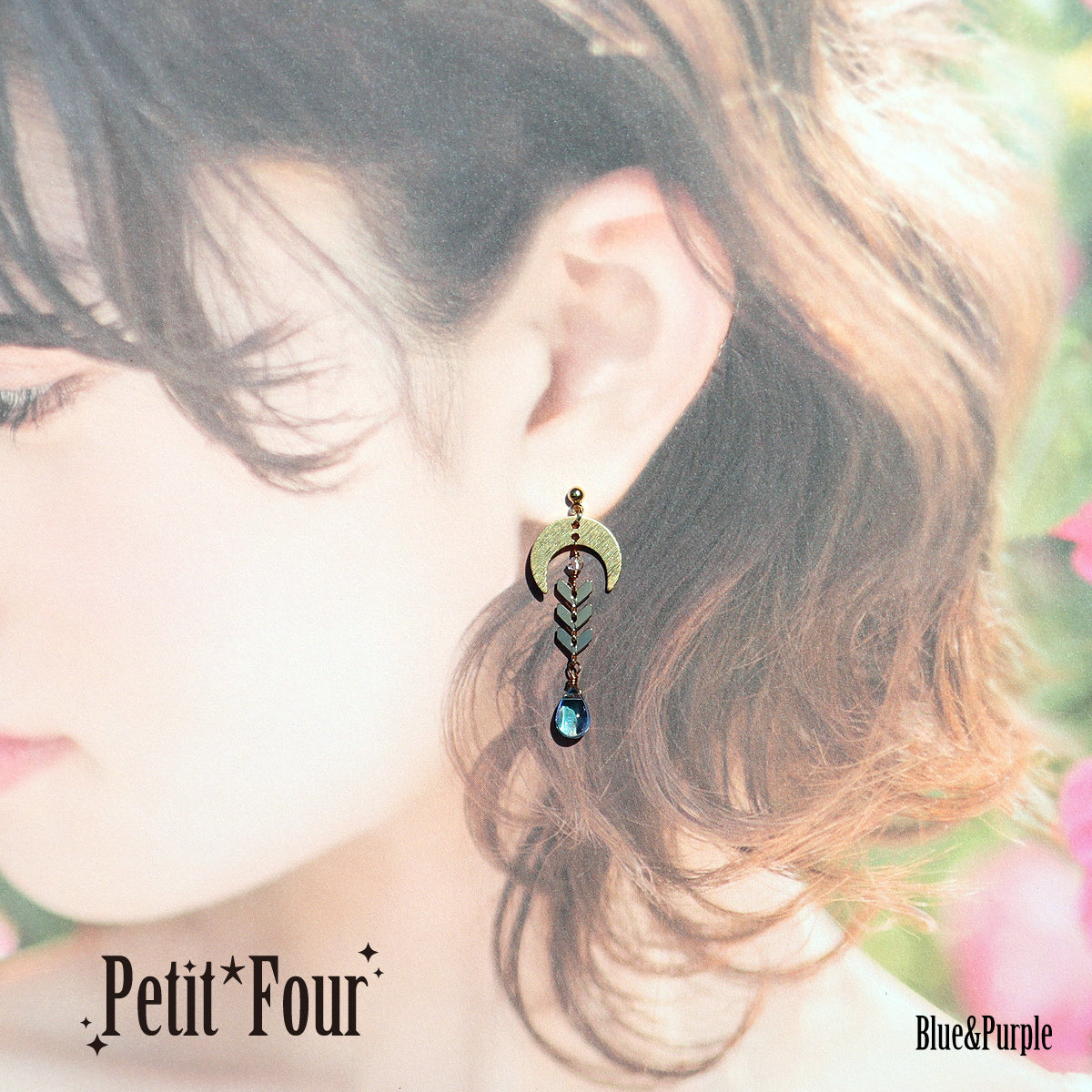 そんな月モチーフと「輝かしい将来」の意味を持つ月桂樹の葉をイメージしたメタルチェーンで、「零れんばかりの祝福」をイメージしてガラスのドロップビーズを繋げました。