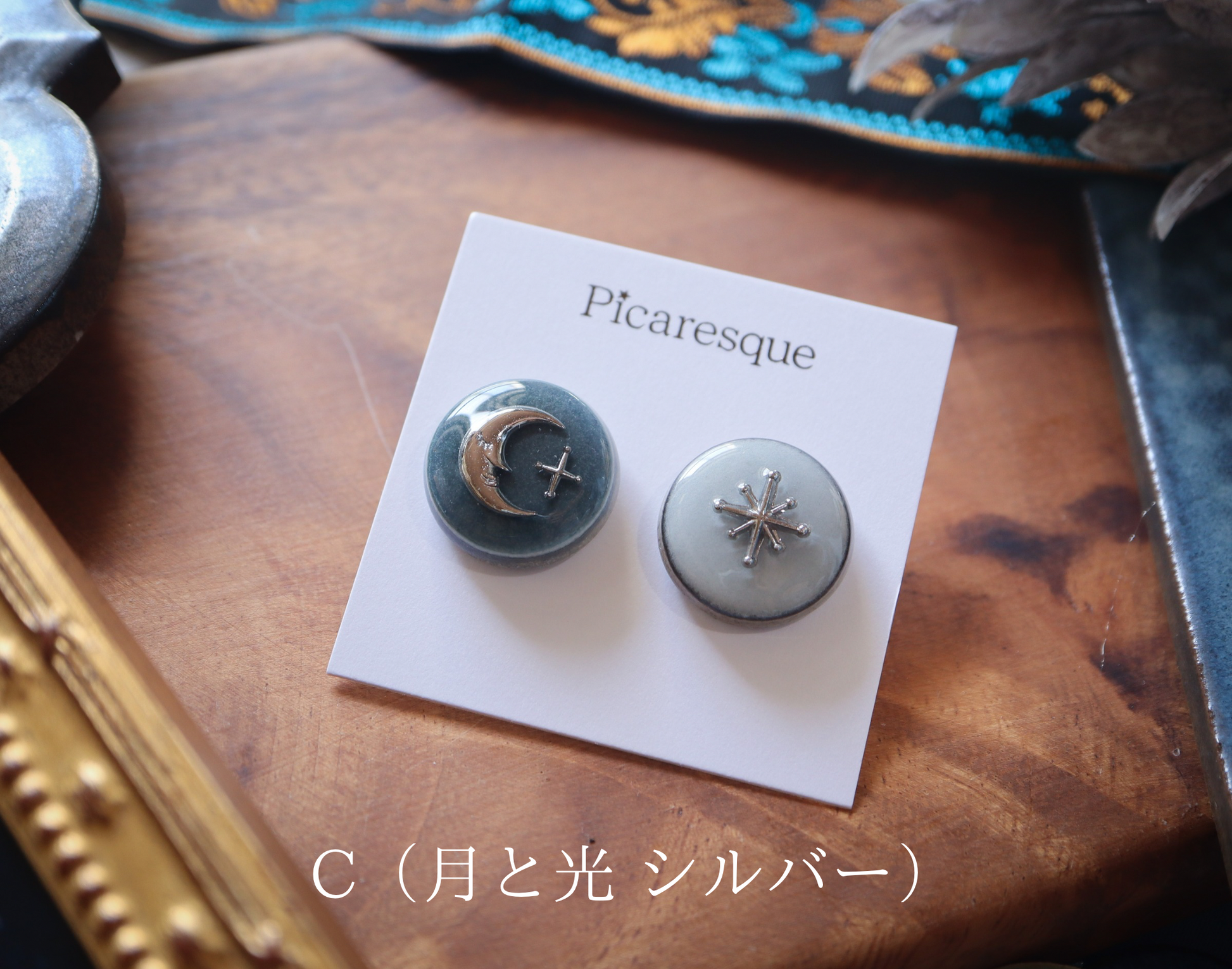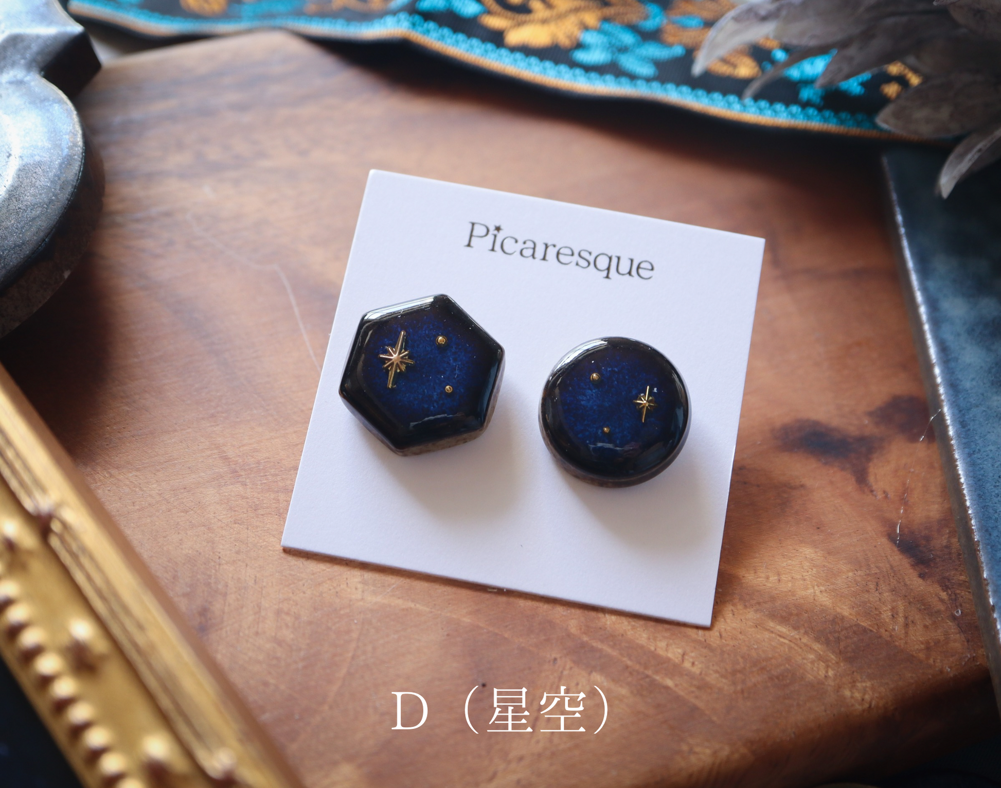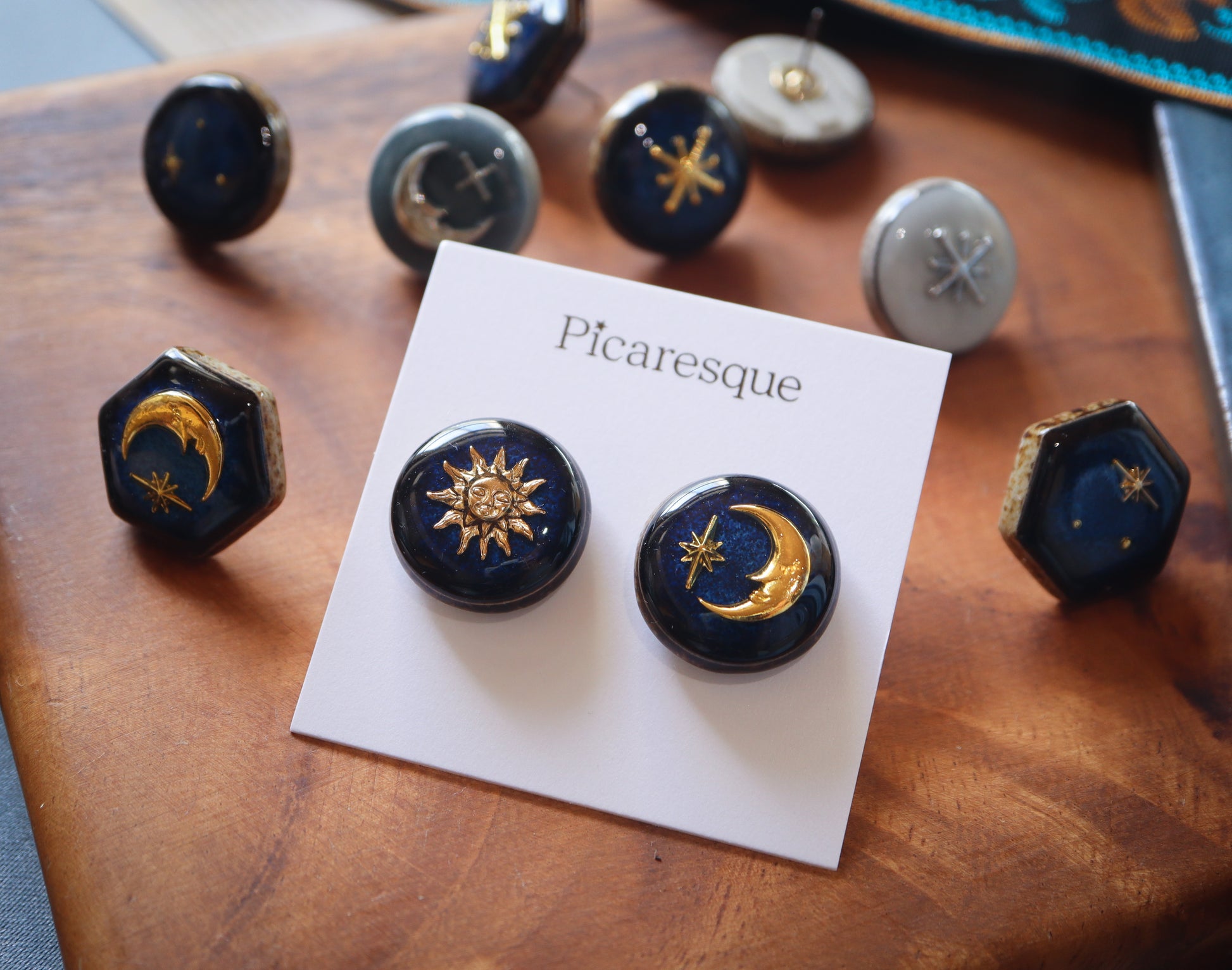 アンティークな色合いの美濃焼タイルに星や月などの天体モチーフを合わせたイヤリング/ピアスです。