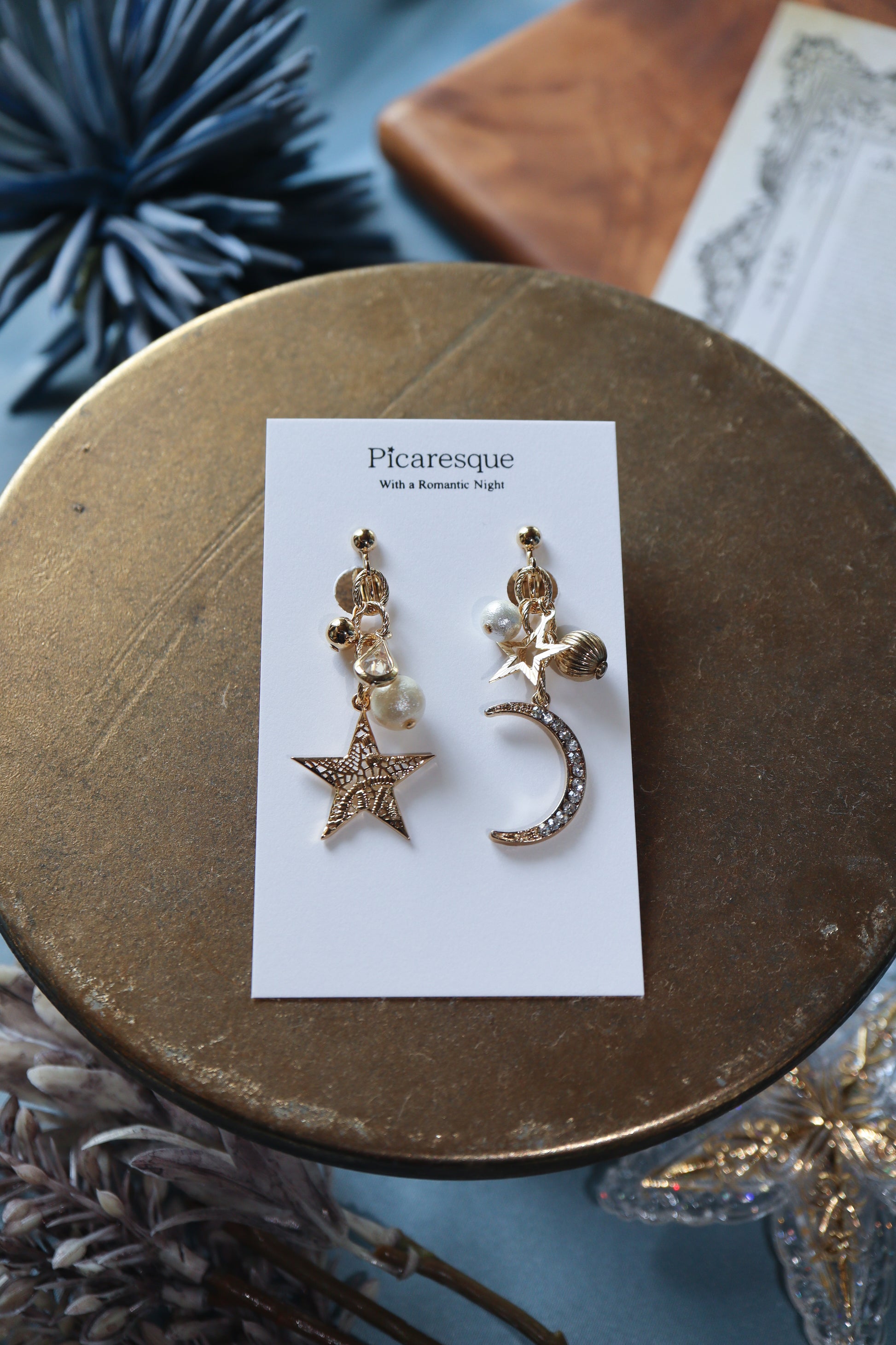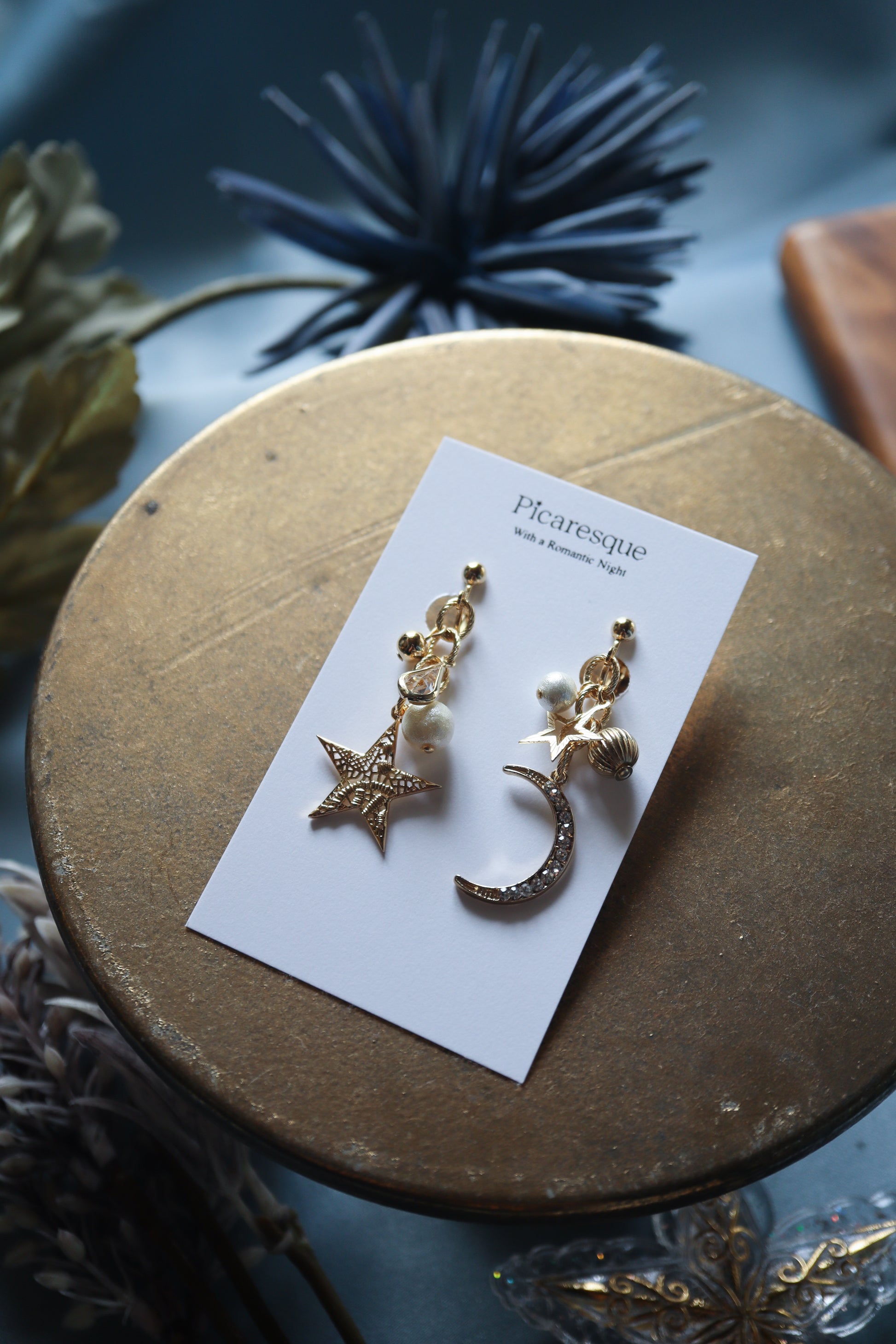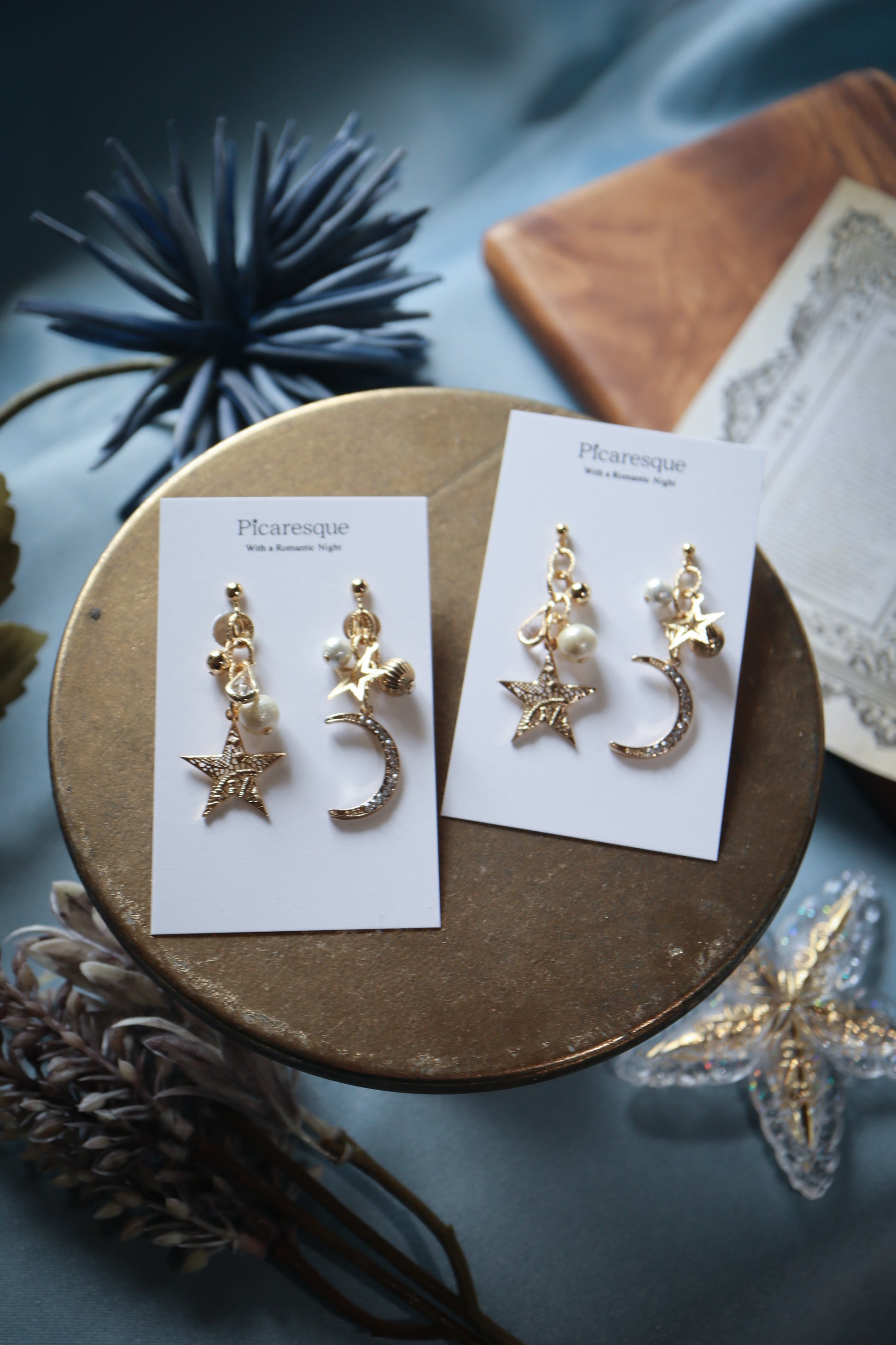上品な雰囲気の星や月のパーツを組み合わせ、耳元をキラリと輝かせるアクセサリーをお作りしました。