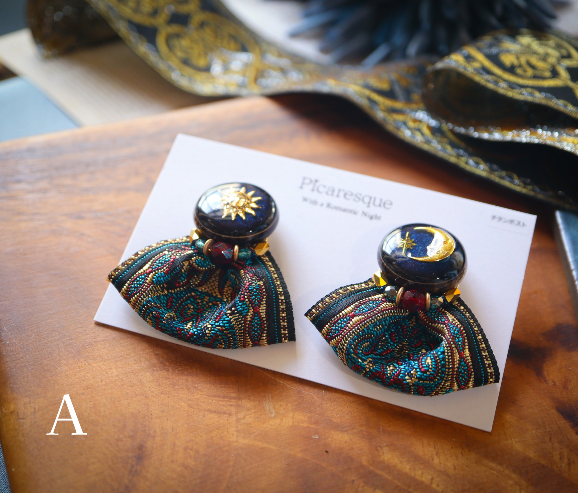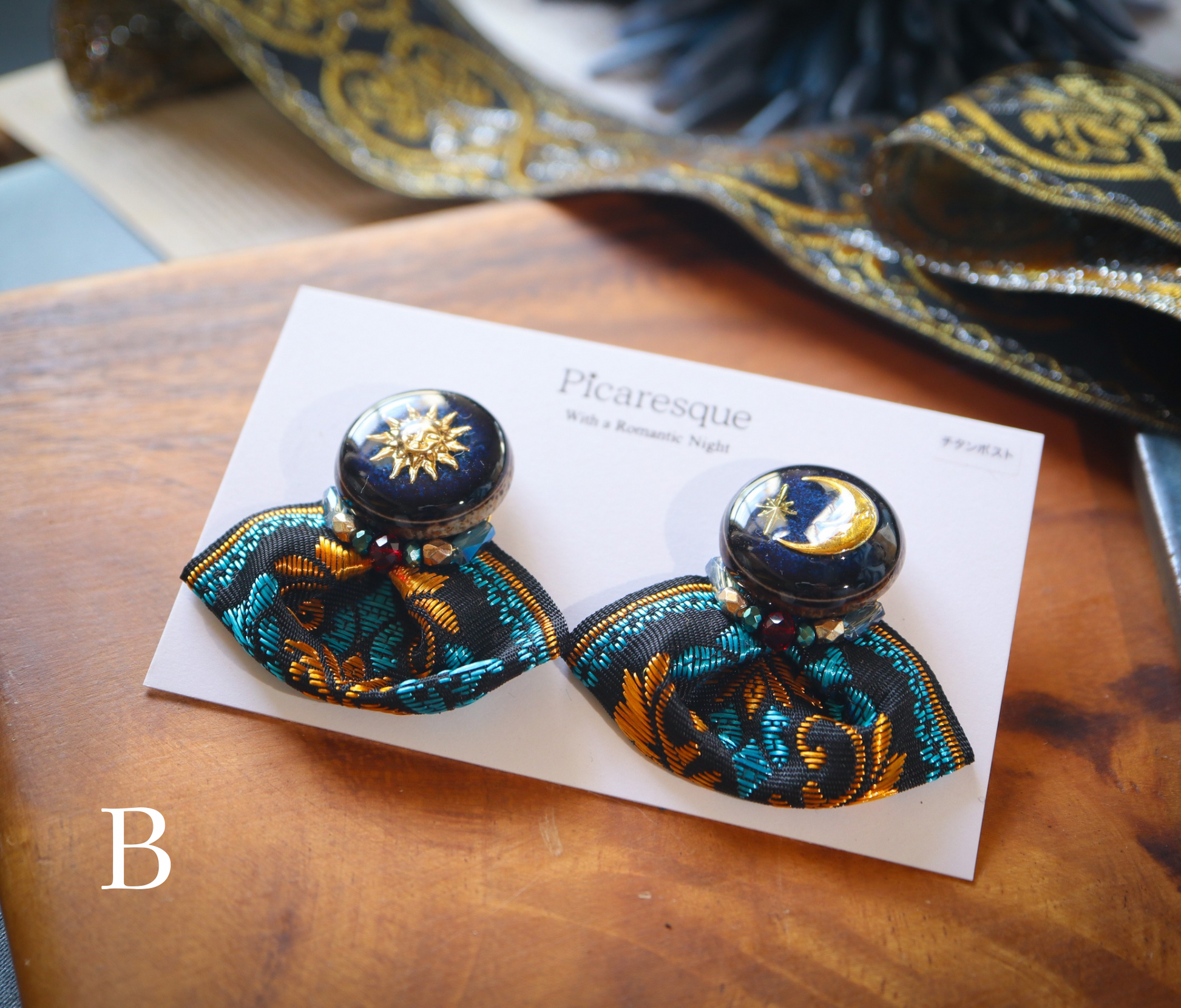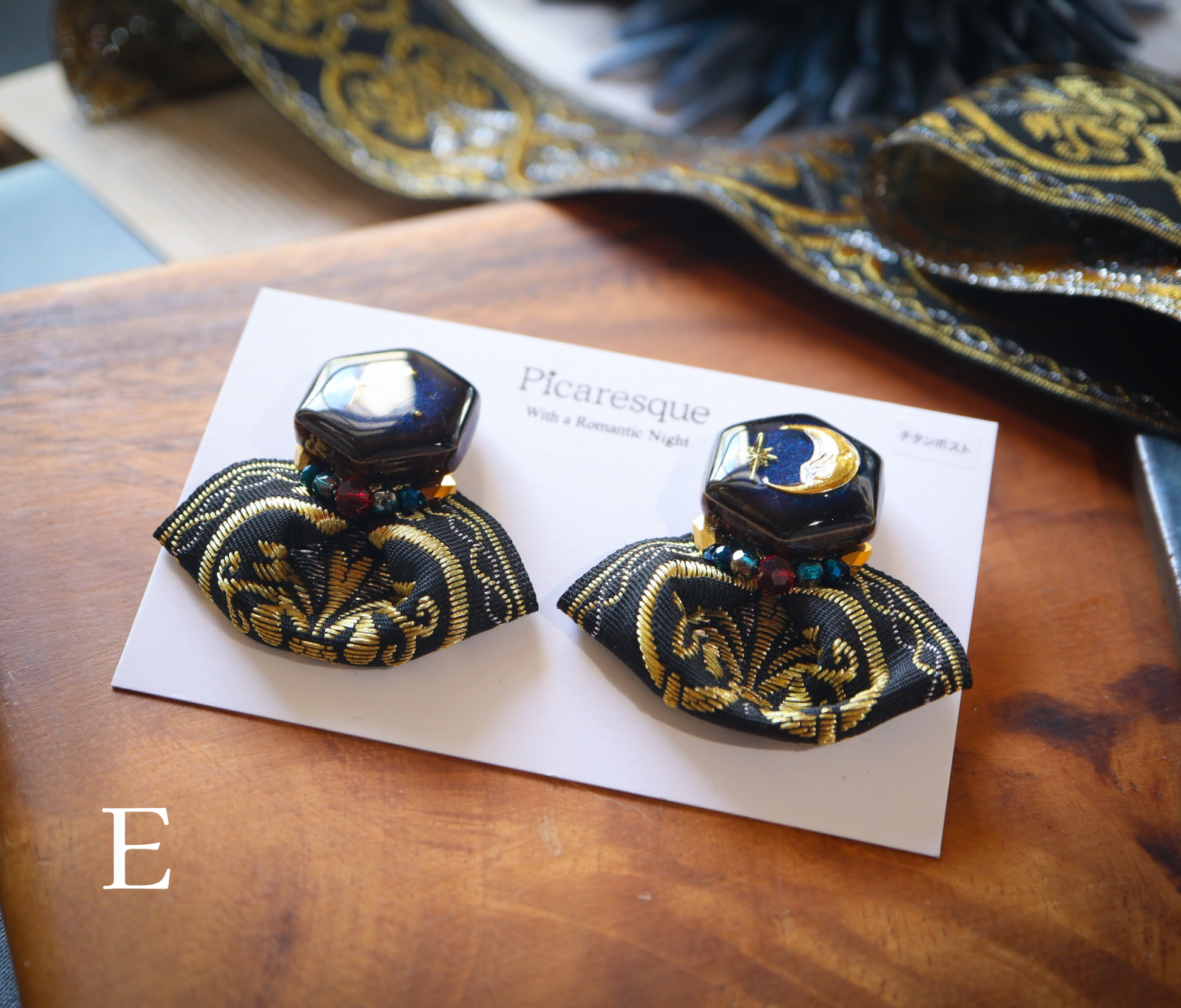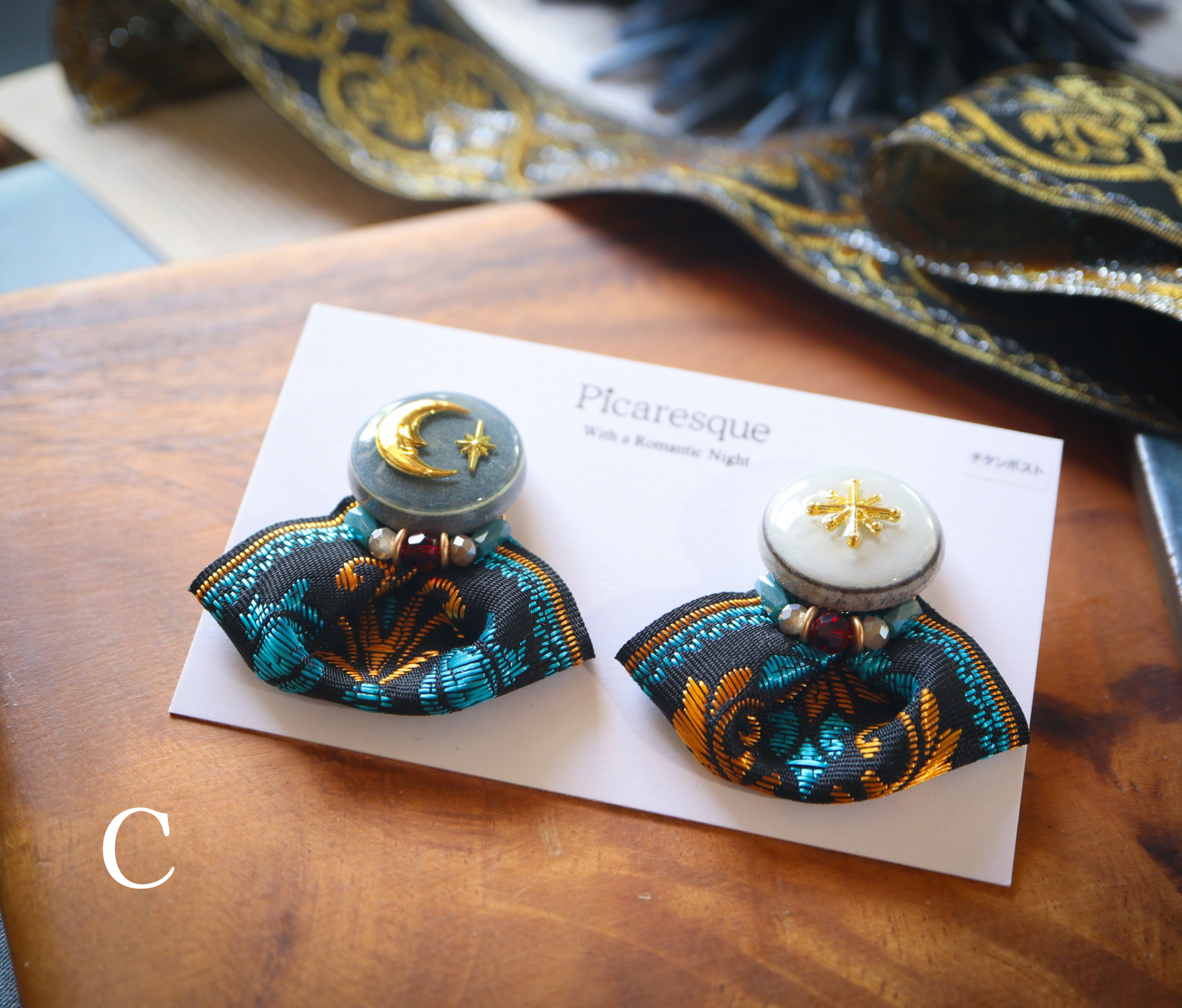 リボン×美濃焼タイル×ビーズを組み合わせたイヤリング/ピアスです。