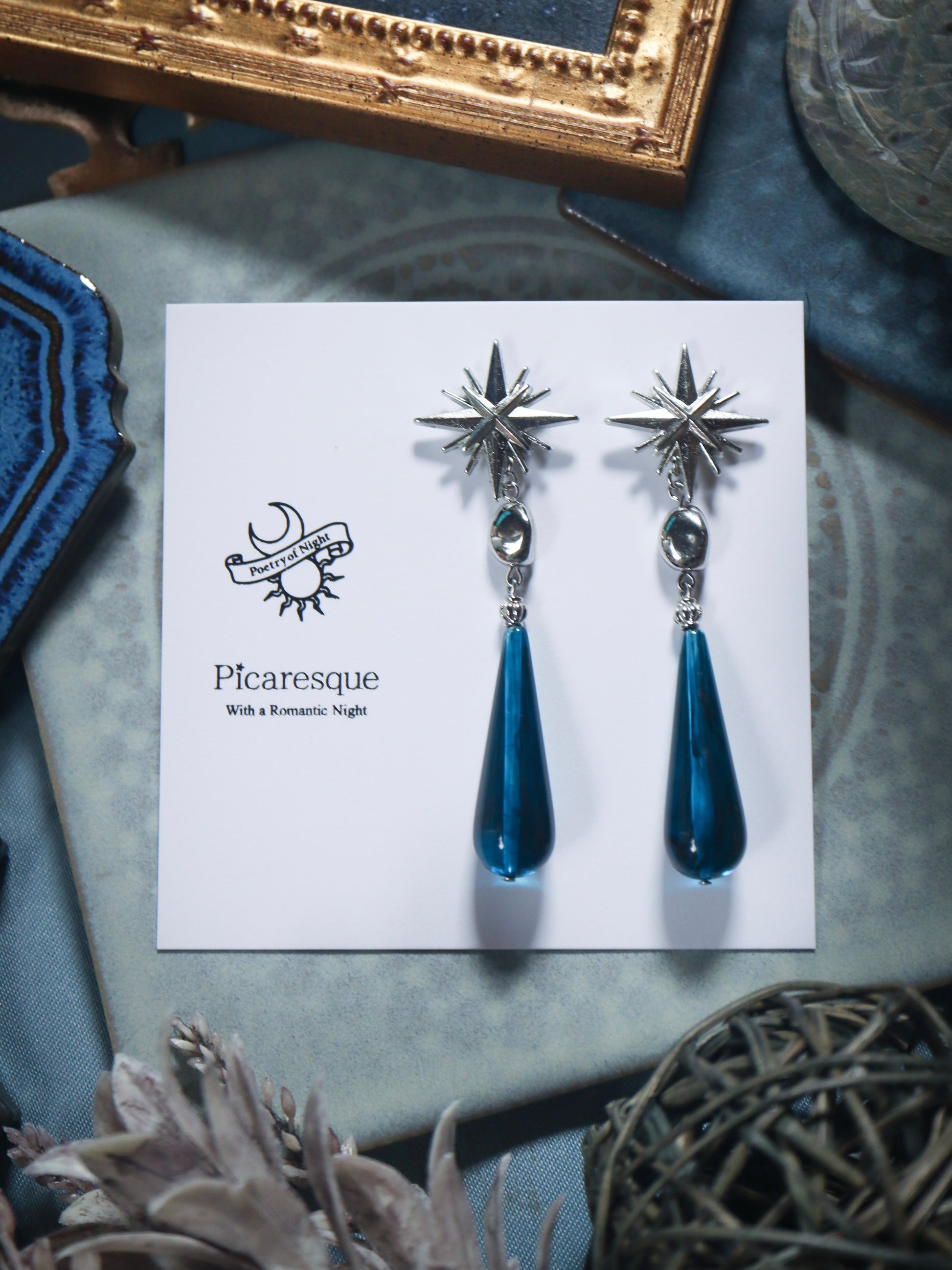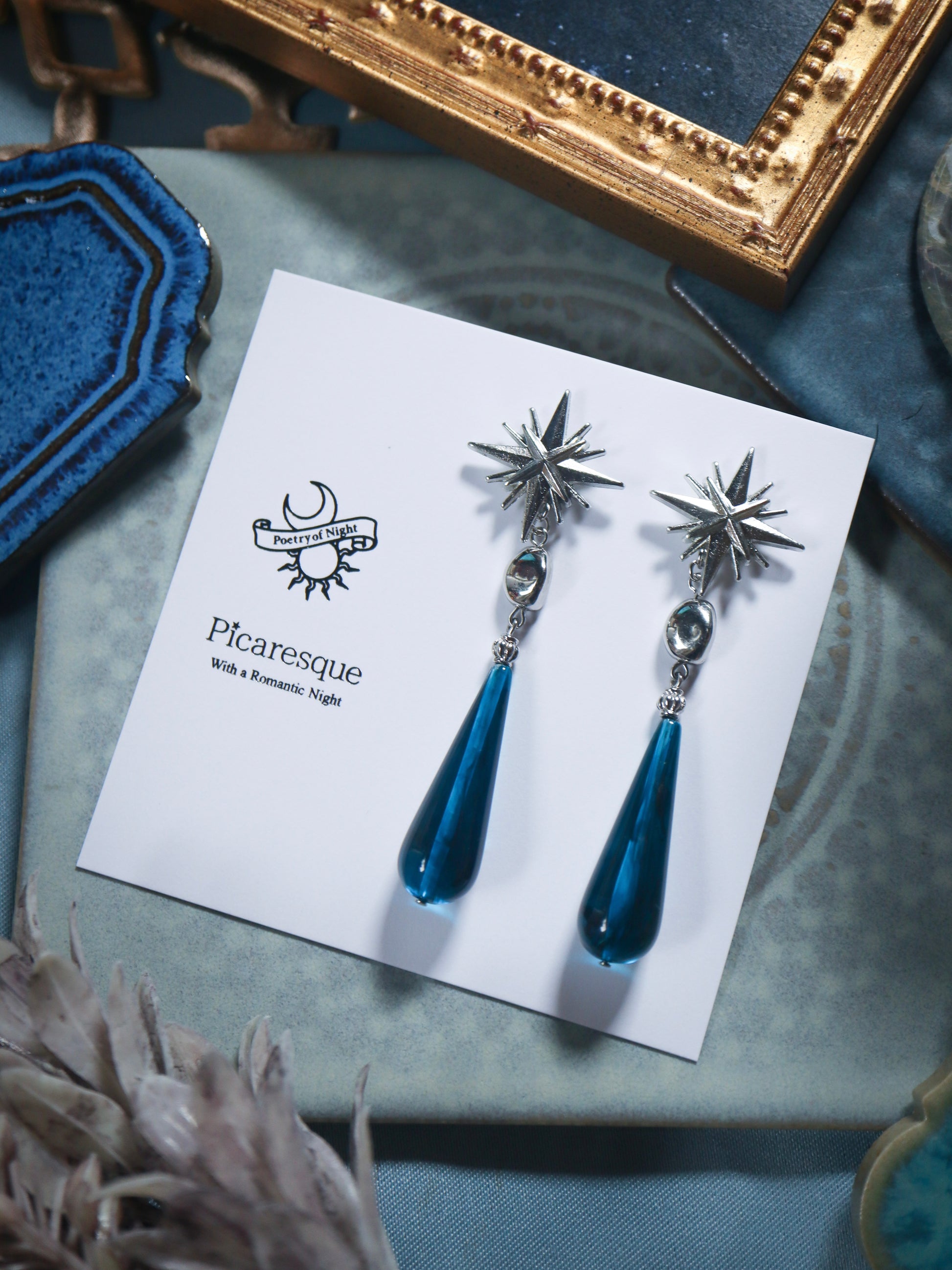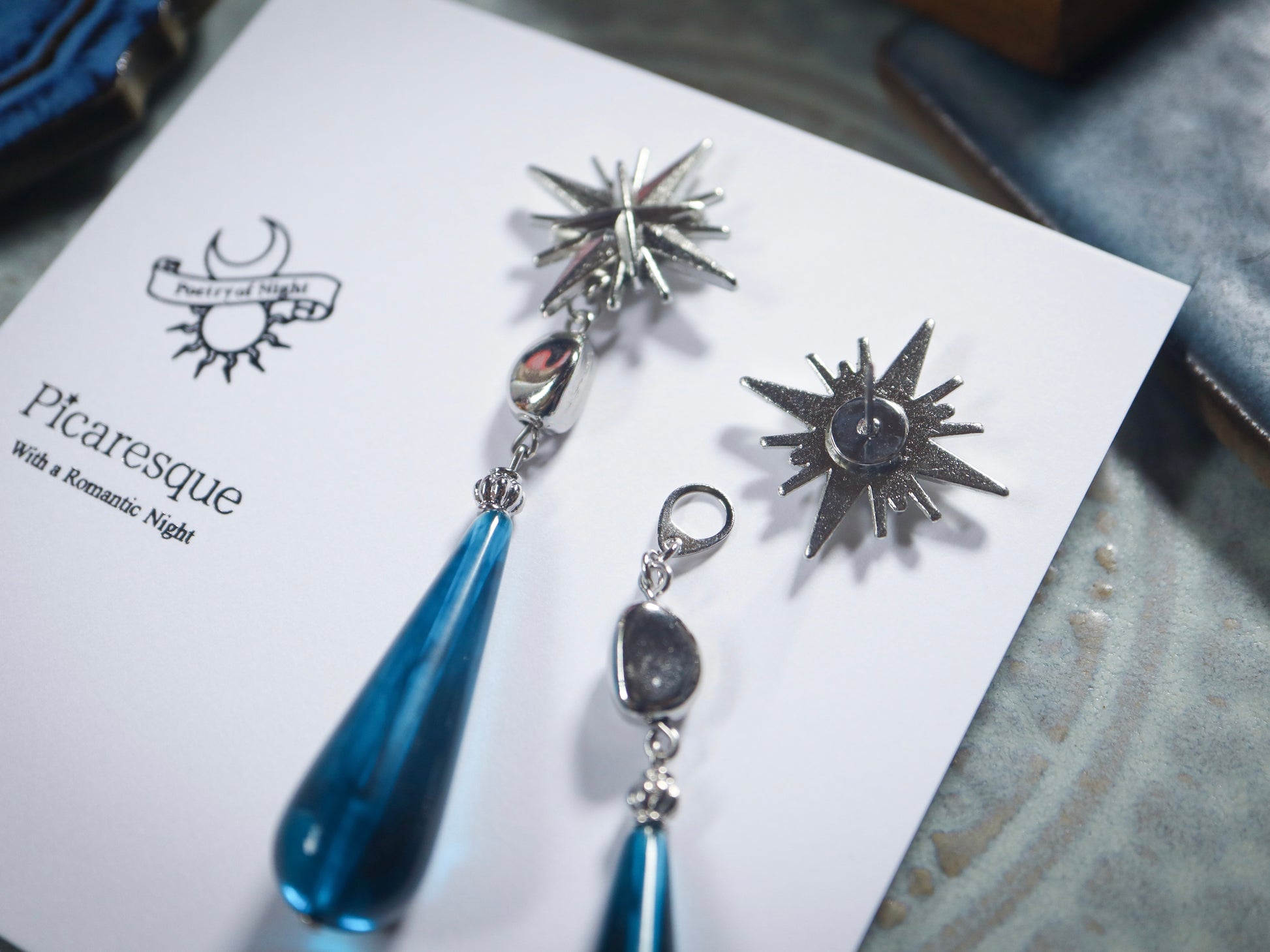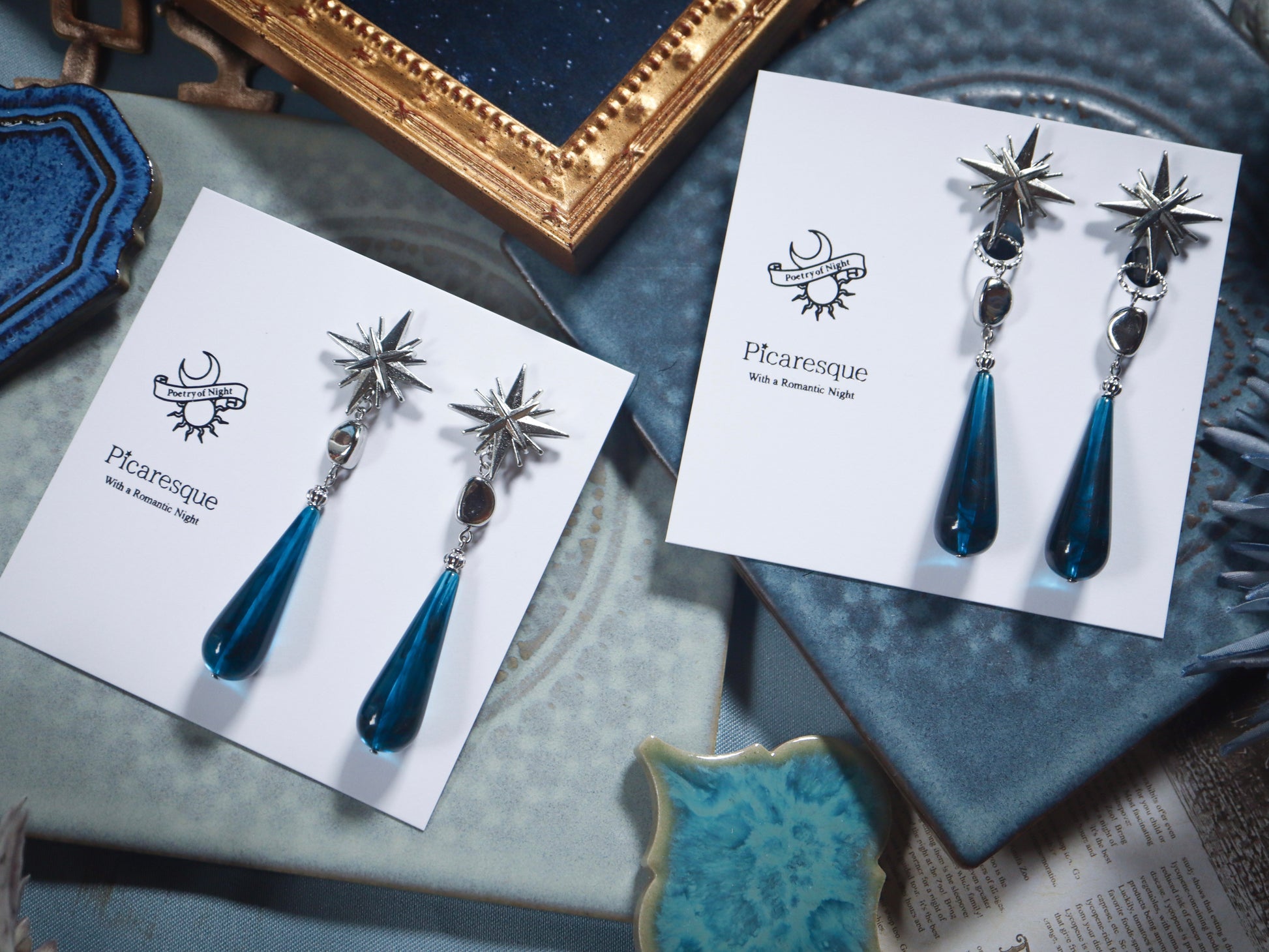 大きな星に涼しげな色合いの雫型ビーズを合わせ、神秘的で凛とした雰囲気に仕上げたイヤリング/ピアスです。