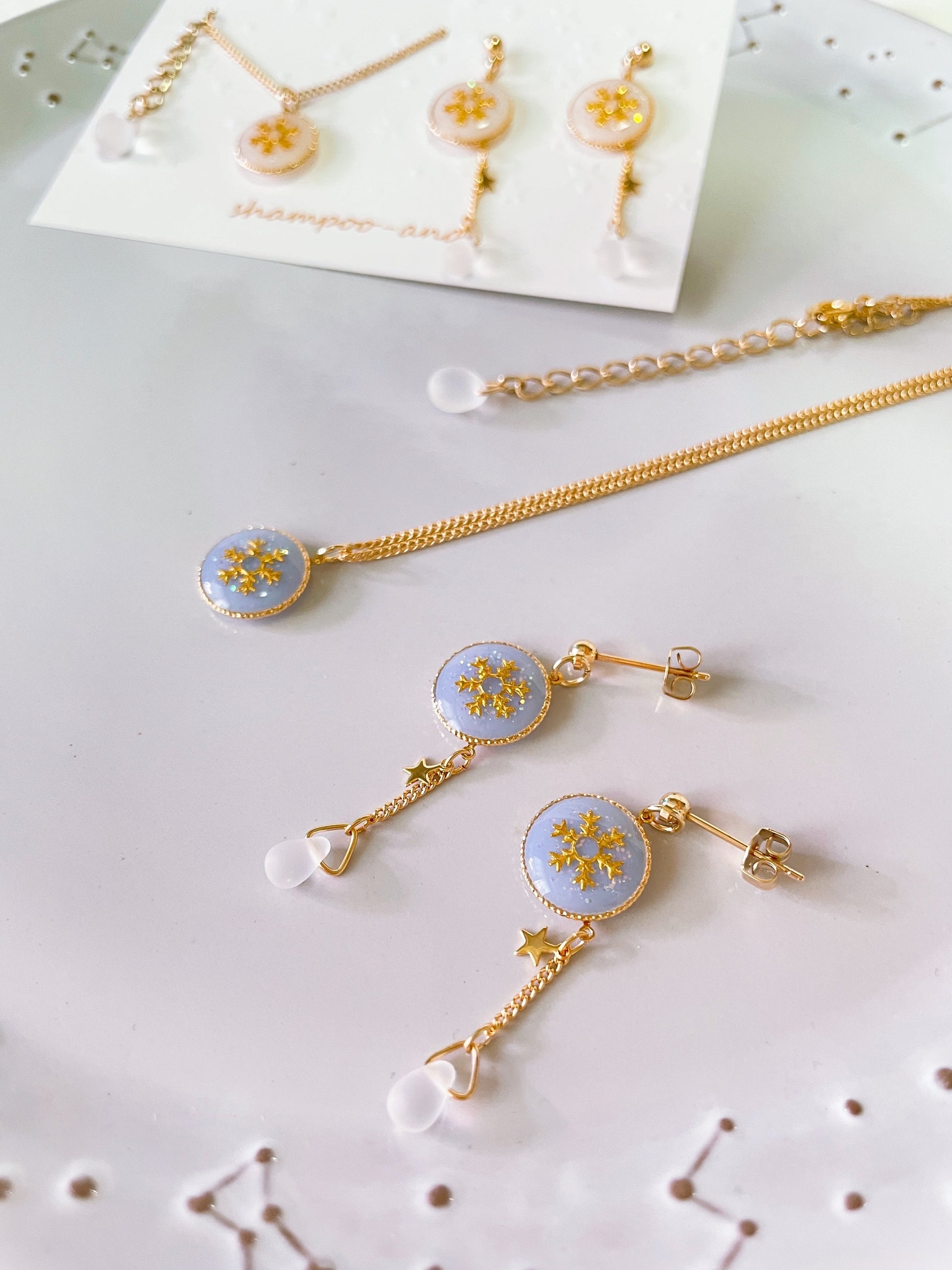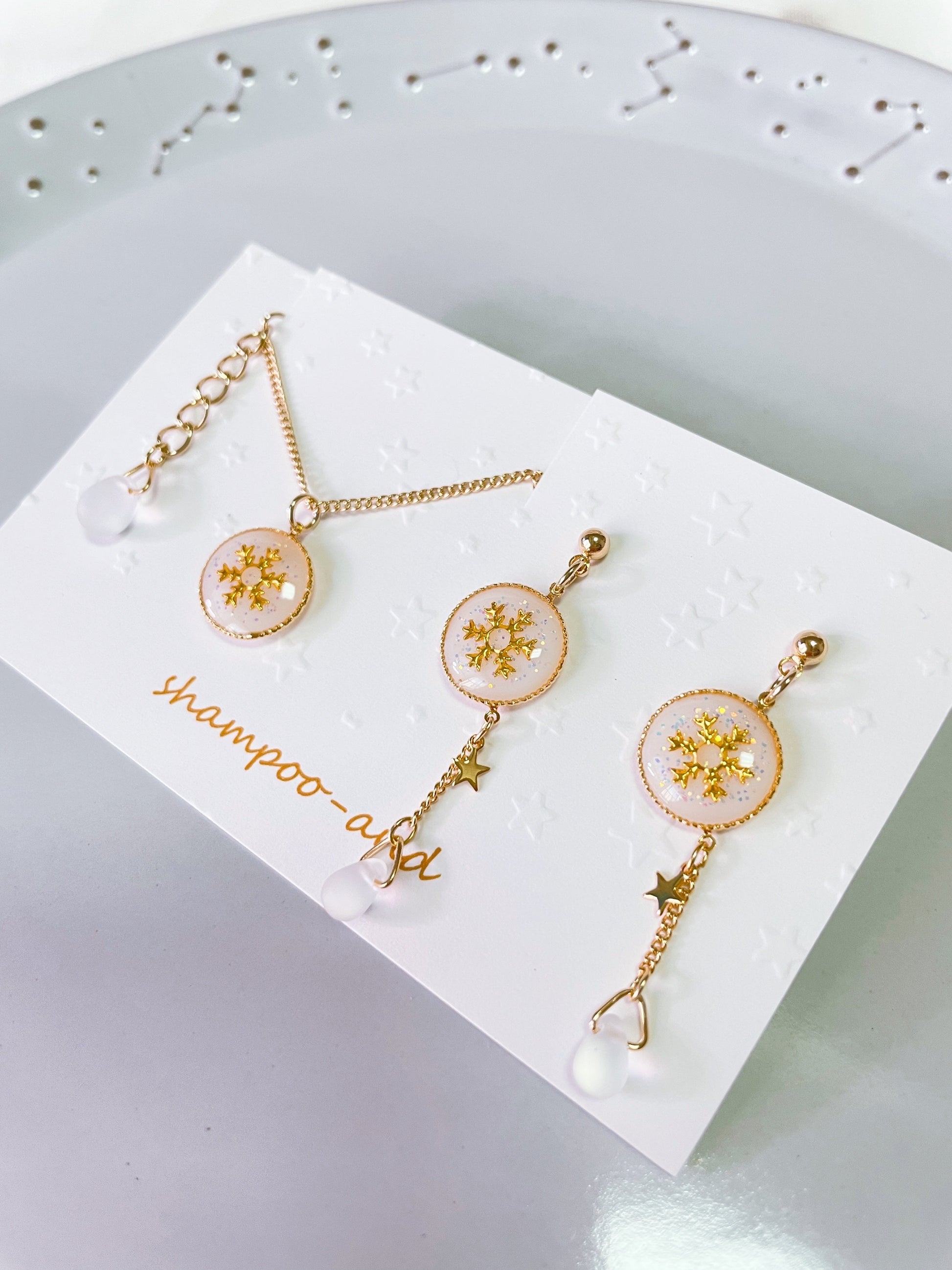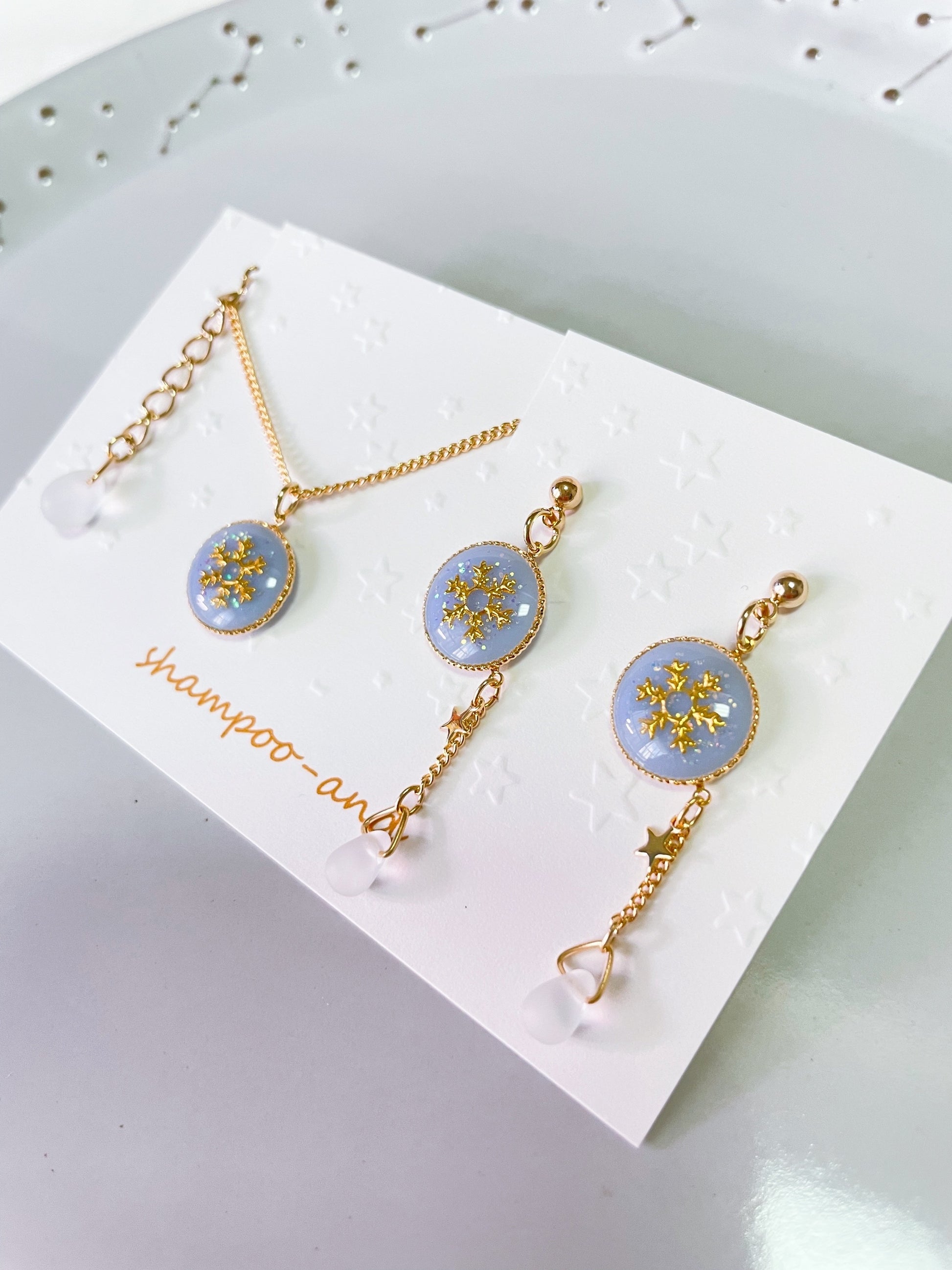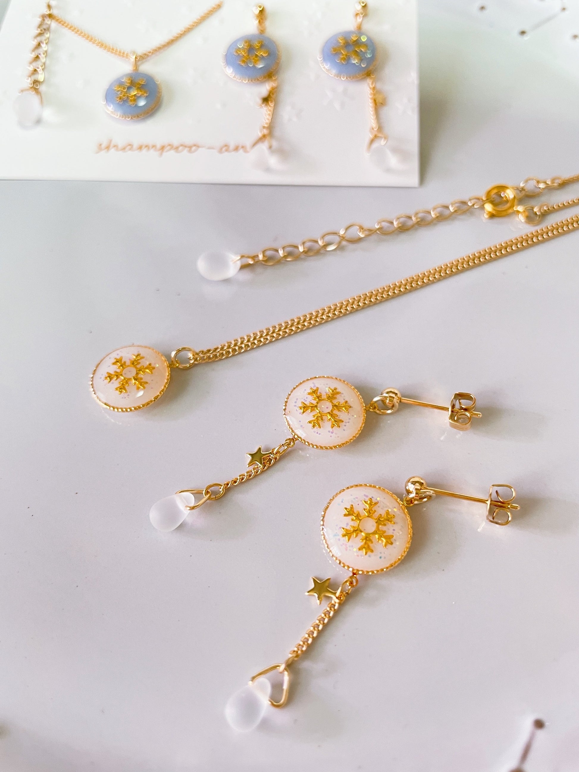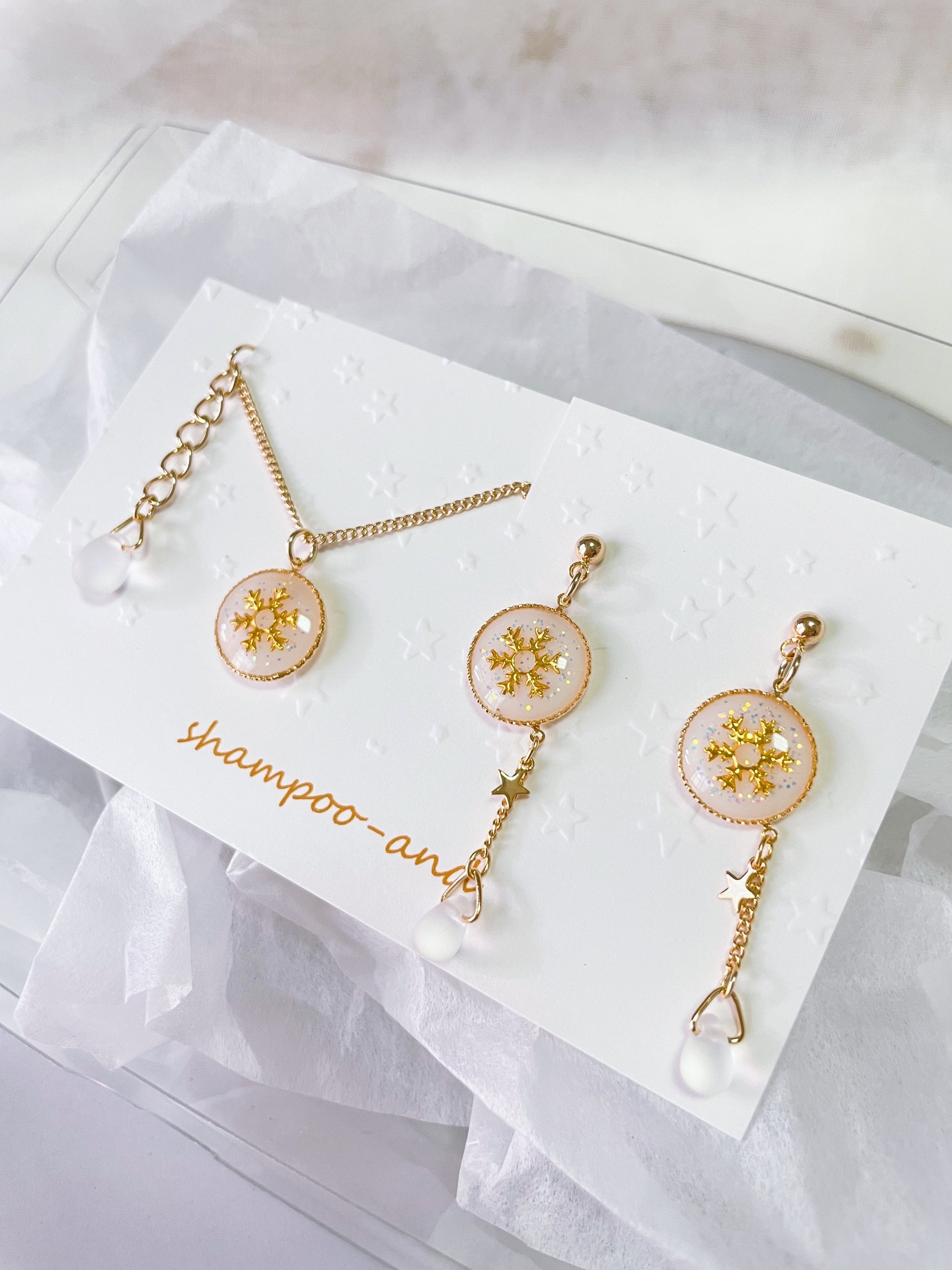 雫のビーズには、雪を思わせるすりガラス風のマット素材を使用しました。