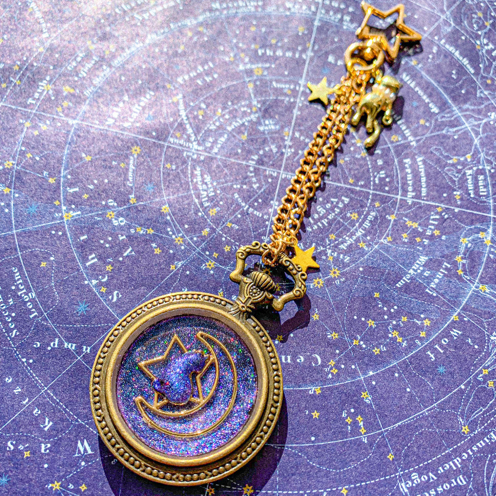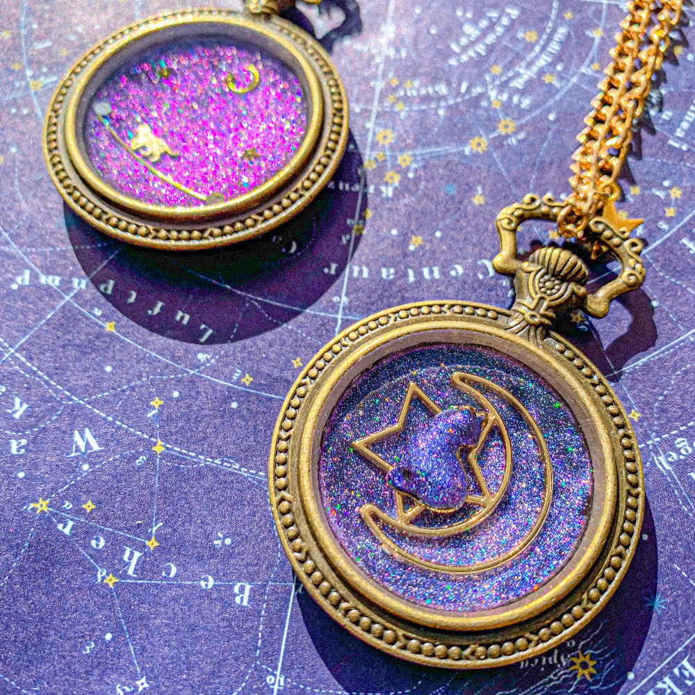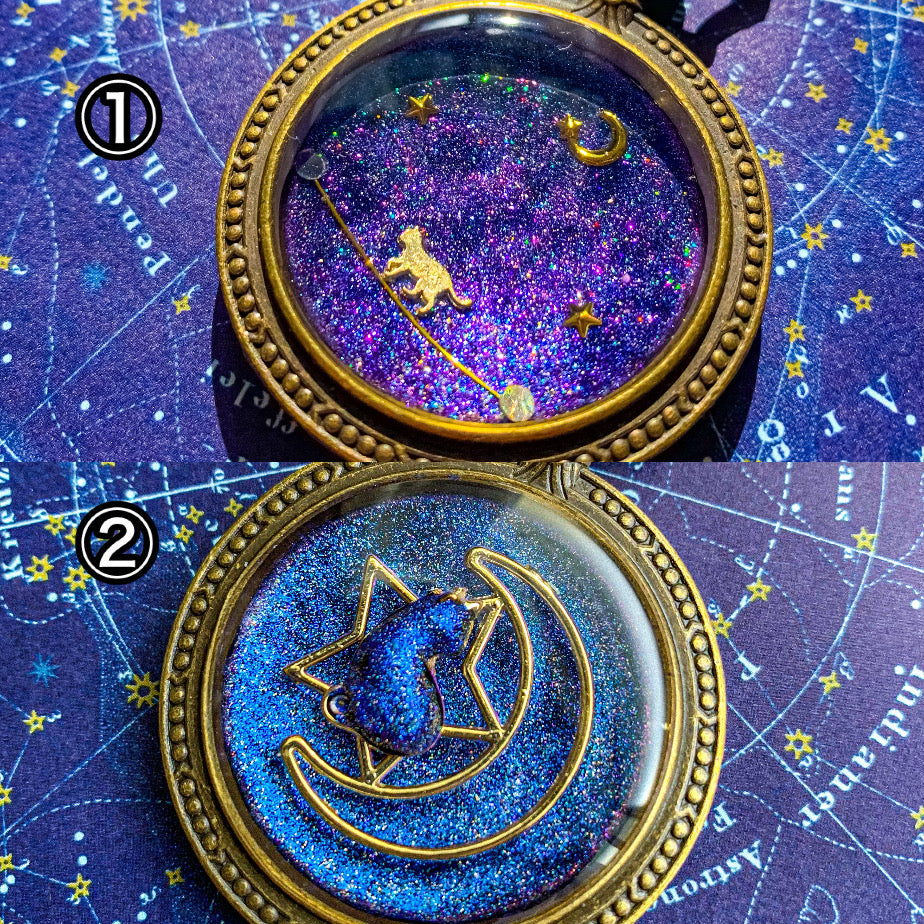アンティークで重厚感のある懐中時計に、満天の星空×猫の物語を閉じ込めて製作した、バッグチャームです