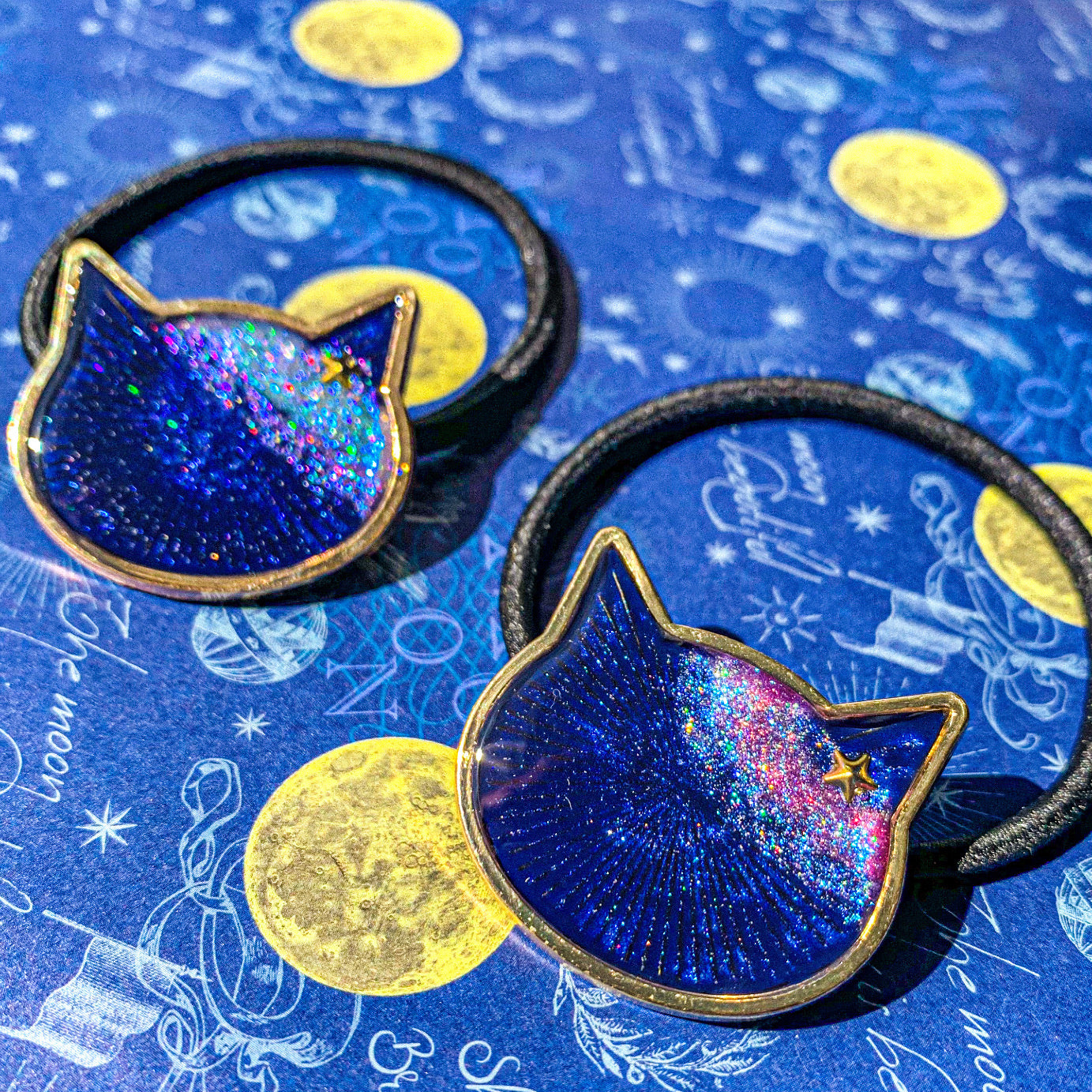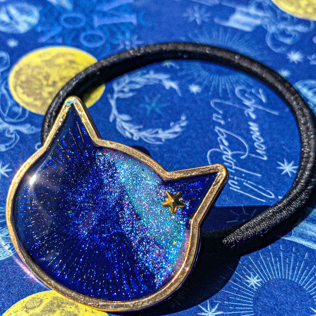 深い星空の青さと天の川の無数の星の輝きを楽しめる、可愛らしいねこ顔のヘアゴム。