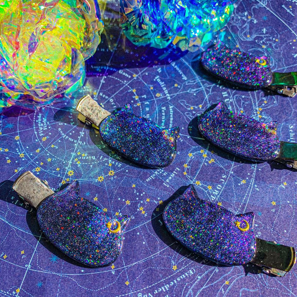 宇宙猫の月・宝石耳飾りヘアクリップ〜 満天の星空に染められて 〜 両サイド2点セット