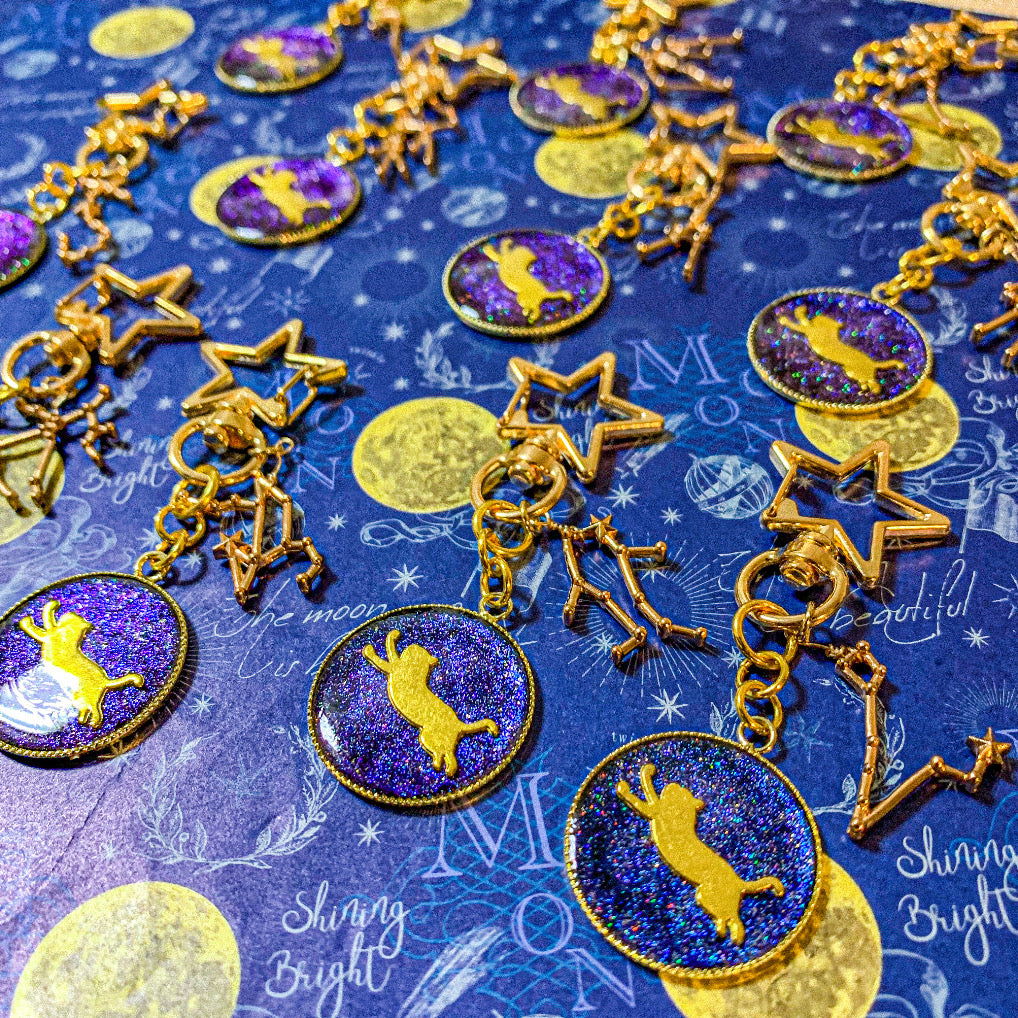 ねこちゃんが12星座に飛びついて、じゃれてるイメージで製作しているキーホルダーです。