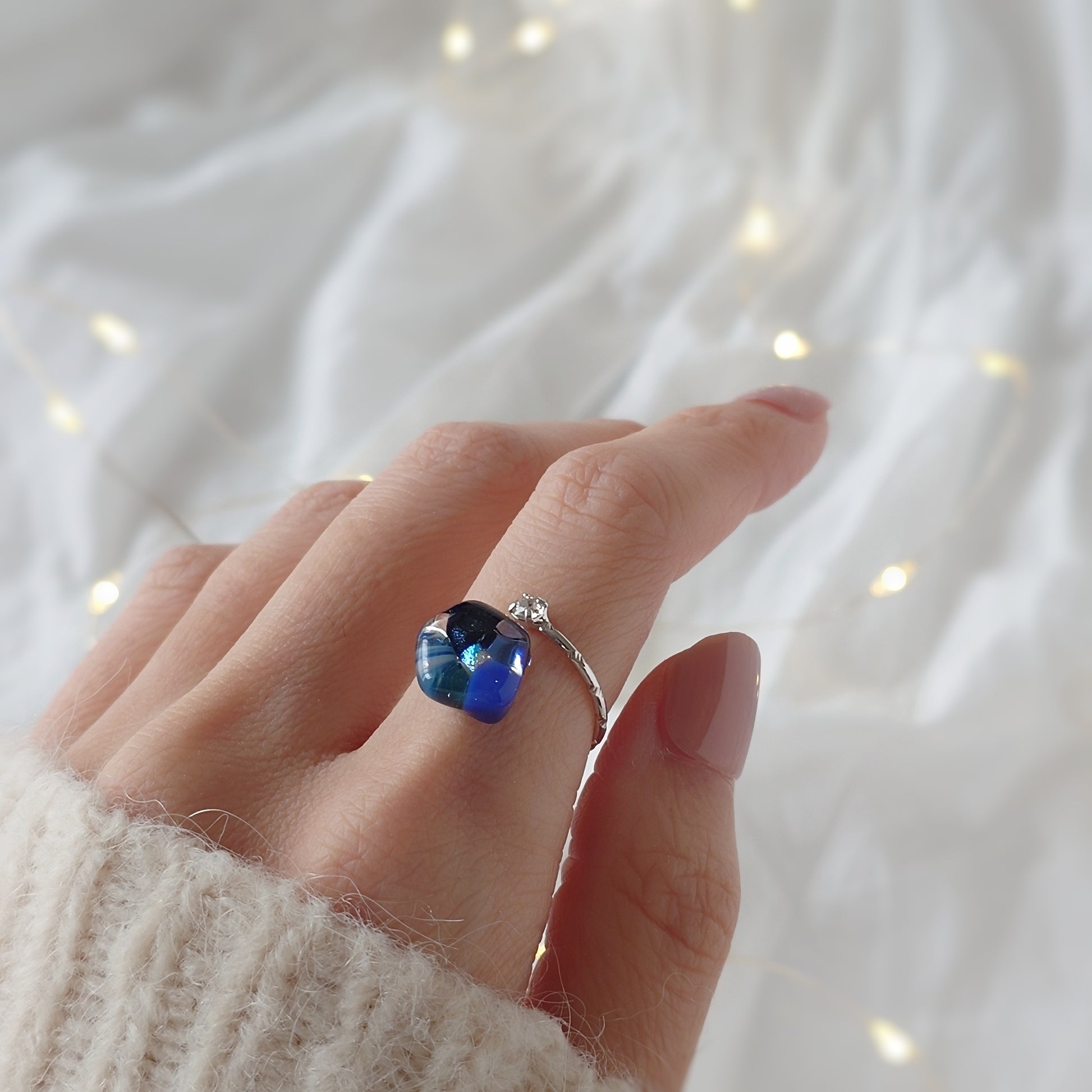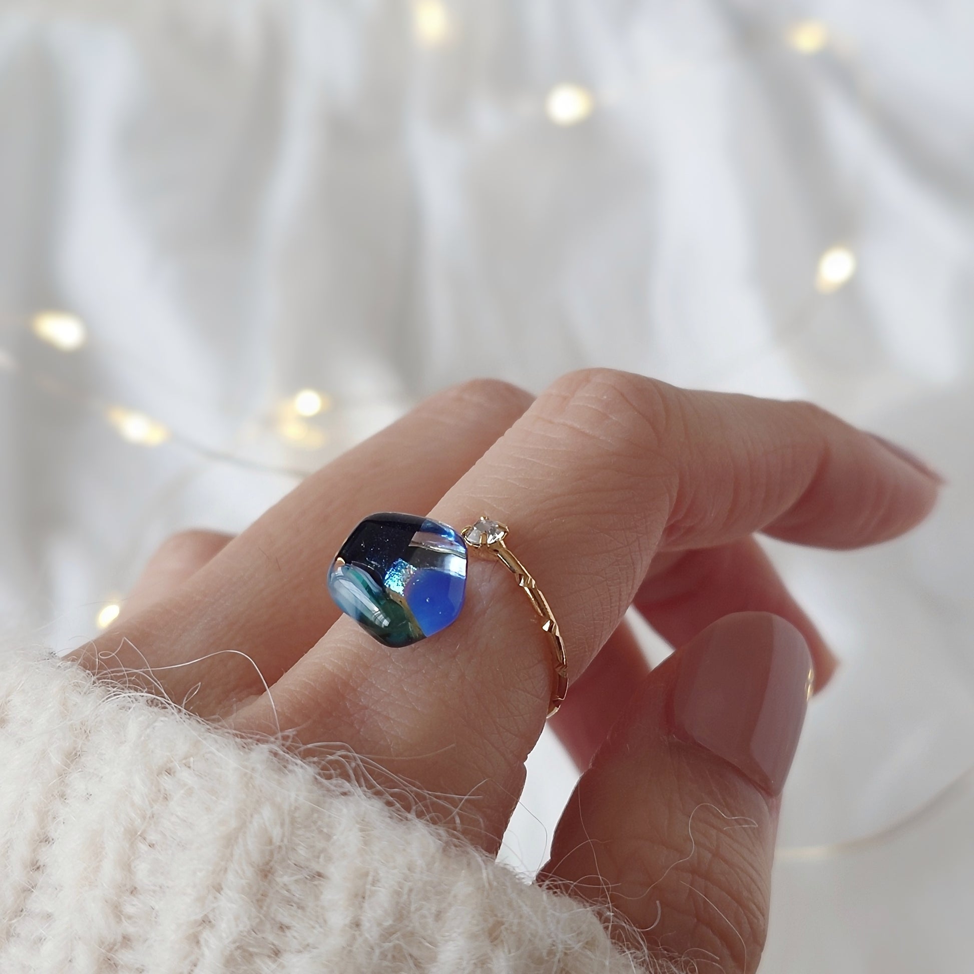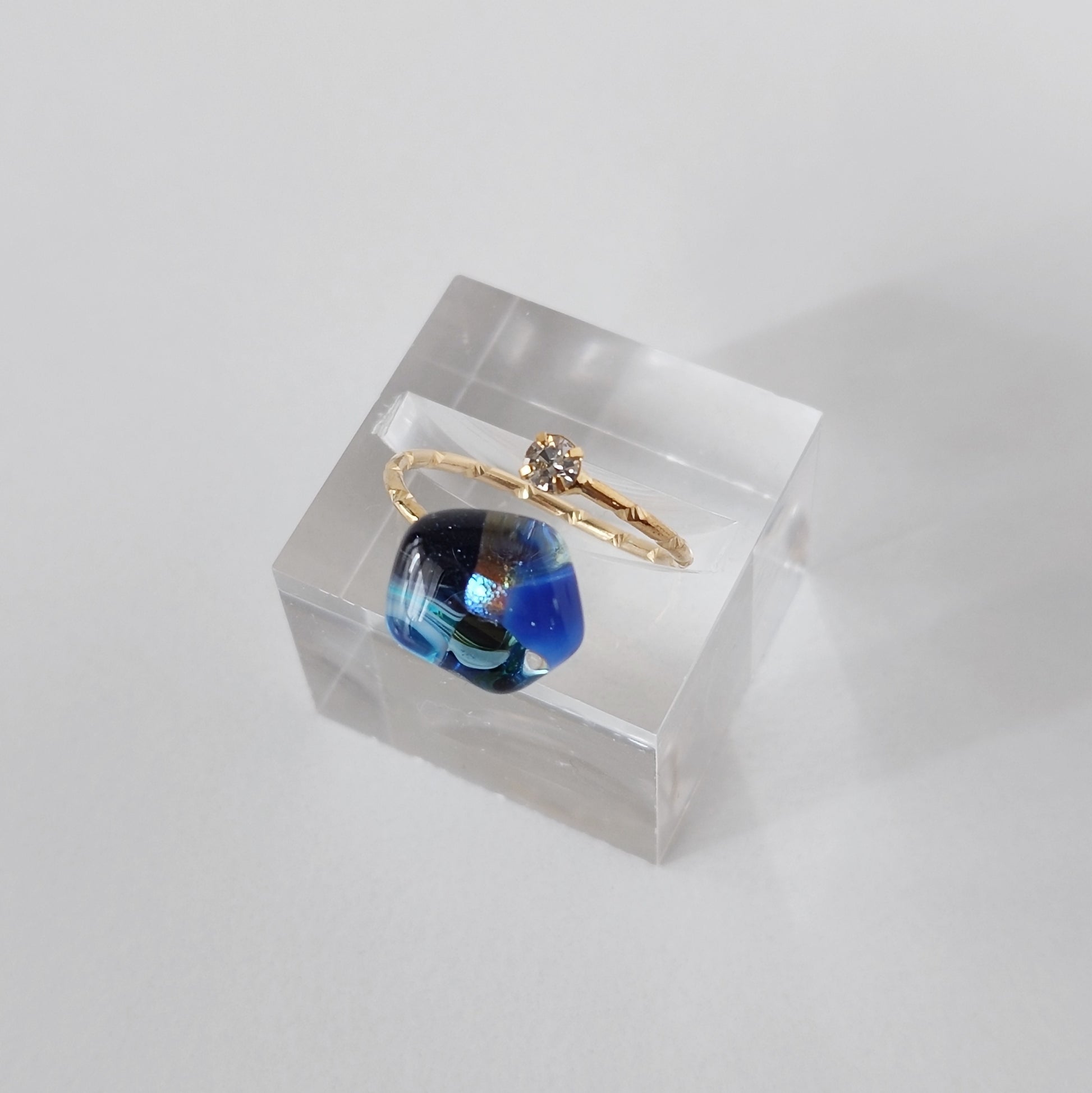 ガラスのカケラをお花のように配置したガラスのリングです。