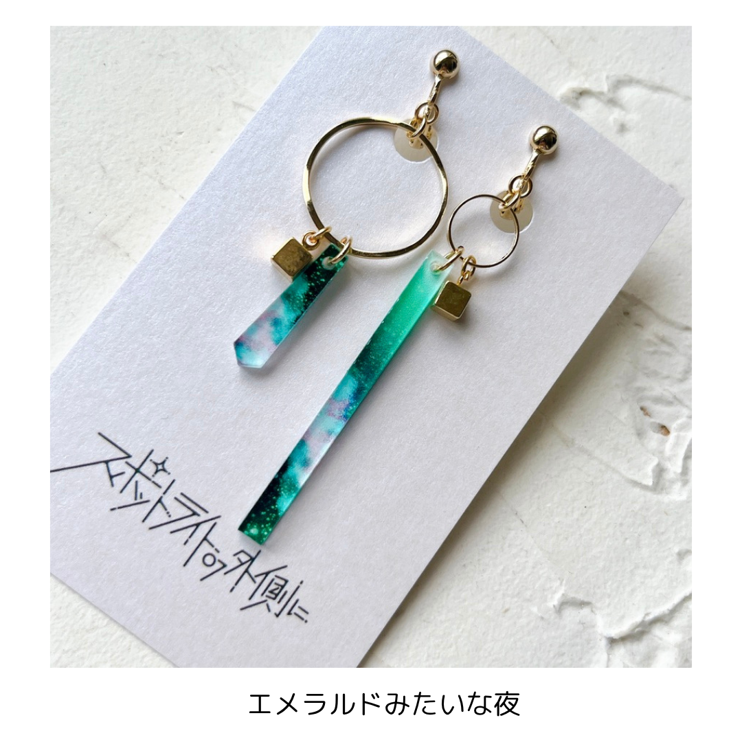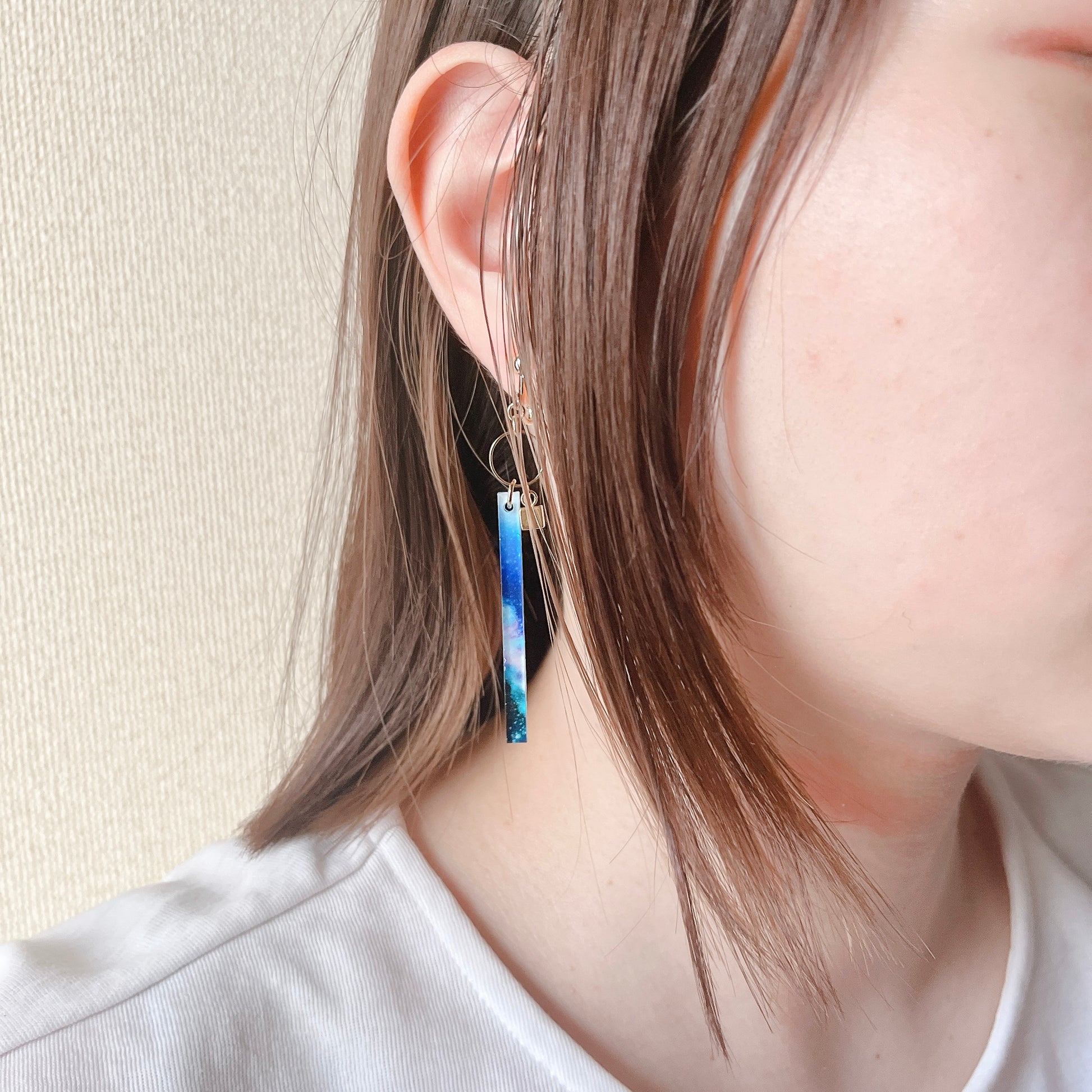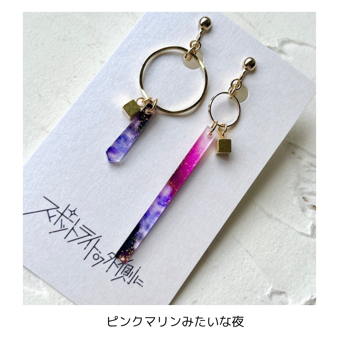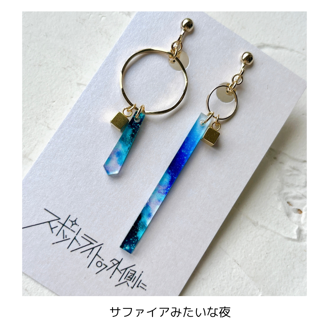 "銀河をそっと閉じ込めたような、アシンメトリーの耳飾り「夜空のカケラ」です。