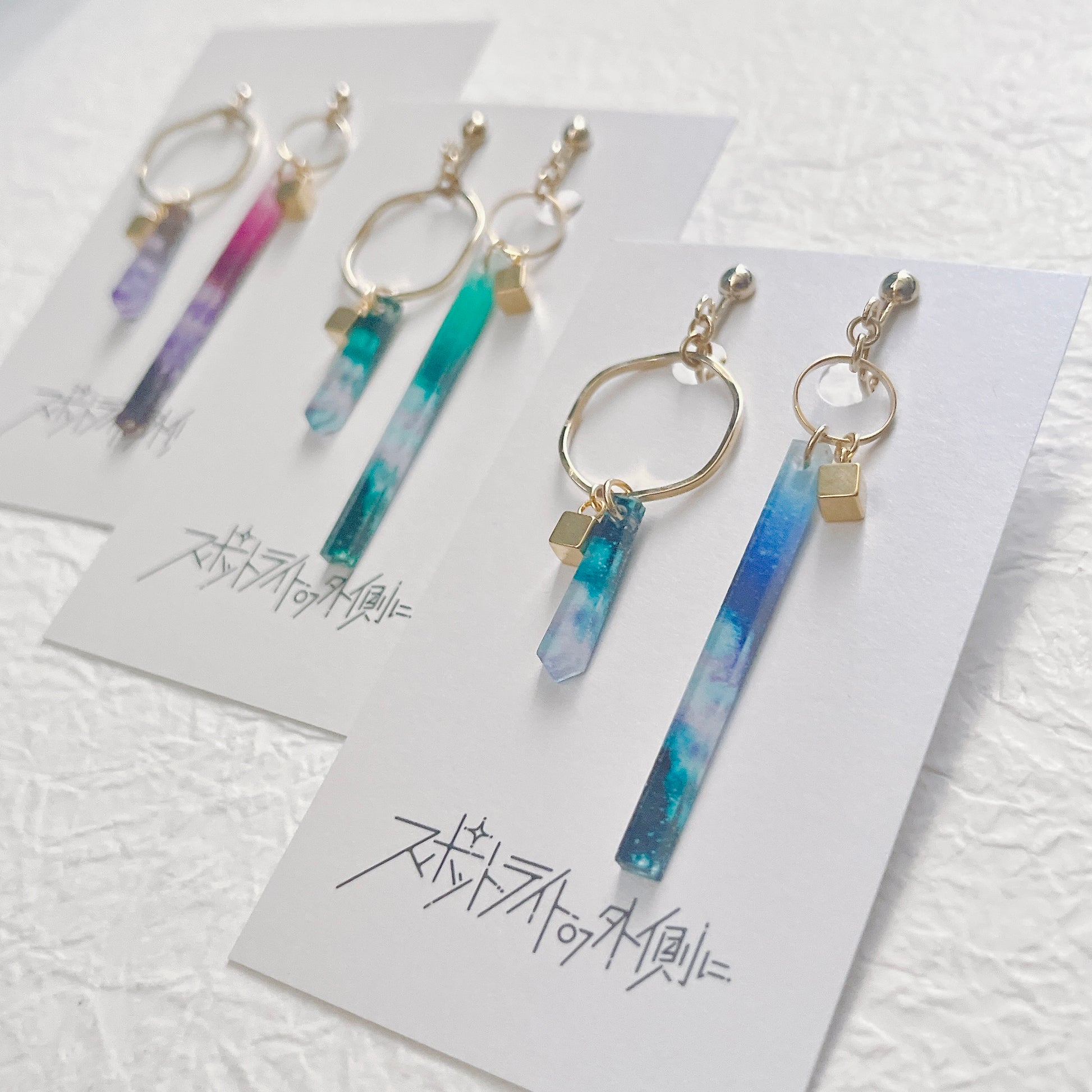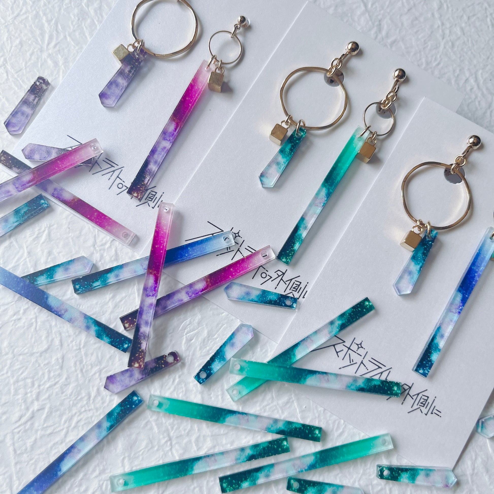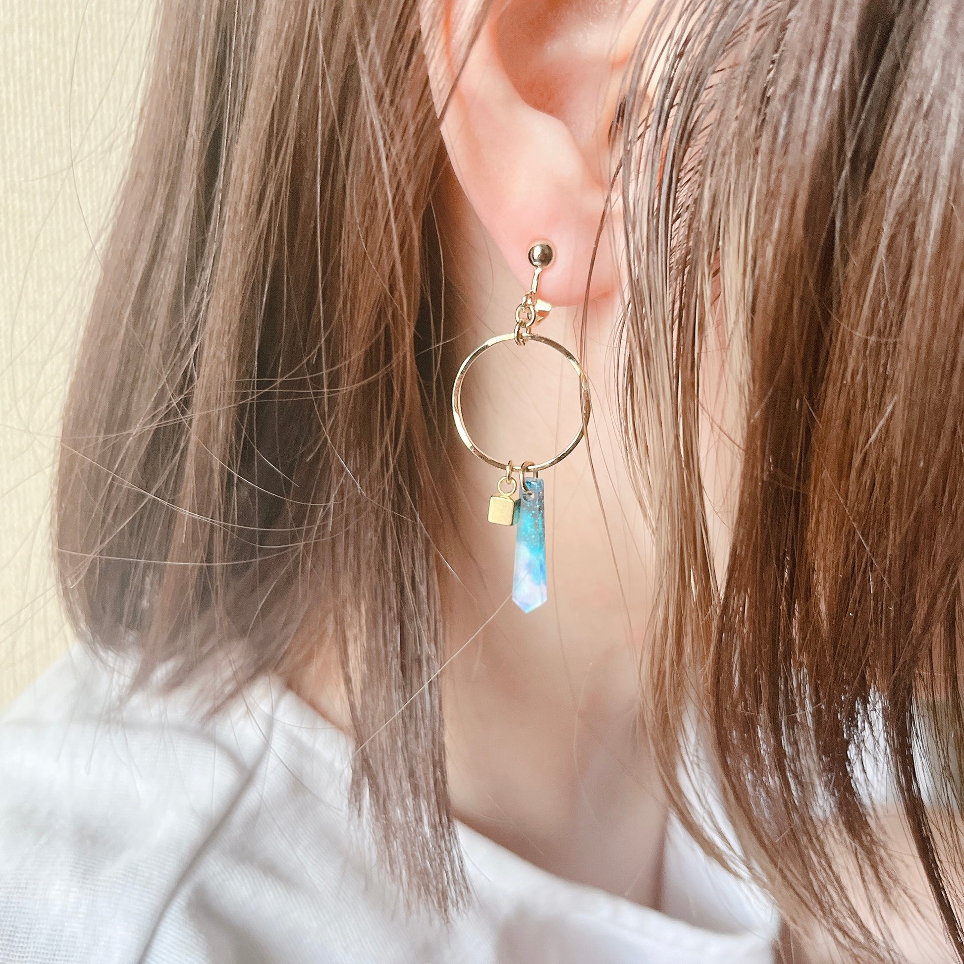 "銀河をそっと閉じ込めたような、アシンメトリーの耳飾り「夜空のカケラ」です。