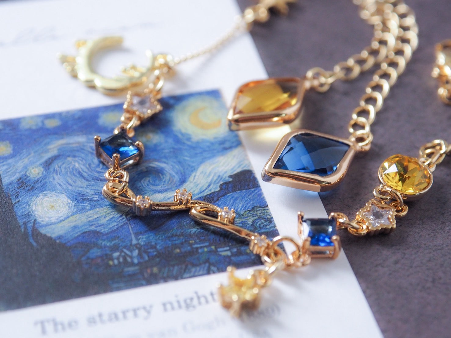 ・作品は全て一点物のハンドメイド作品となっているため、個体差があります。ひとつひとつ強度を確認しながら丁寧にお作りすることを心がけておりますが、強く引っ張るなどの衝撃は破損の原因となりますのでお取り扱いにはご注意ください。