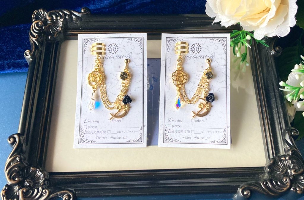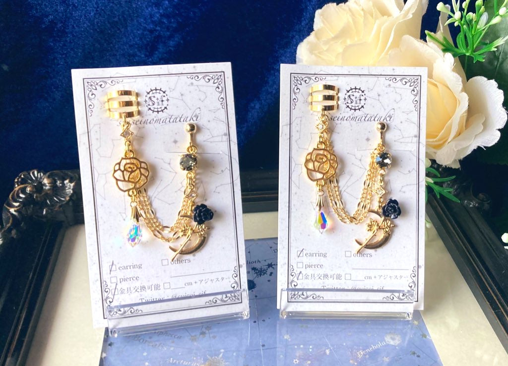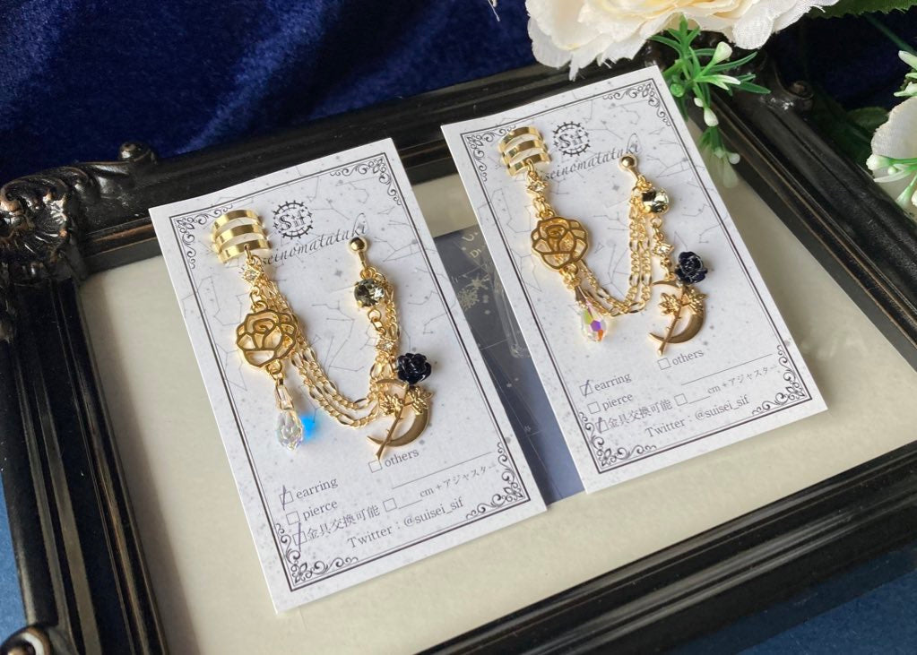 月と薔薇のパーツを使用した、華やかなチェーンイヤーカフです。
