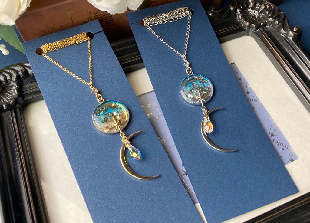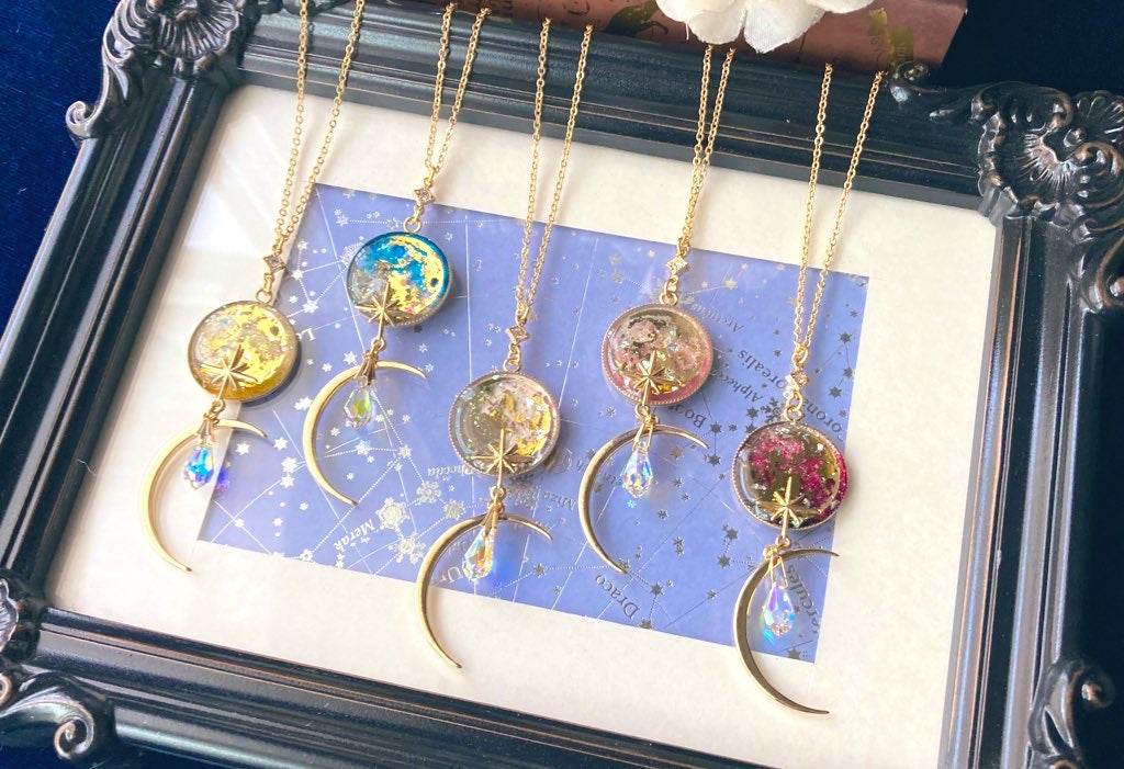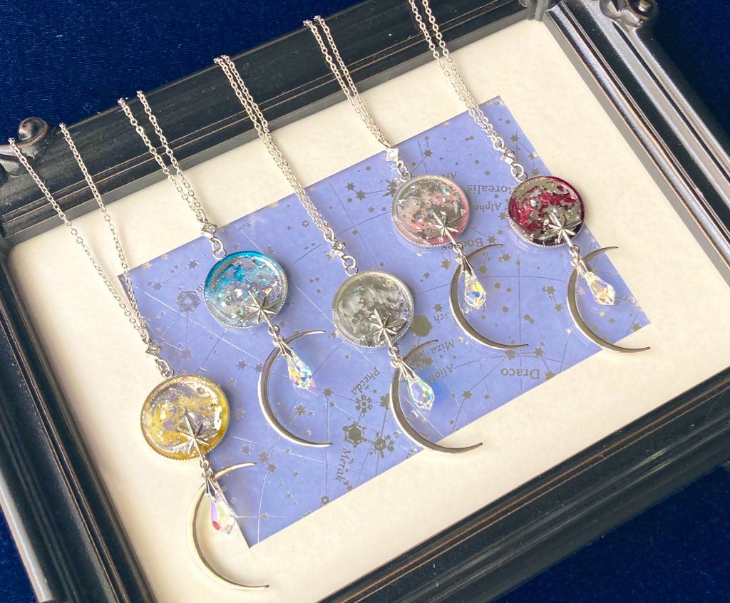 鋭い月光をイメージして、5種類の満月をペンダントにお仕立てしました。