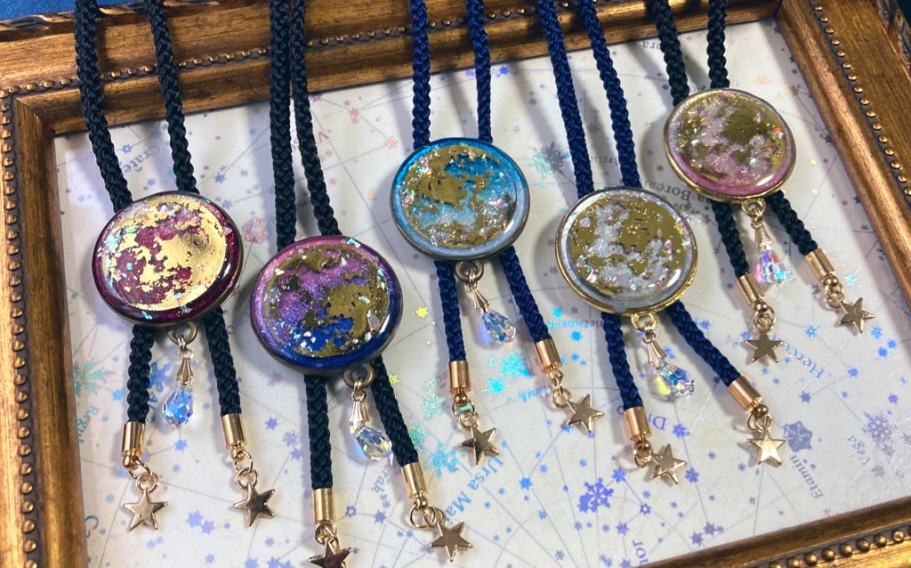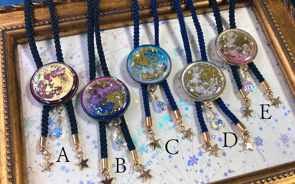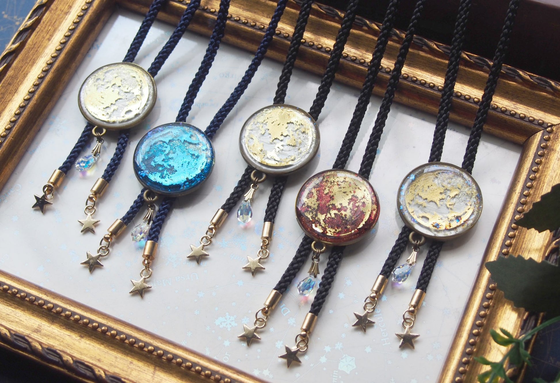 それぞれ月の背景の色、紐の色、金具色の組み合わせを変更している、一点ものになります。