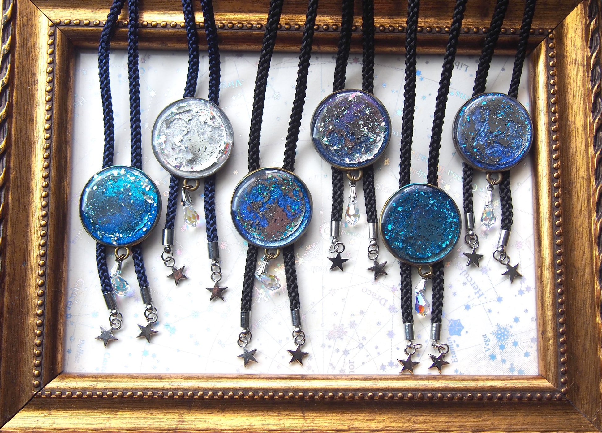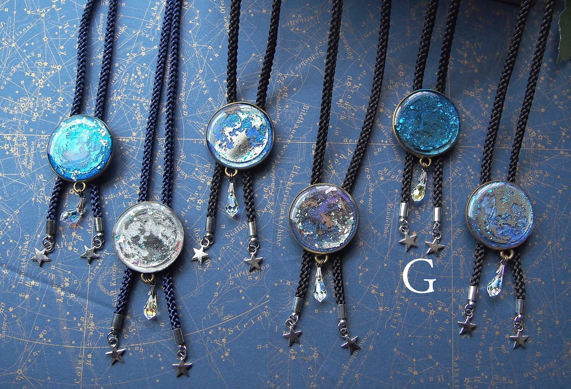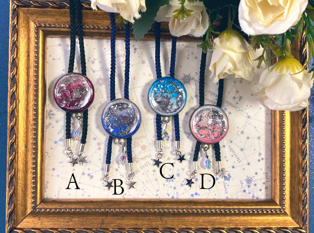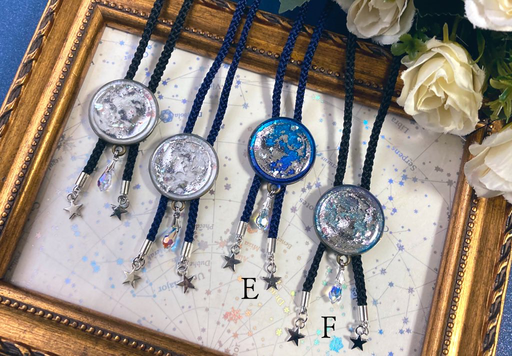 それぞれ月の背景の色、紐の色、金具色の組み合わせを変更している、一点ものになります。