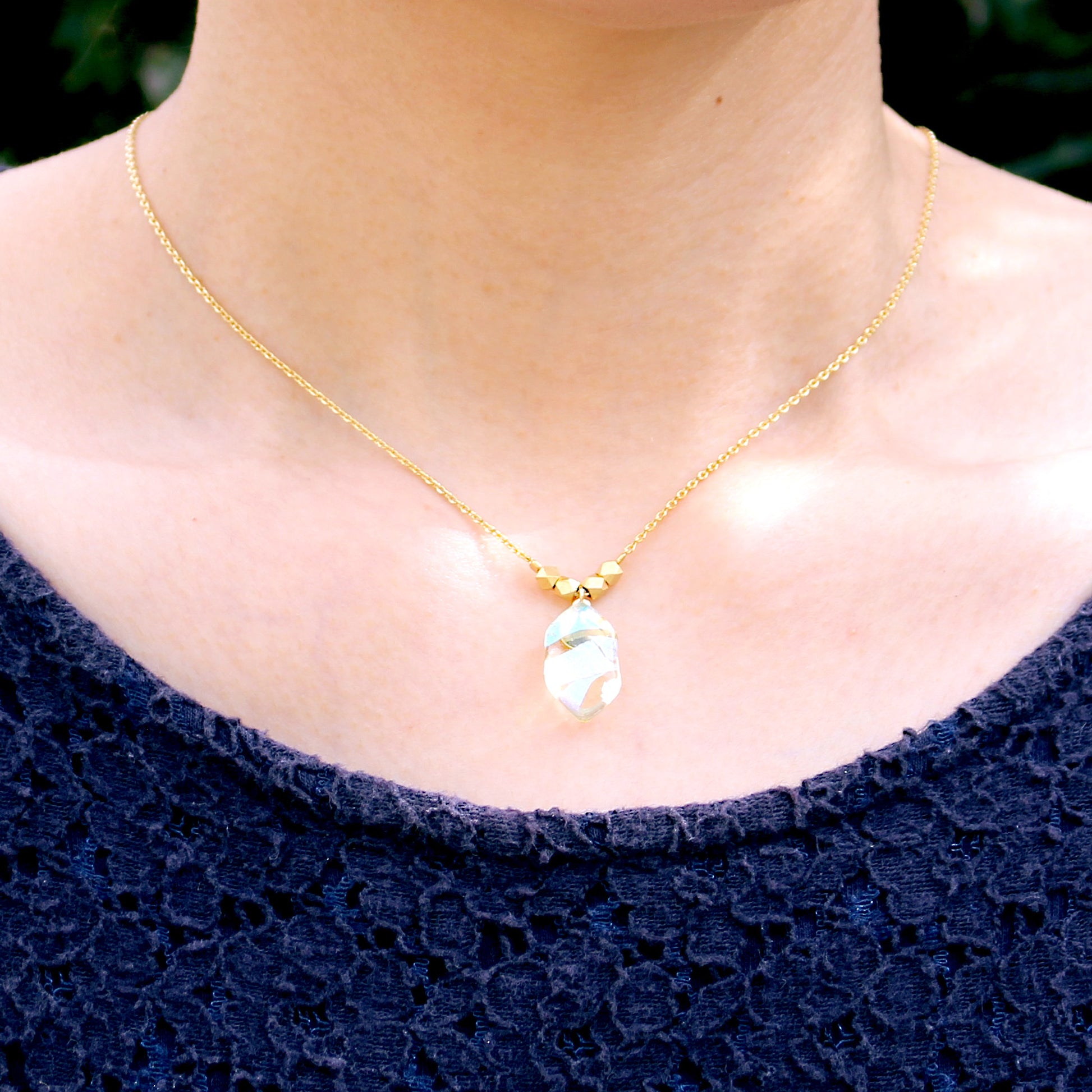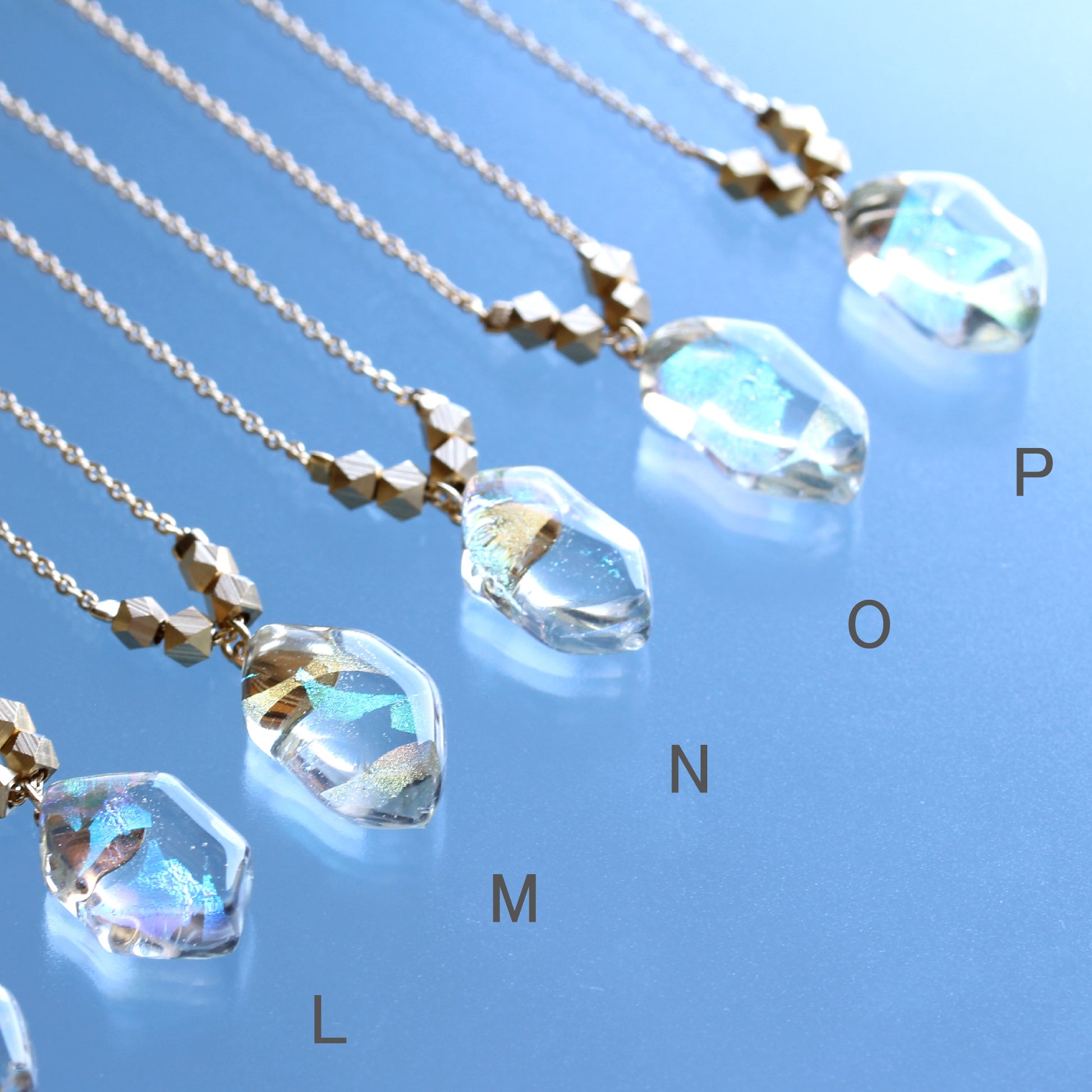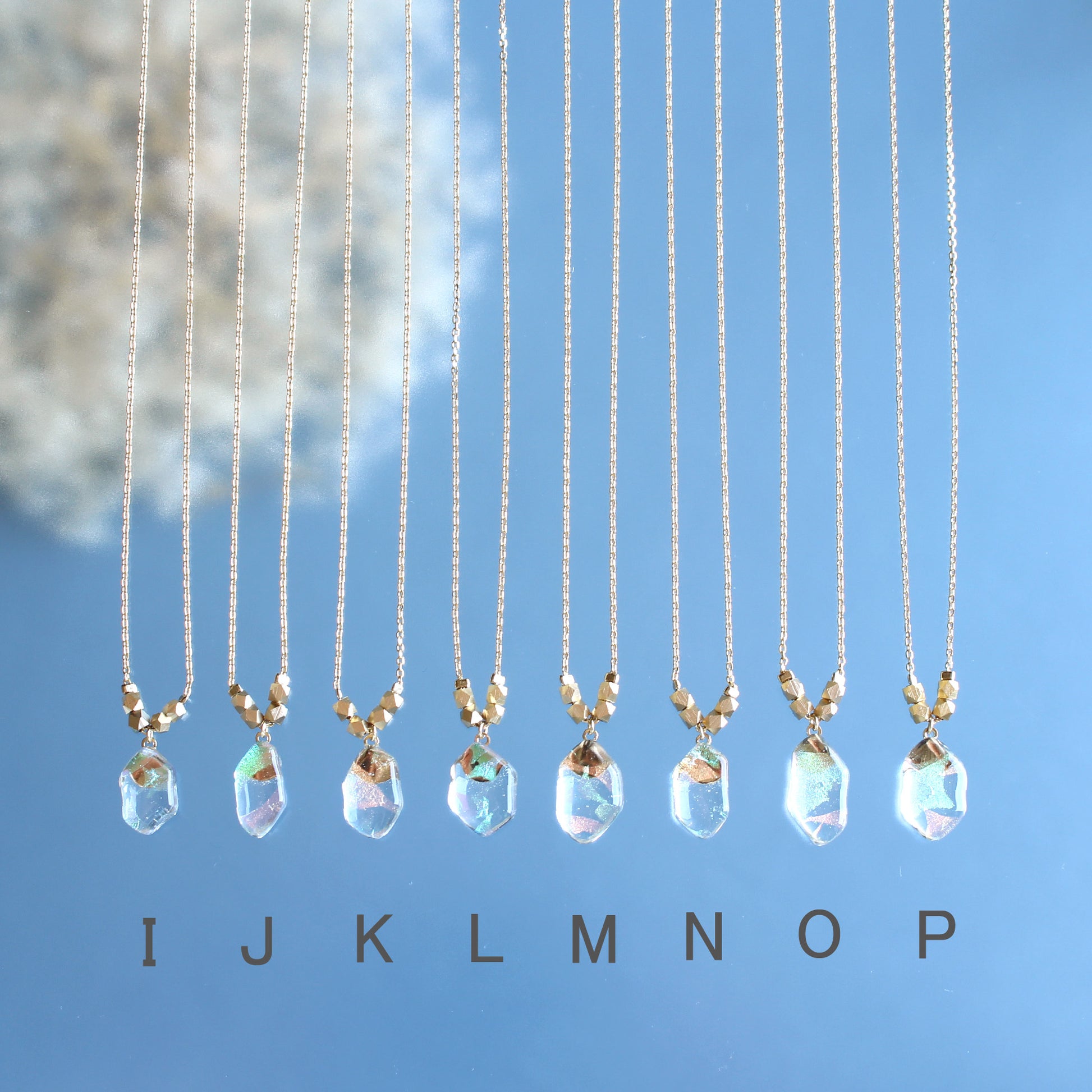 I〜P → 透明ガラスがベースになったネックレス。