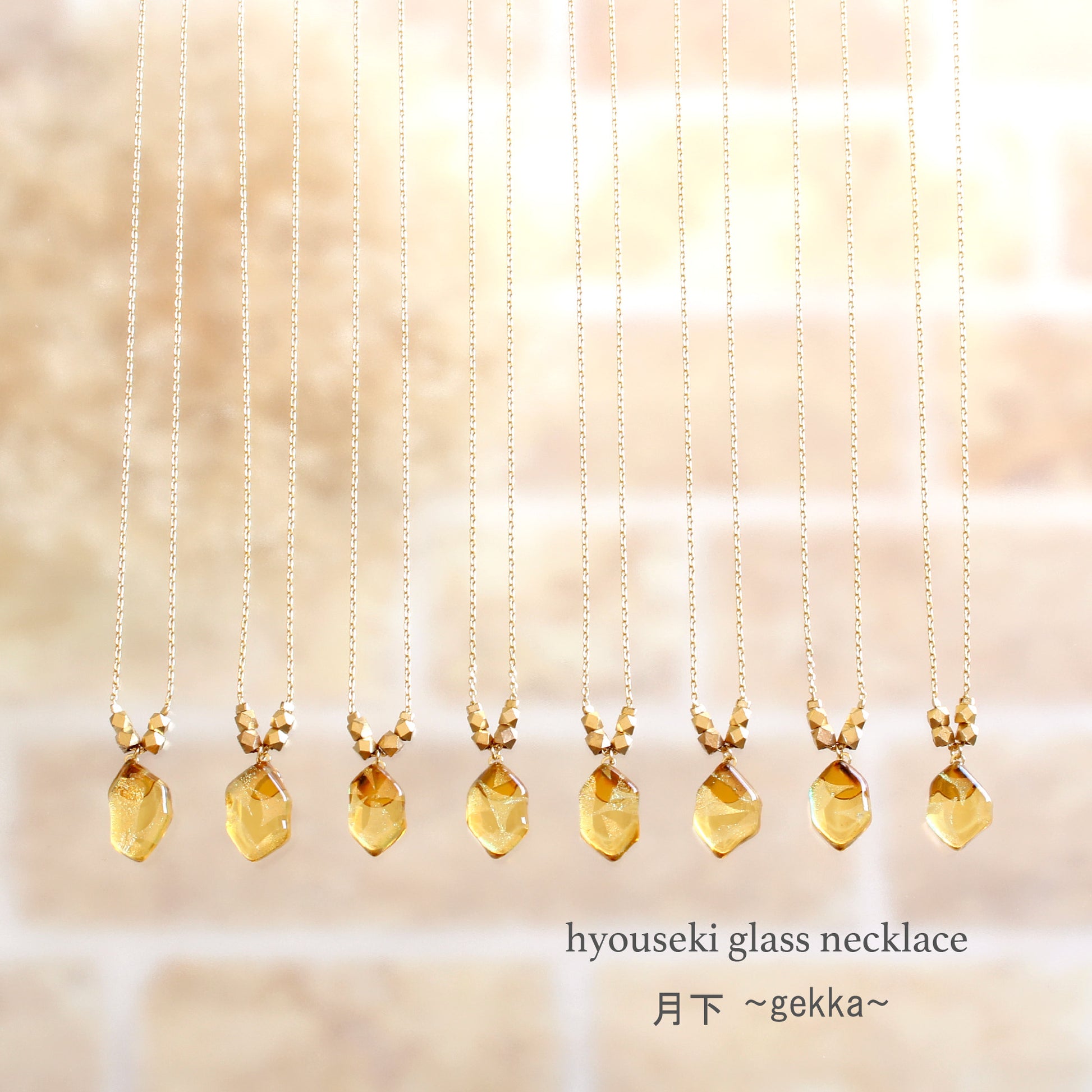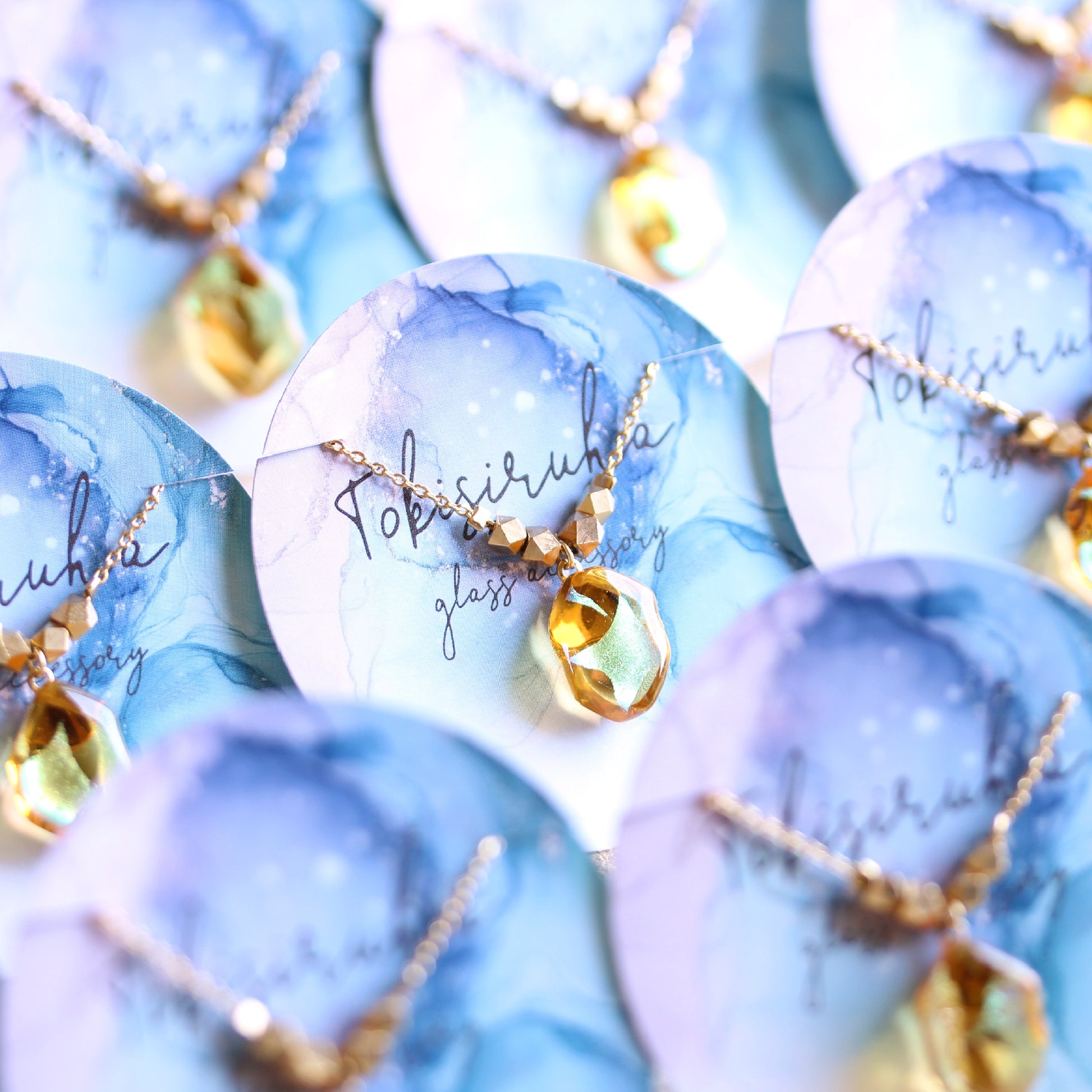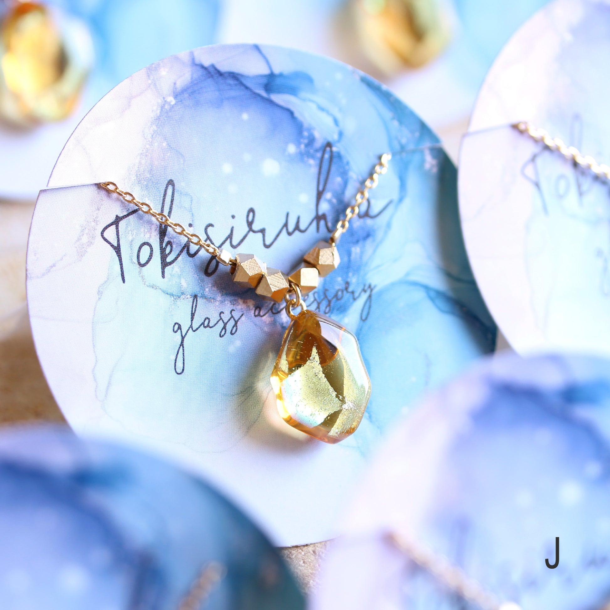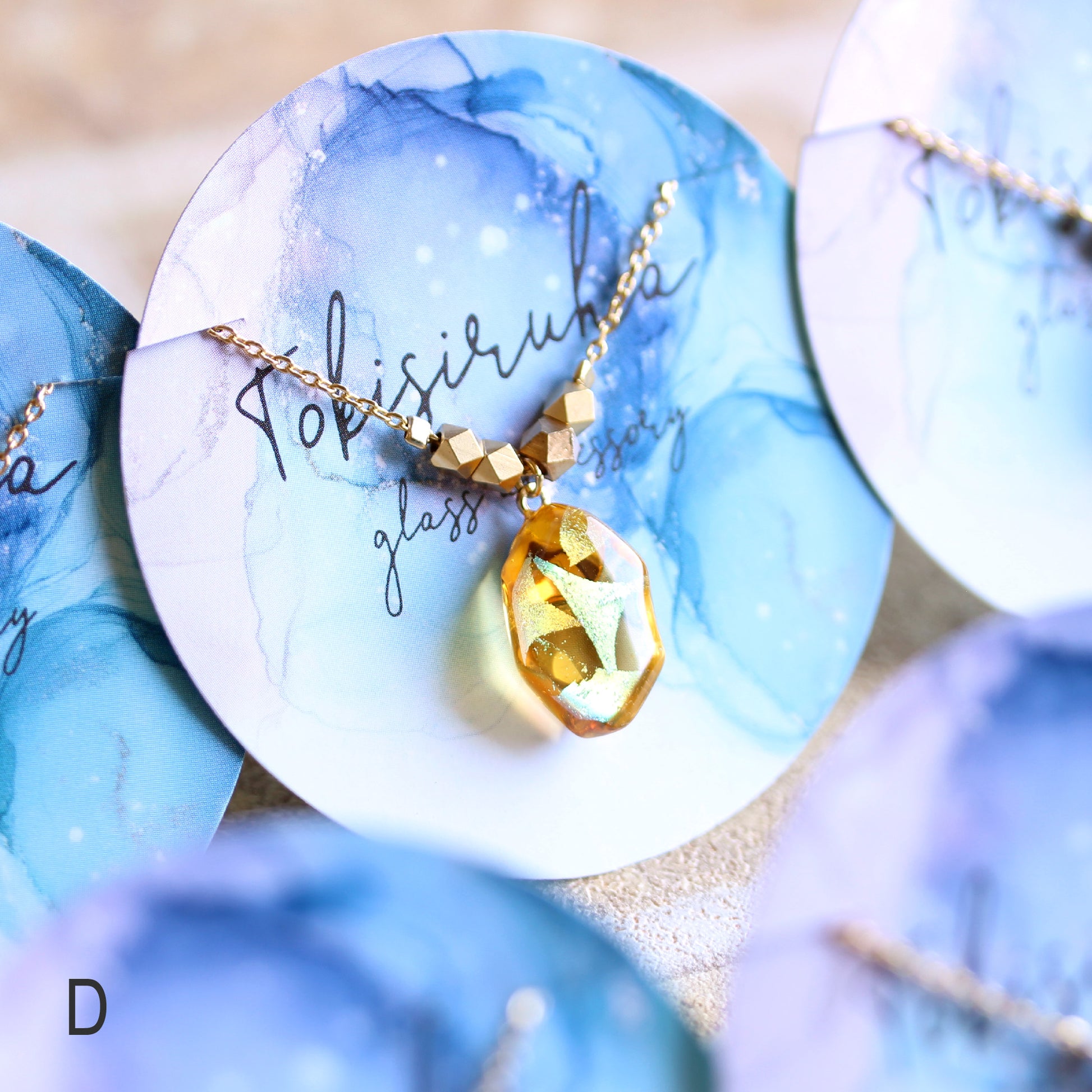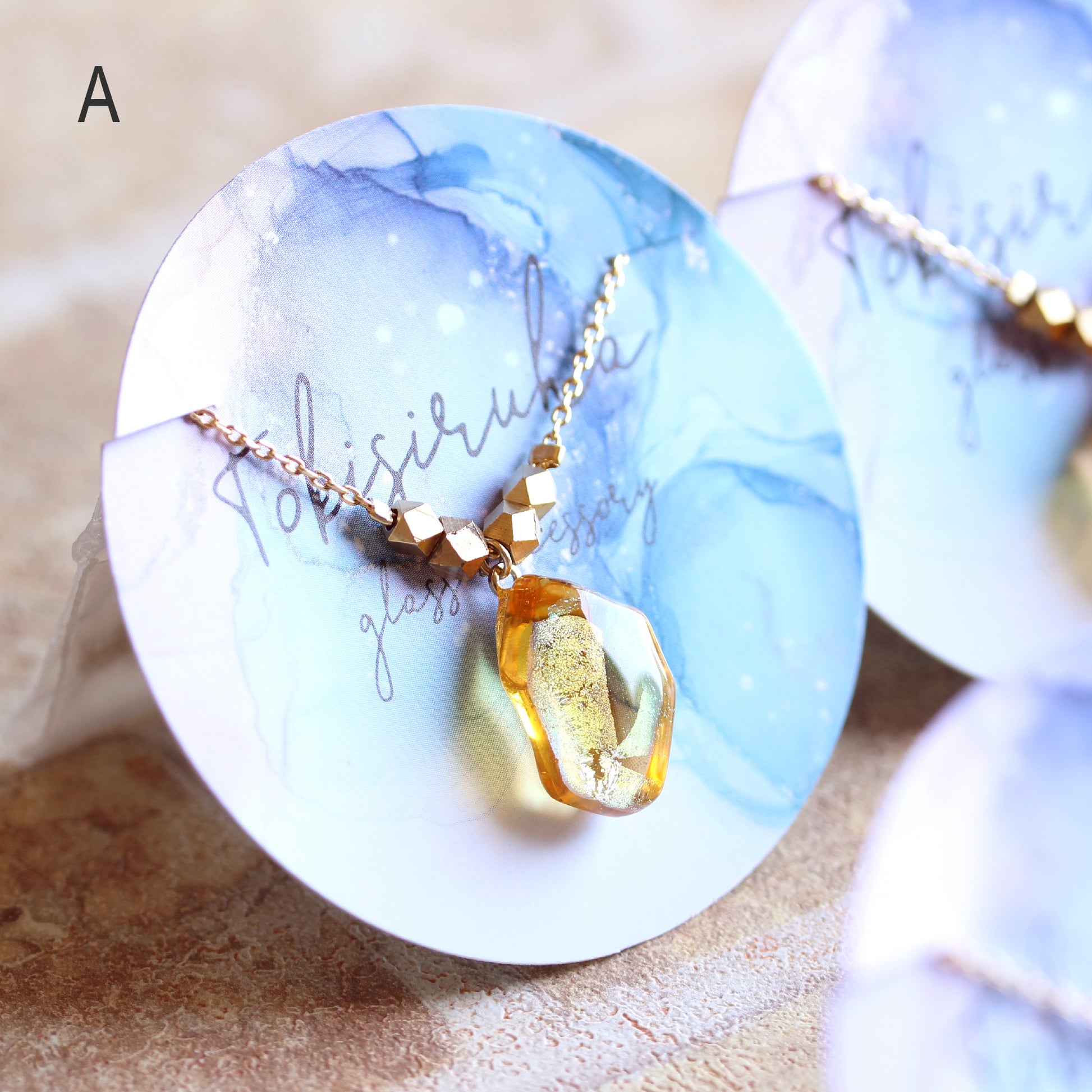 ガラスを重ねて窯の中で800℃に熱して溶かした素材を一つ一つ丁寧にカットして磨きあげ、パーツに通しアクセサリーに仕上げています。