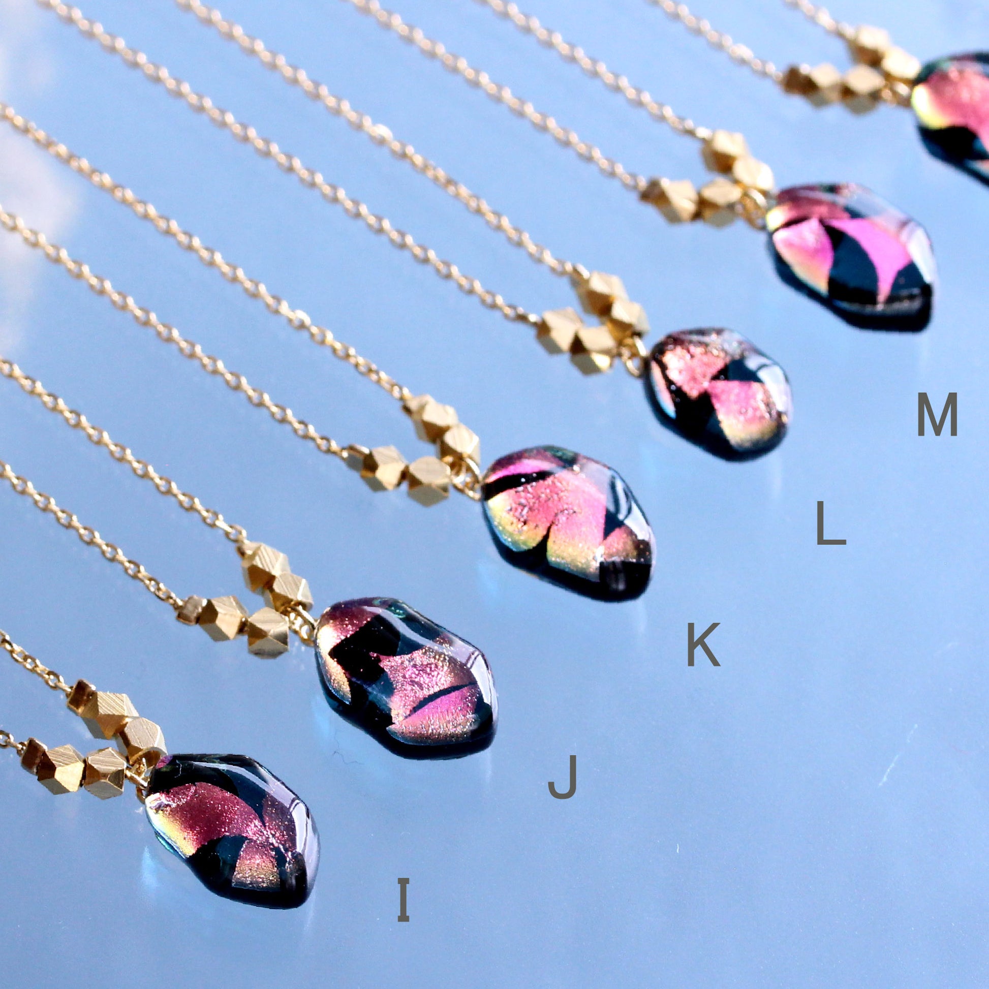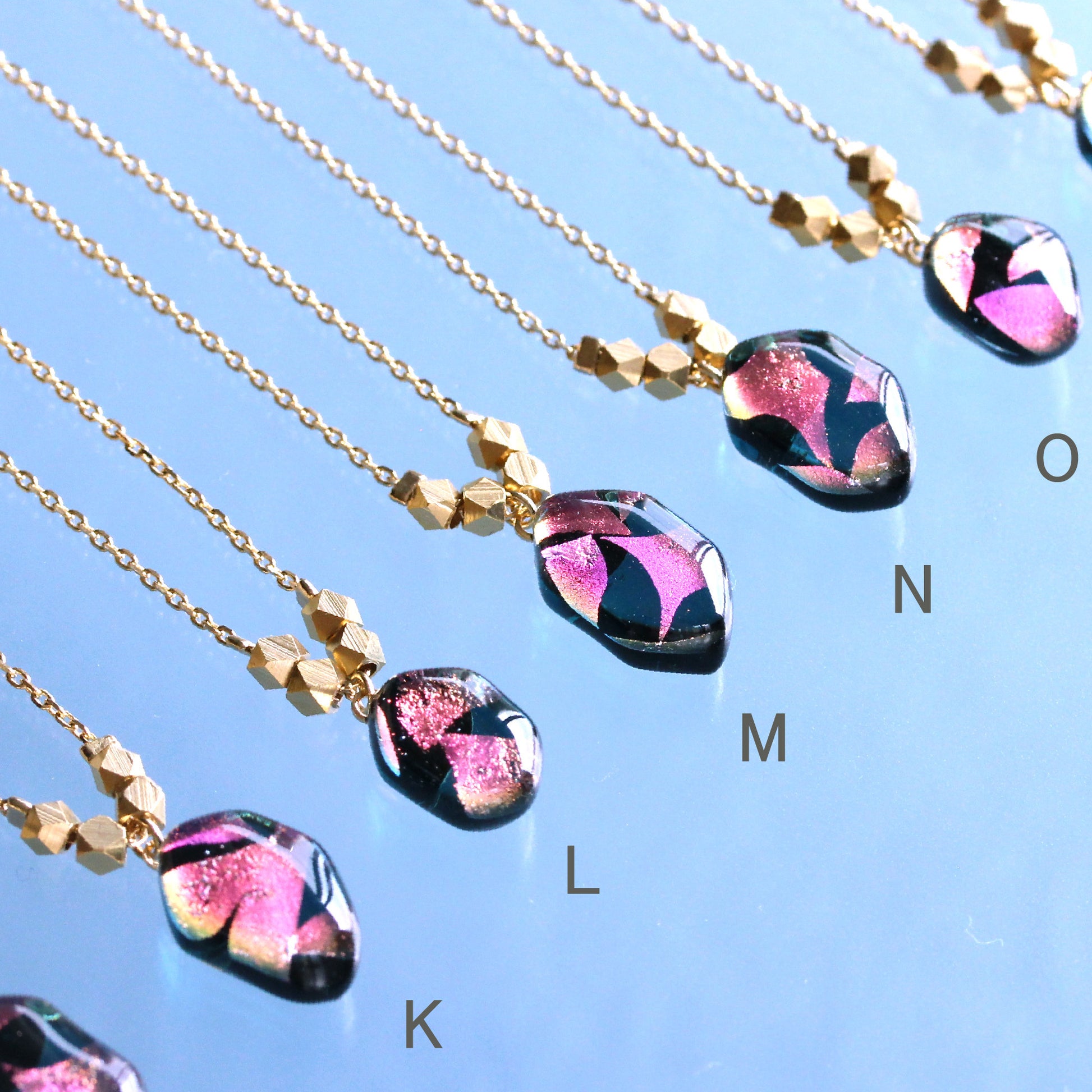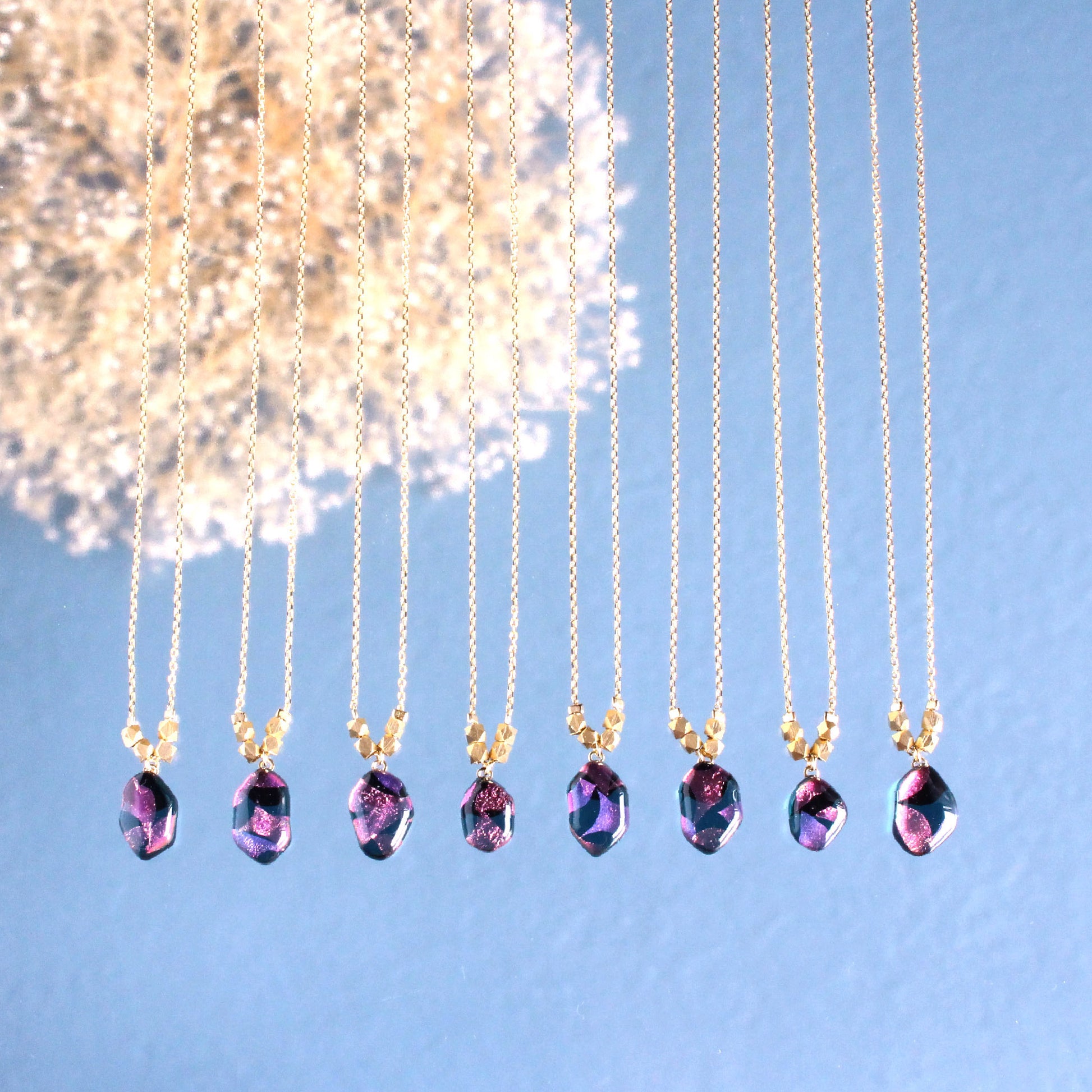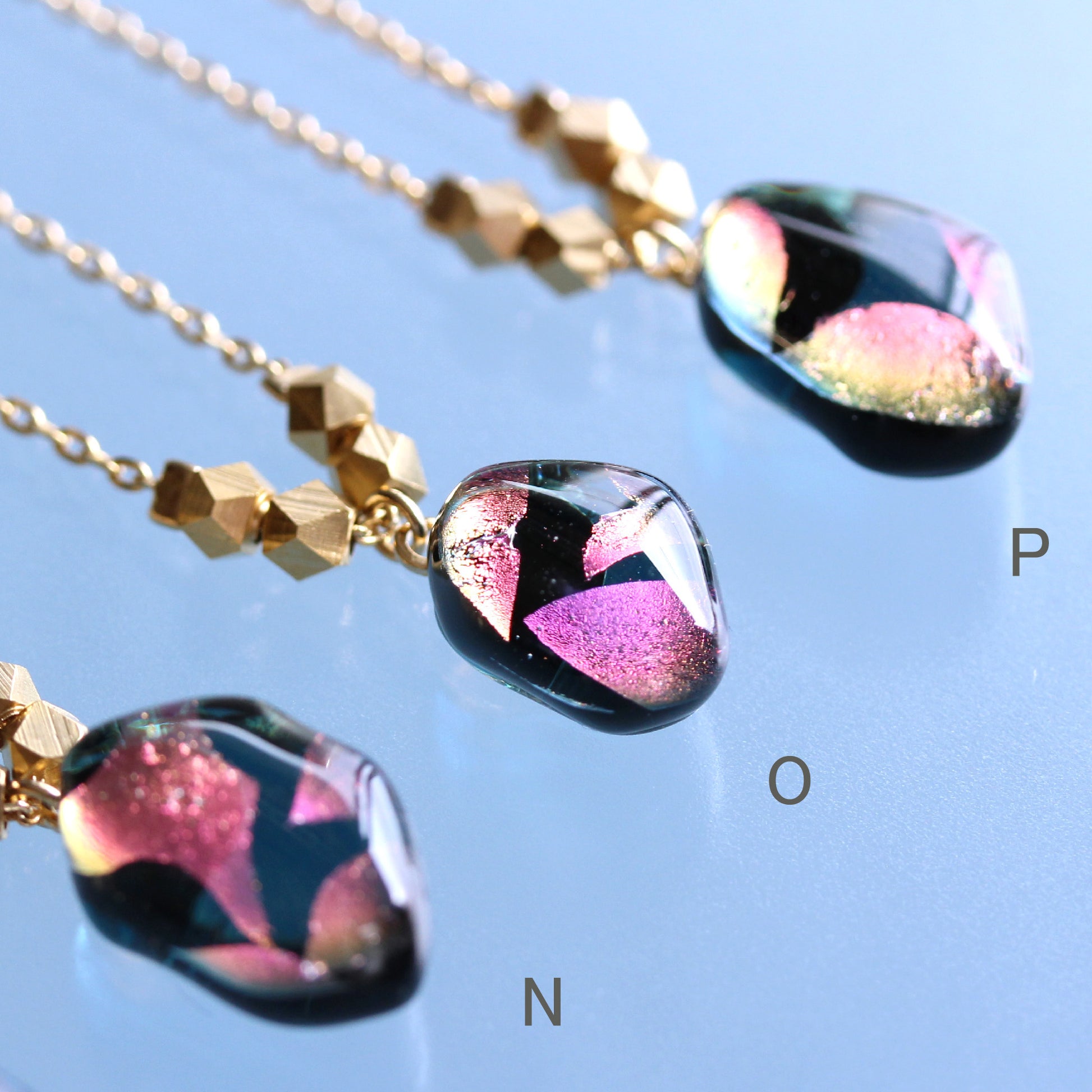 ガラスを重ねて窯の中で800℃に熱して溶かした素材を一つ一つ丁寧に磨きあげ、パーツに通しアクセサリーに仕上げています。小さな小さな一粒ですが中に浮かび上がる箔の輝きはまるで銀河のような煌めきを放っております。
