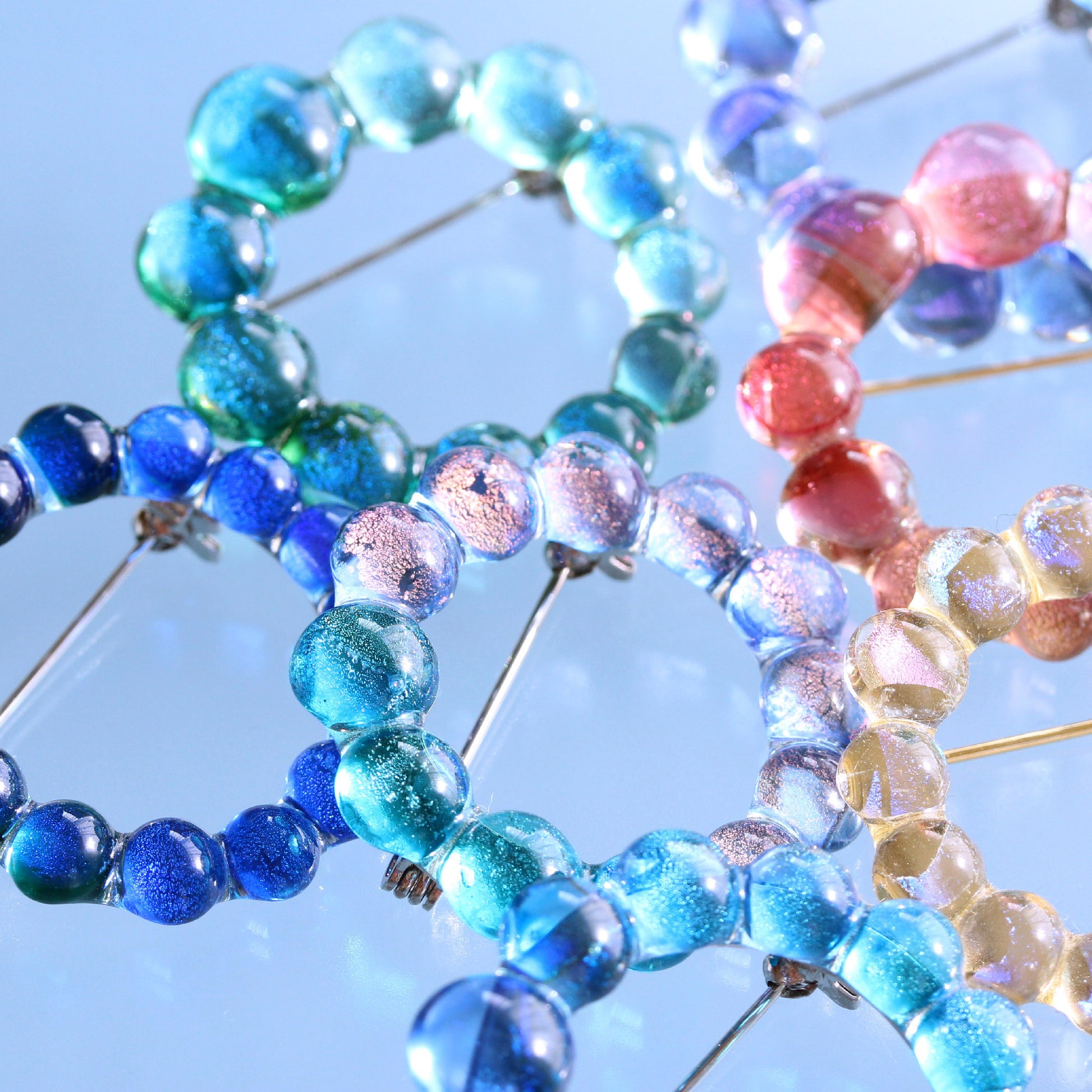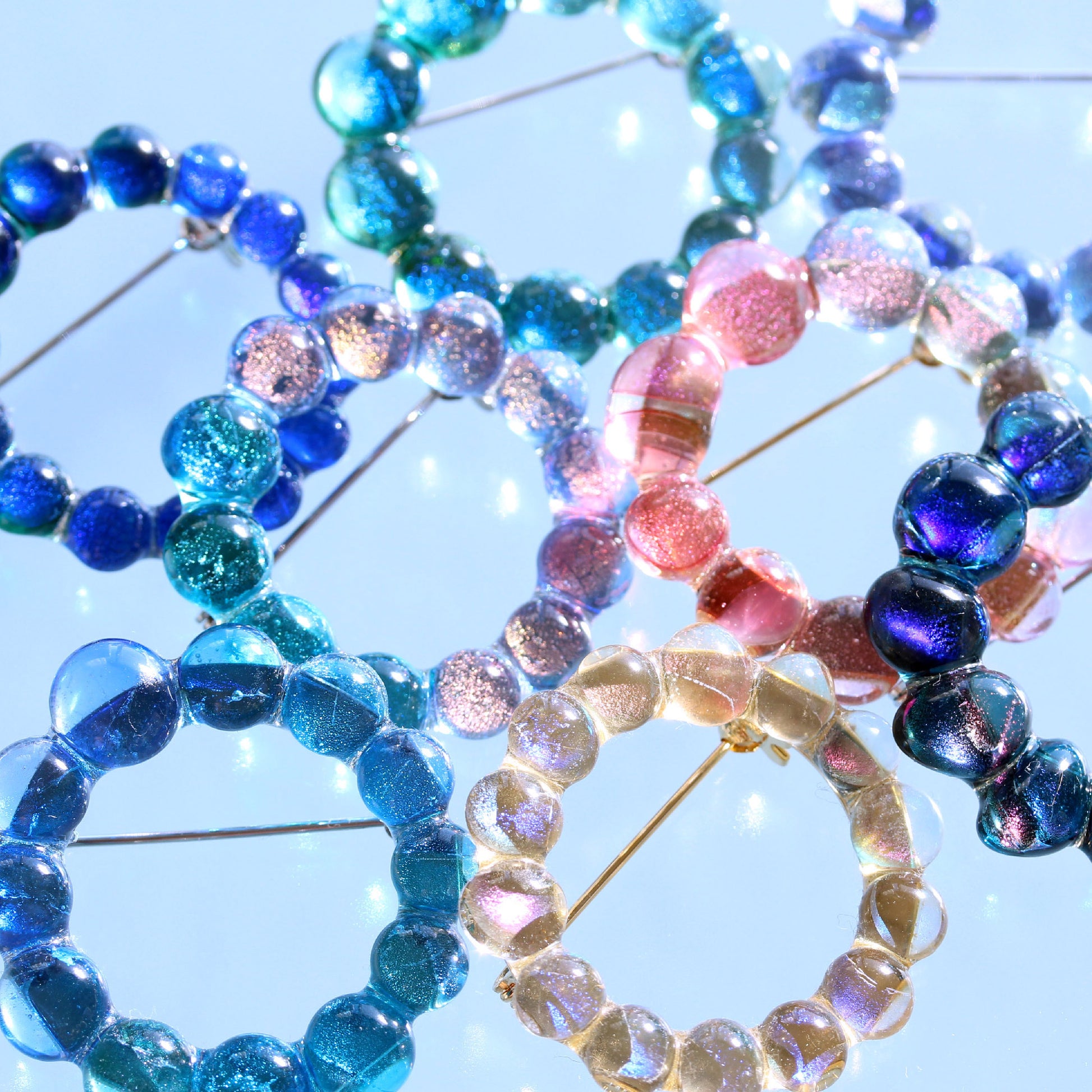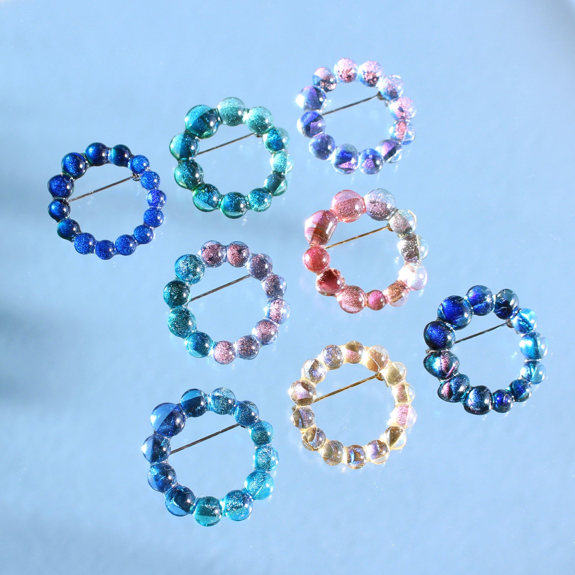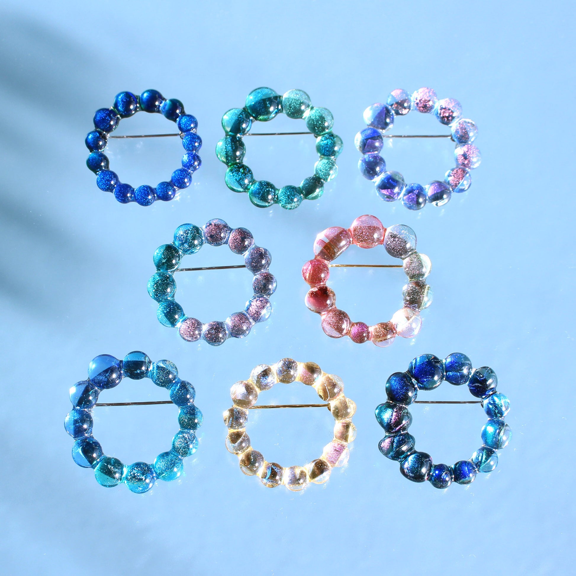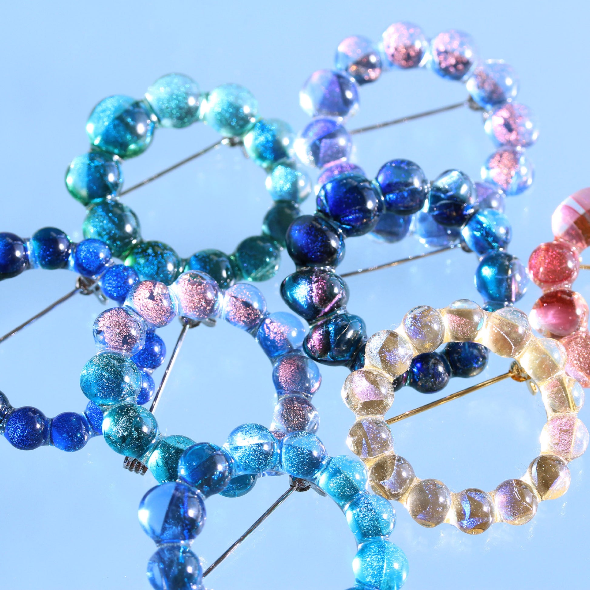 色硝子を重ねて窯の中で800℃に熱して溶かした硝子を一つ一つ丁寧に磨きあげ、台座に接着しレジンで補強しております。小さな小さな粒ですがその中には銀河のような煌めきが広がっており、まるで宇宙のようです。