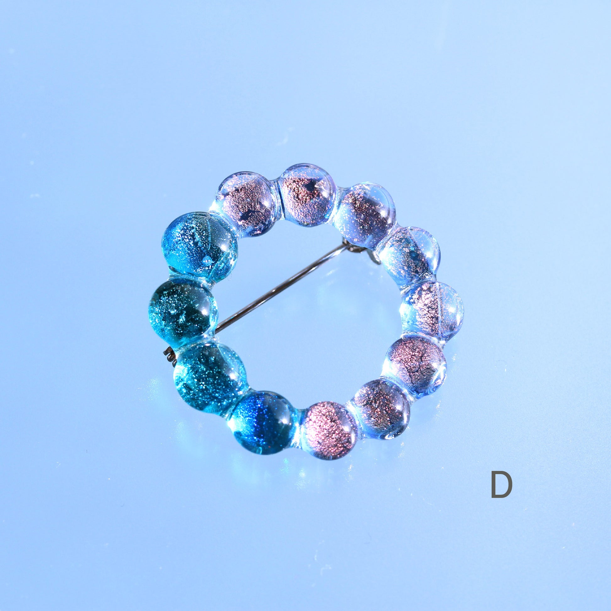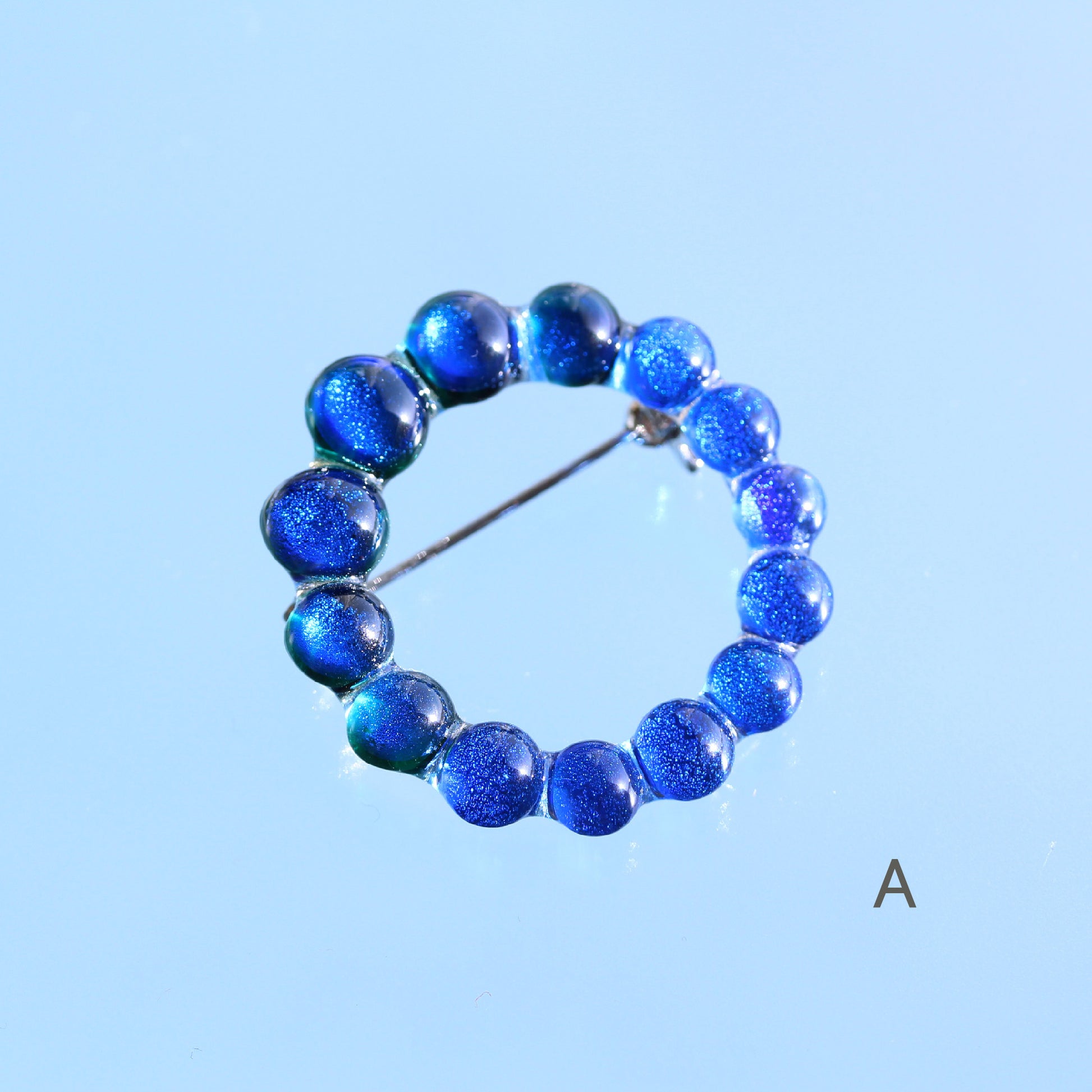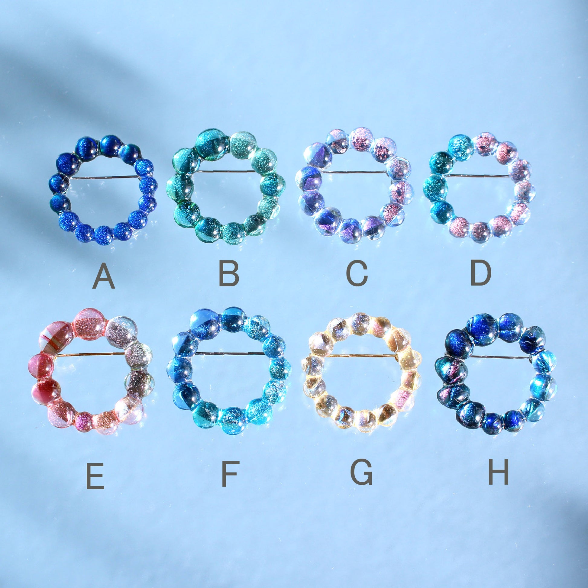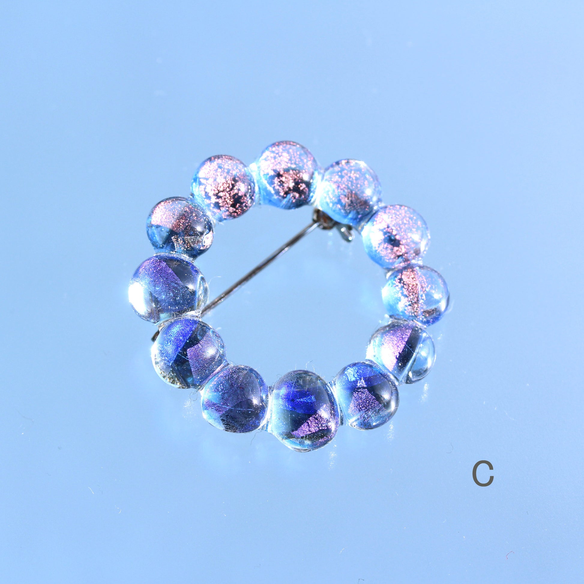 色硝子を重ねて窯の中で800℃に熱して溶かした硝子を一つ一つ丁寧に磨きあげ、台座に接着しレジンで補強しております。小さな小さな粒ですがその中には銀河のような煌めきが広がっており、まるで宇宙のようです。