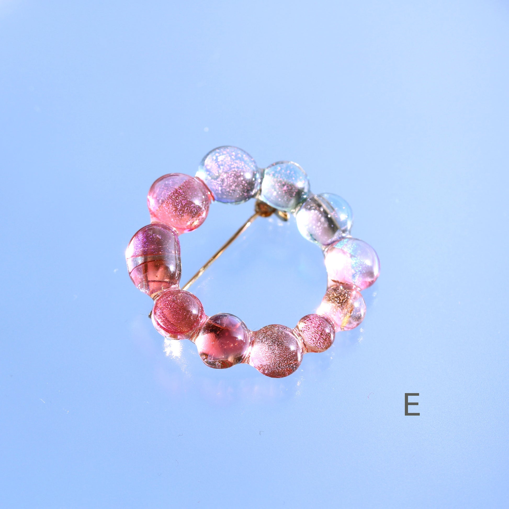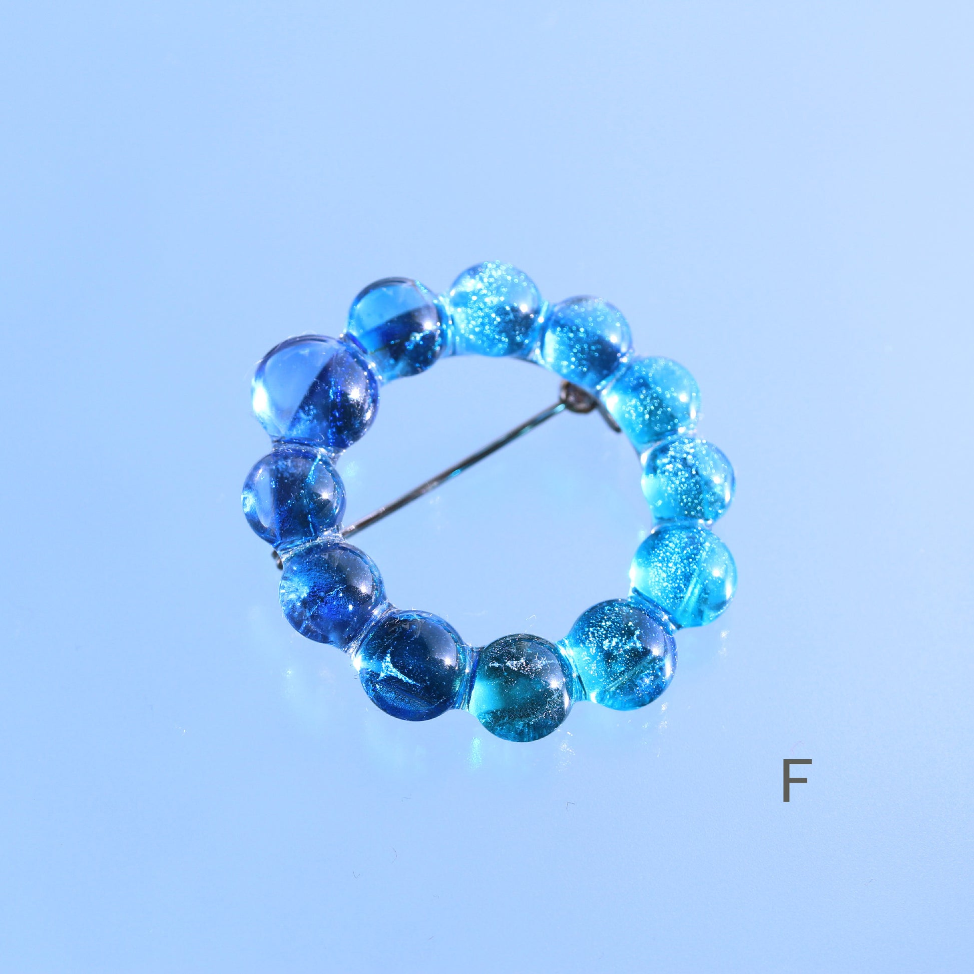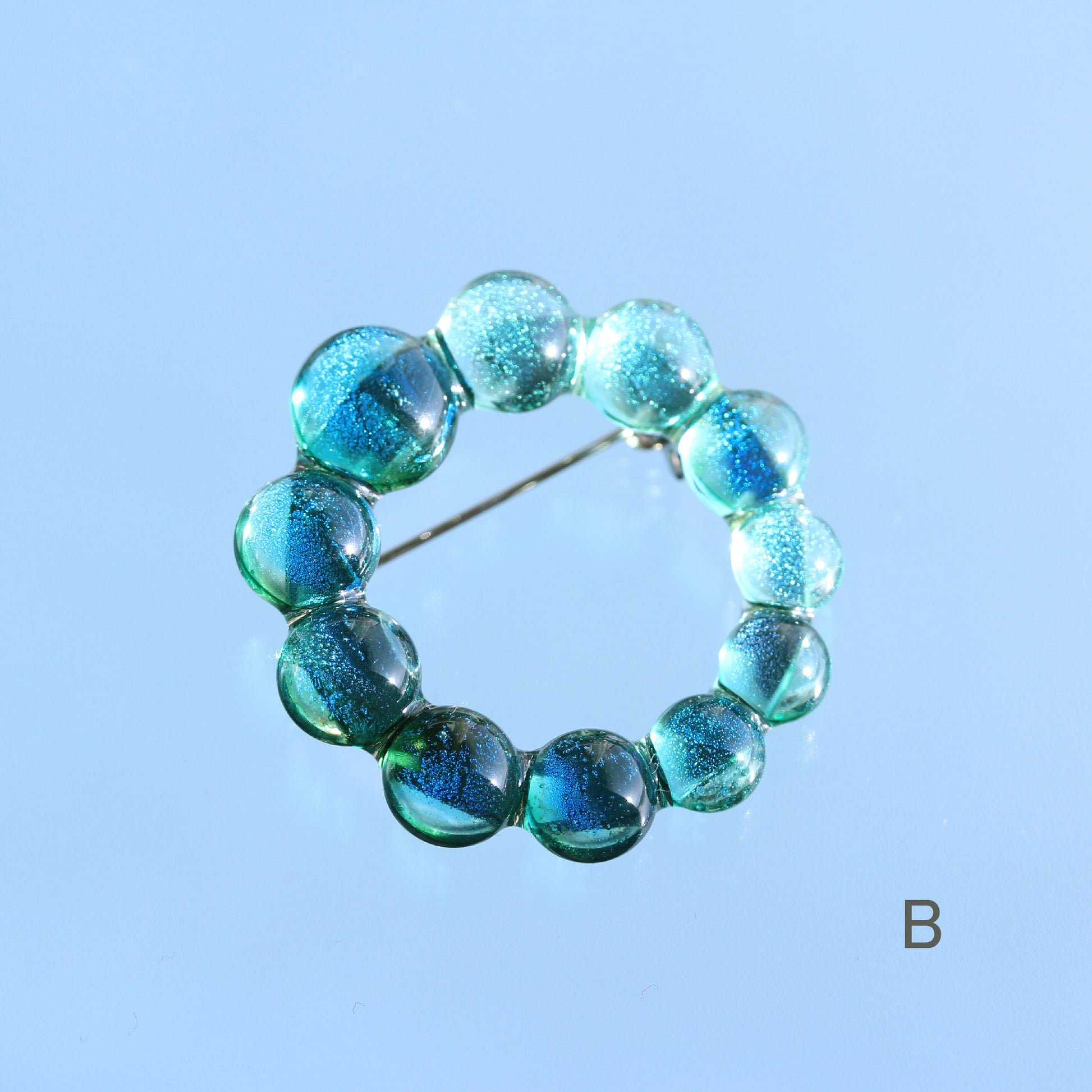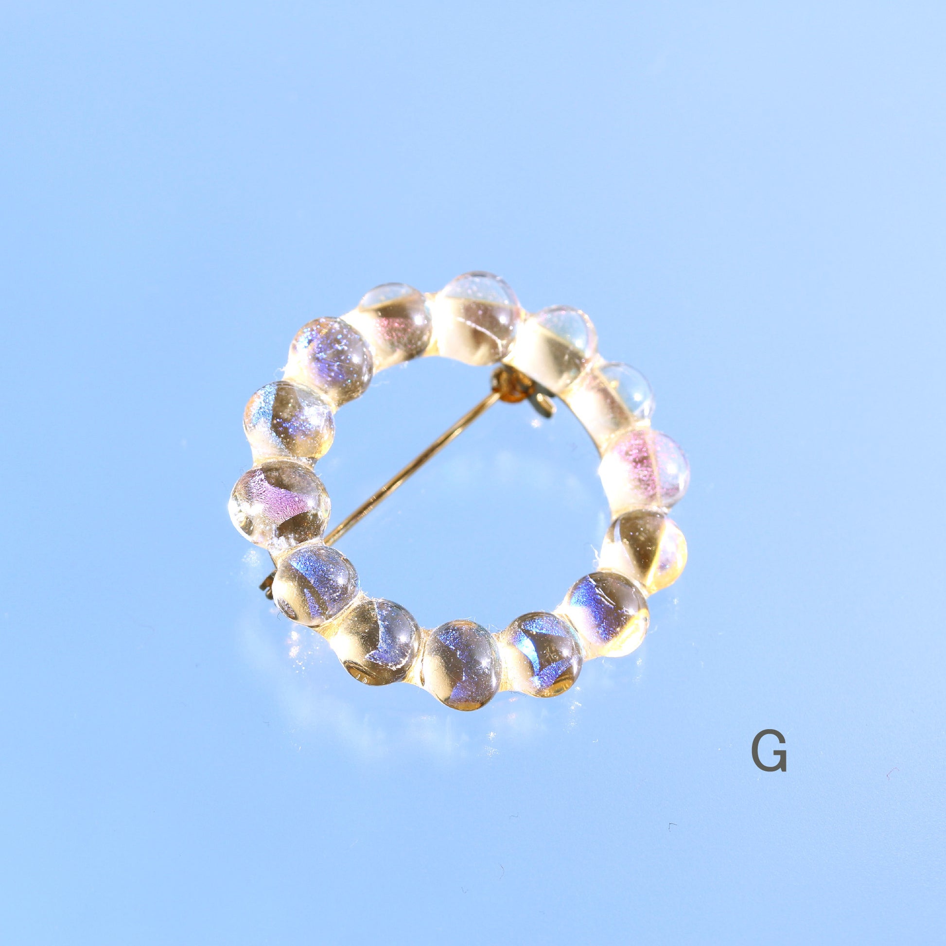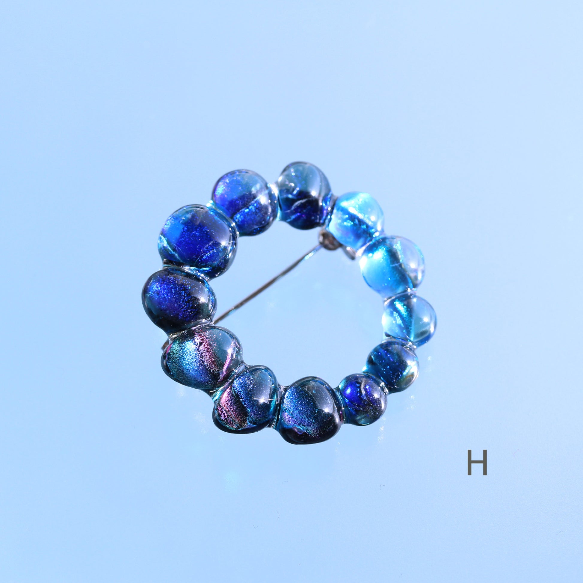 色硝子を重ねて窯の中で800℃に熱して溶かした硝子を一つ一つ丁寧に磨きあげ、台座に接着しレジンで補強しております。小さな小さな粒ですがその中には銀河のような煌めきが広がっており、まるで宇宙のようです。