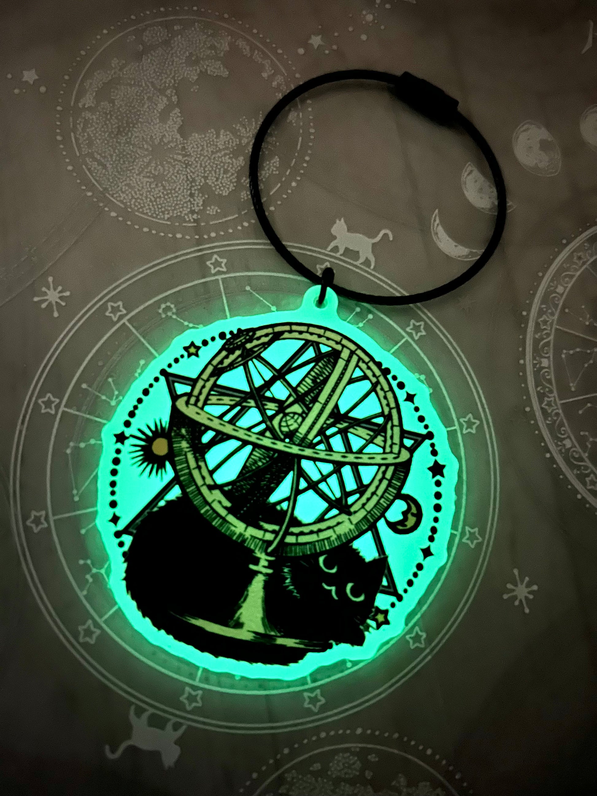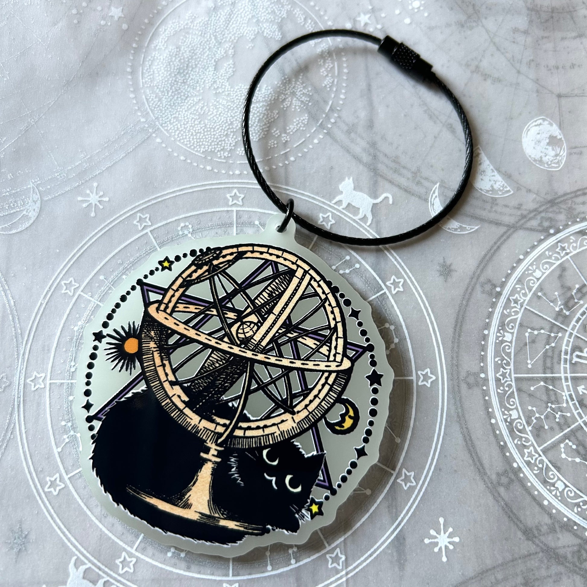 錬金術師の飼い猫である黒猫と、天球儀、後ろに隠れる六芒星、太陽と月。