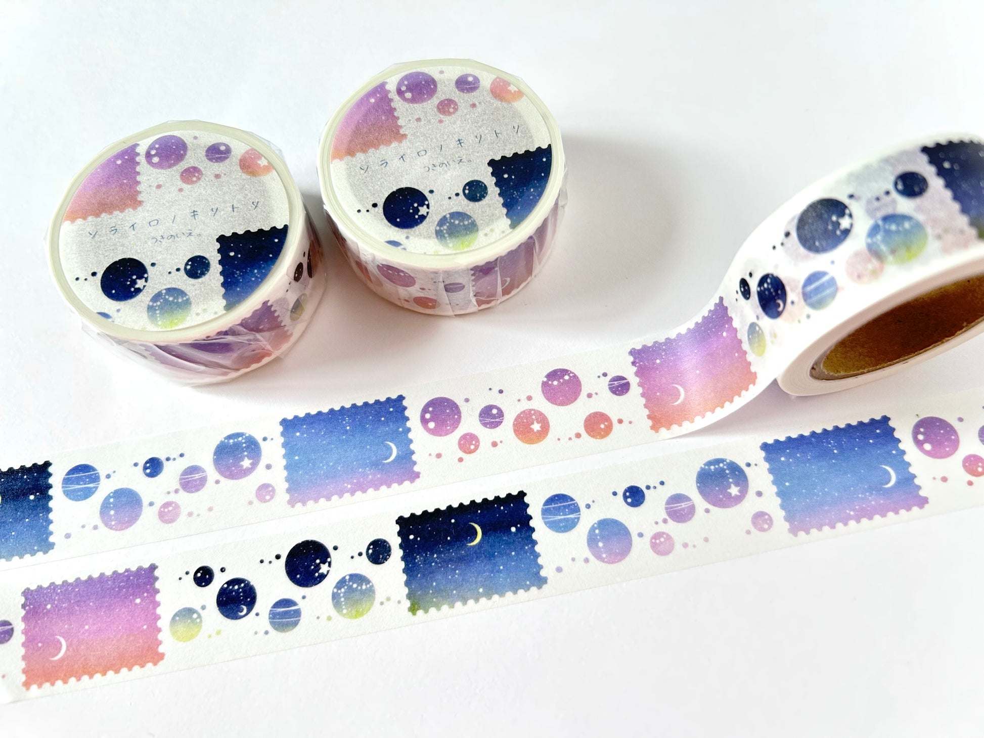 夜が明ける薄明の空へと変化する場面を切手風に切り取っています。