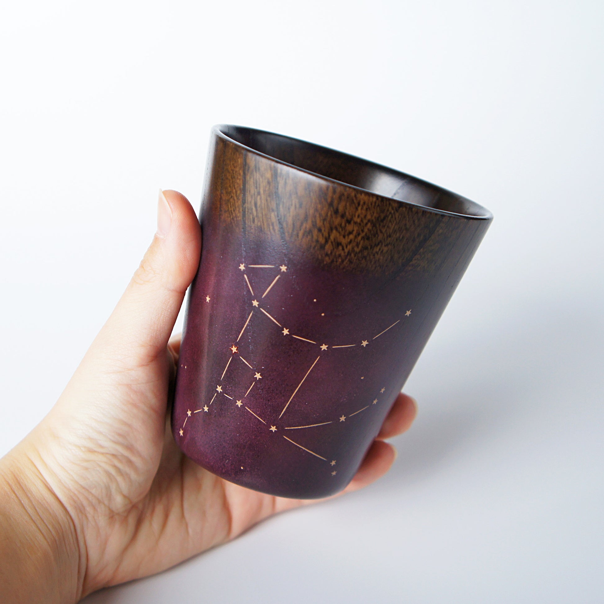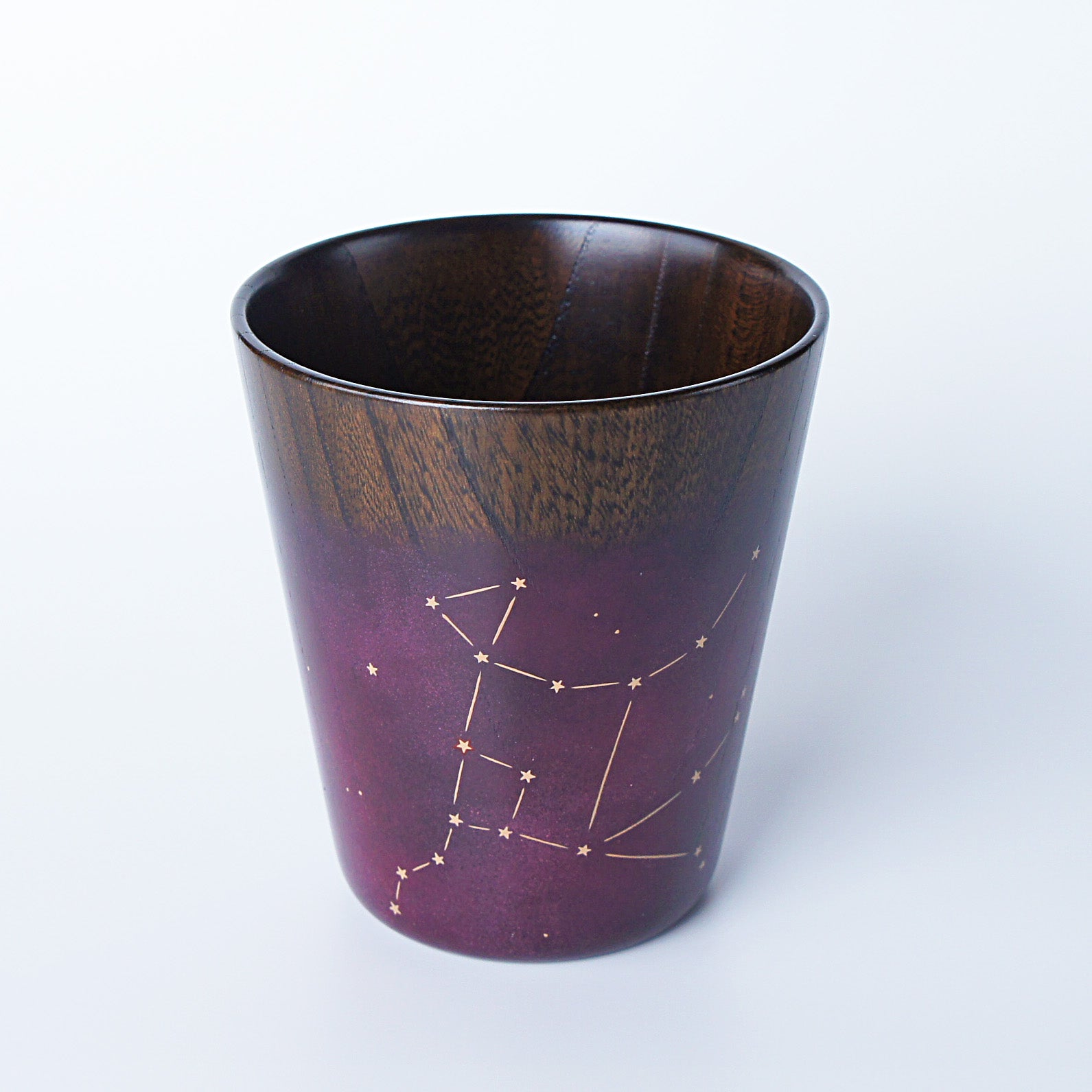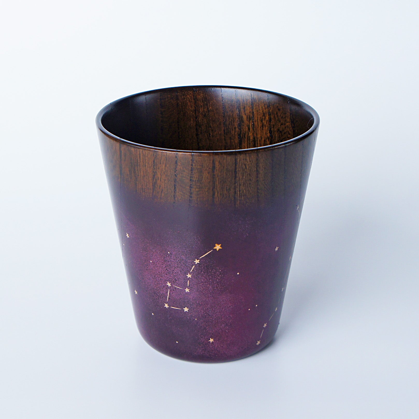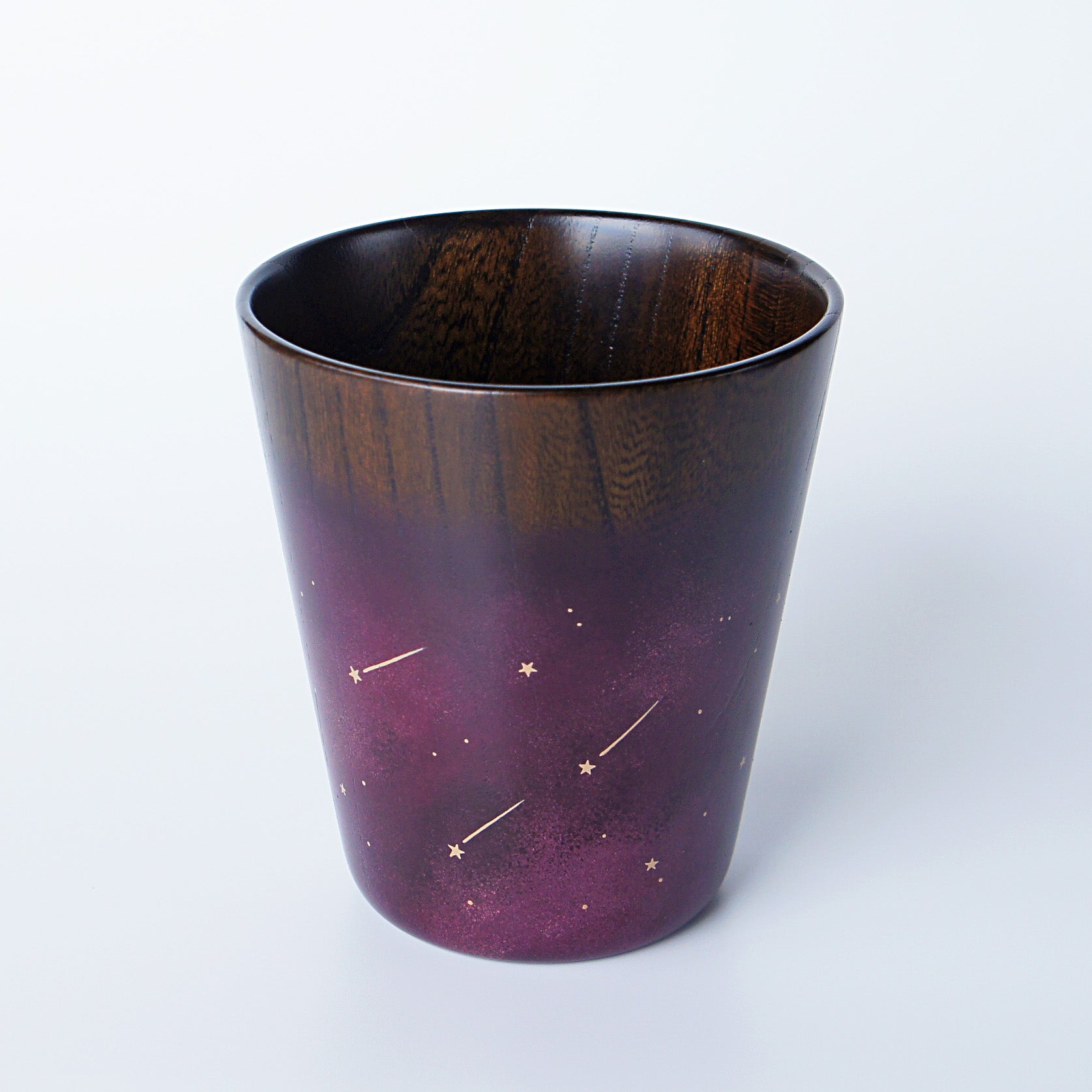 ケヤキのカップに黒い漆を何度も薄く塗り重ね、アンティークのような深いダークブラウンに仕上げ、その上に紫の漆をぼかすことで幻想的な春の夜を表現しました。