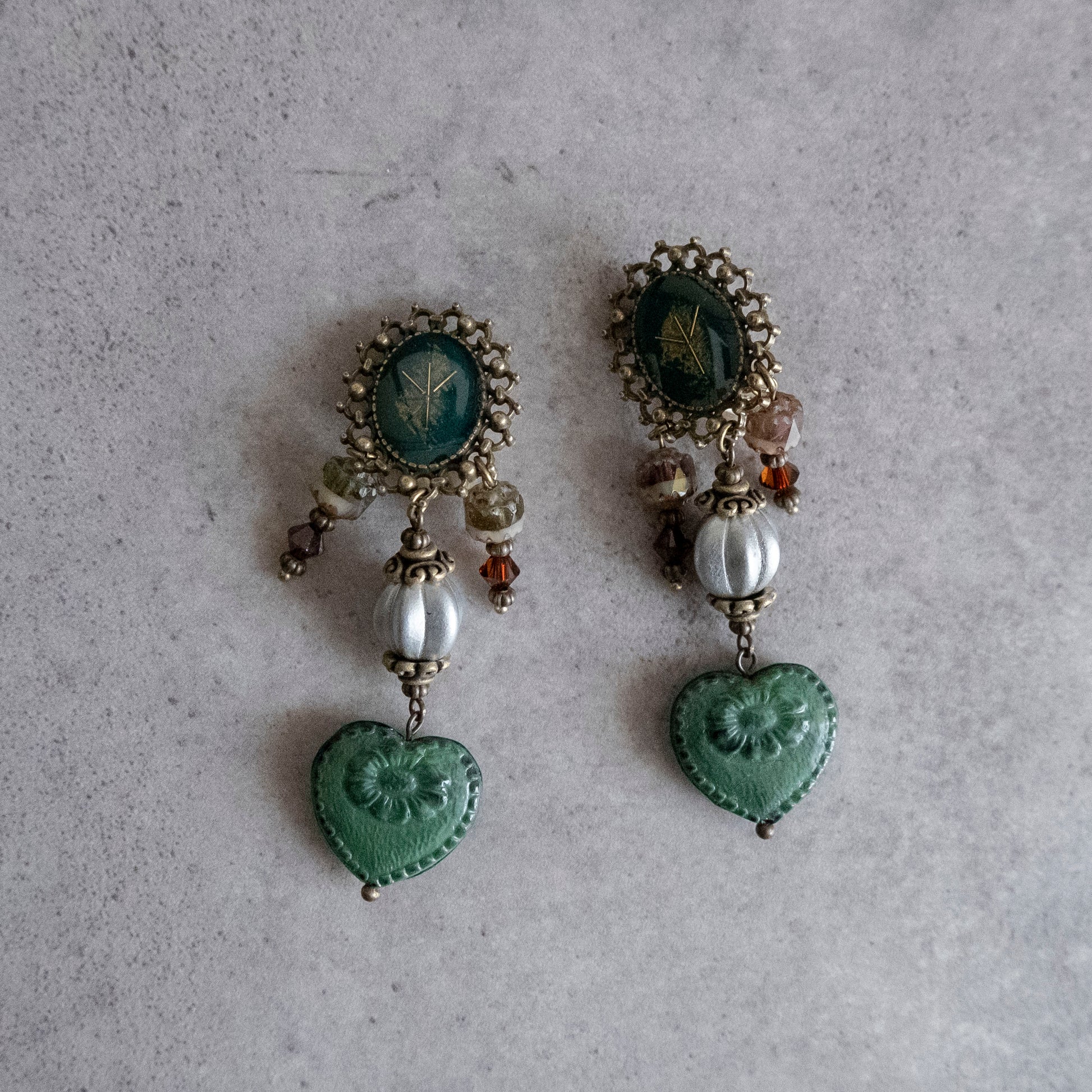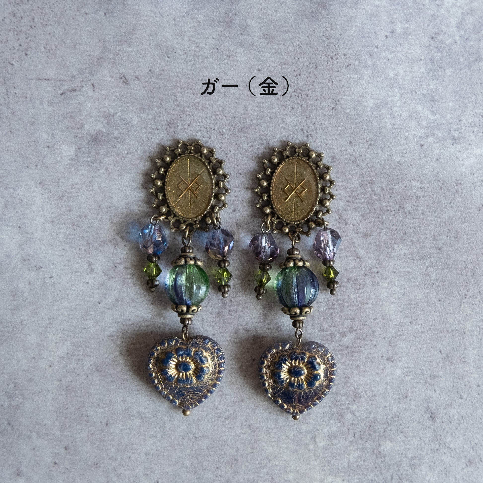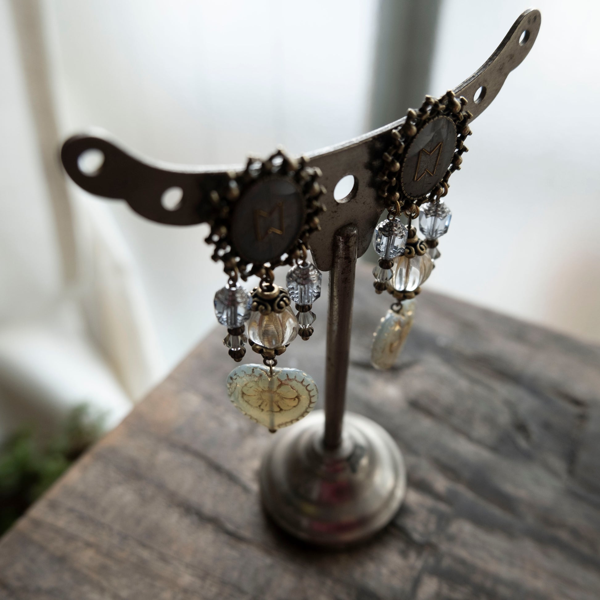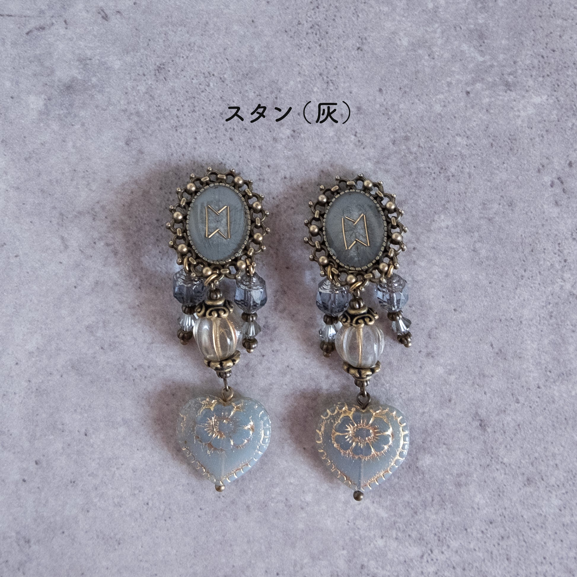ルーン文字を描いたオリジナルパーツを使った耳飾り。